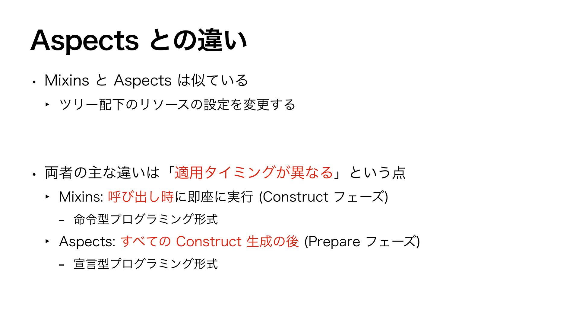 "TQFDUTͱͷҧ͍ w .JYJOTͱ"TQFDUTࣅ͍ͯΔ ‣ πϦʔԼͷϦιʔεͷઃఆΛมߋ͢Δ w ྆ऀͷओͳҧ͍ʮద༻λΠϛϯά͕ҟͳΔʯͱ͍͏ ‣ .JYJOTݺͼग़࣌͠ʹଈ࠲ʹ࣮ߦ $POTUSVDUϑΣʔζ