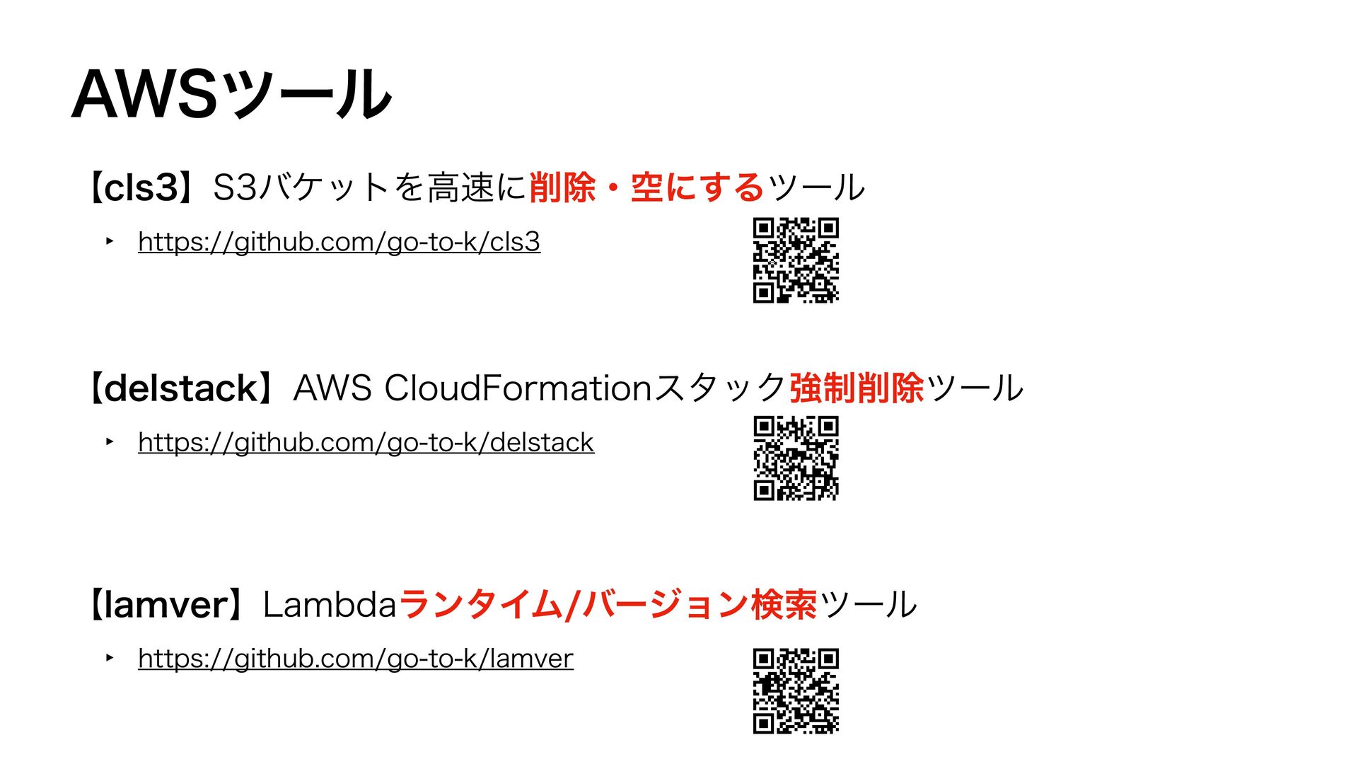 "84πʔϧ ʲDMTʳ4όέοτΛߴʹআɾۭʹ͢Δπʔϧ ‣ IUUQTHJUIVCDPNHPUPLDMT ʲEFMTUBDLʳ"84$MPVE'PSNBUJPOελοΫڧ੍আπʔϧ ‣ IUUQTHJUIVCDPNHPUPLEFMTUBDL ʲMBNWFSʳ-BNCEBϥϯλΠϜόʔδϣϯݕࡧπʔϧ ‣ IUUQTHJUIVCDPNHPUPLMBNWFS