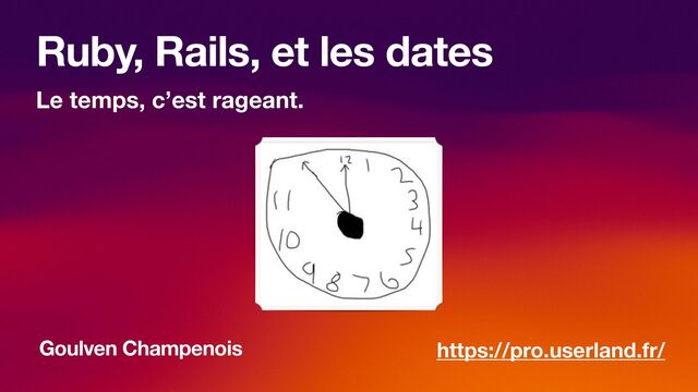 Ayant été victime d'un bug lié à l'heure d'été, j'ai commencé à creuser le sujet. Cette présentation de 20 minutes couvre les bases de la gestion du temps en informatique, avec des exemples de code en Ruby et Rails. Et des memes, on ne se refait pas !