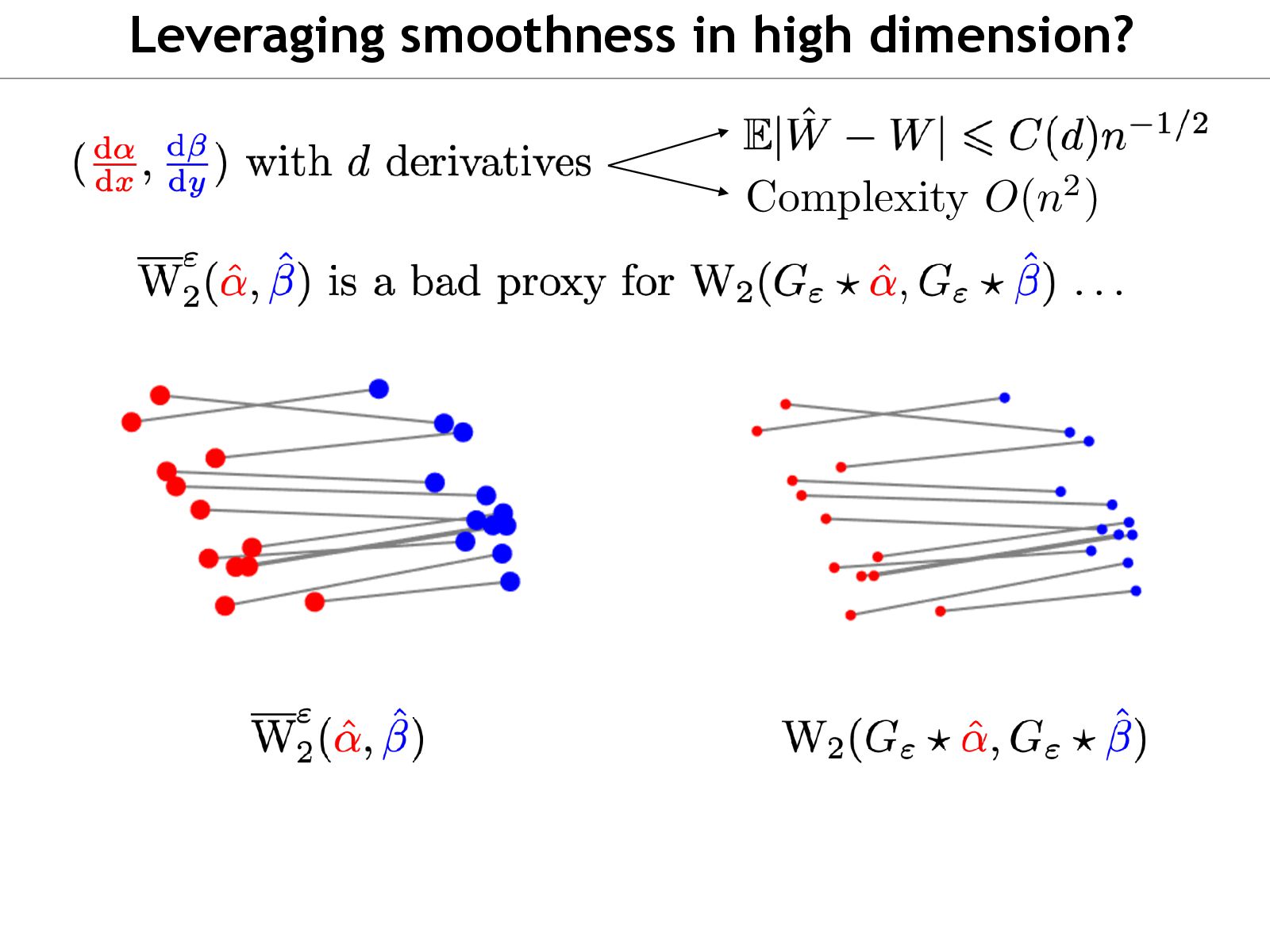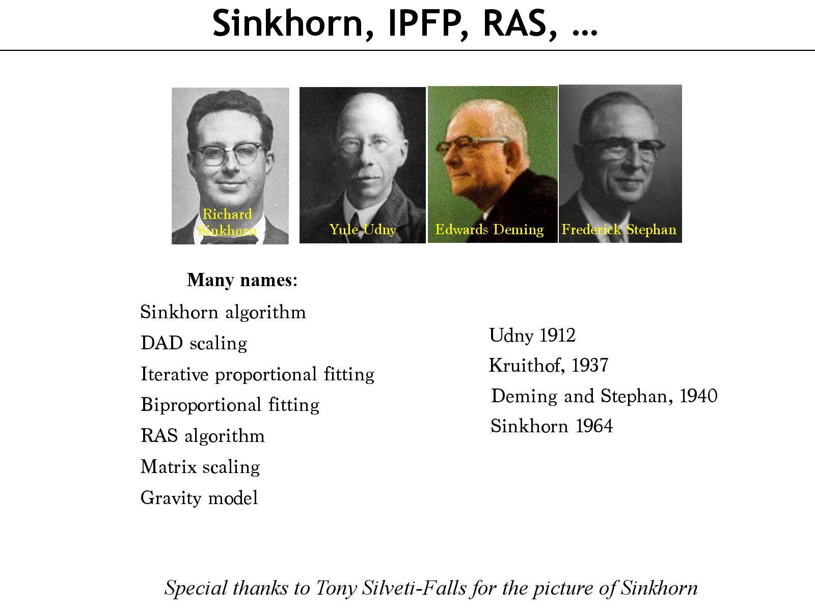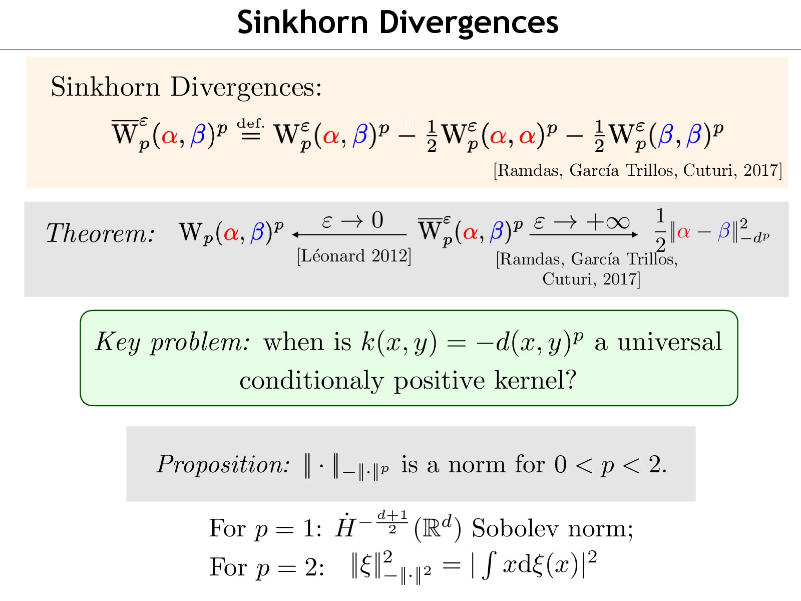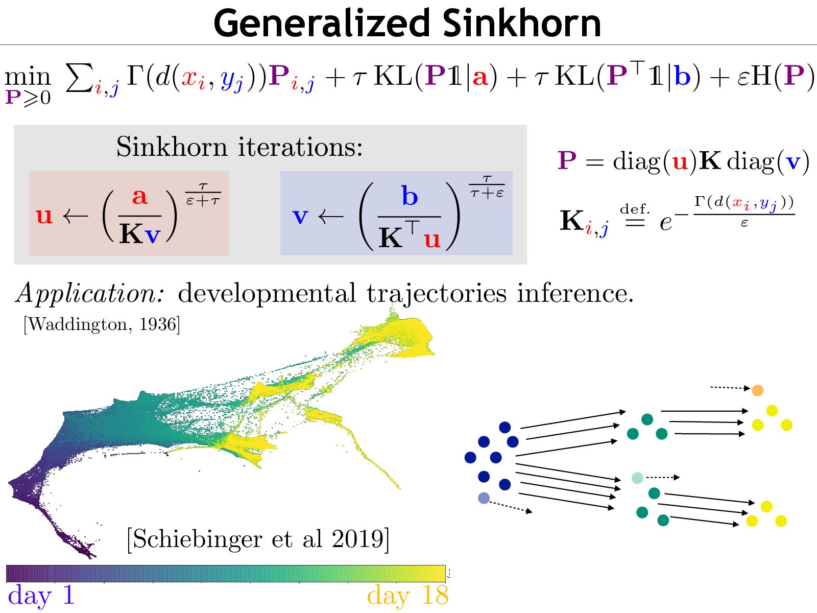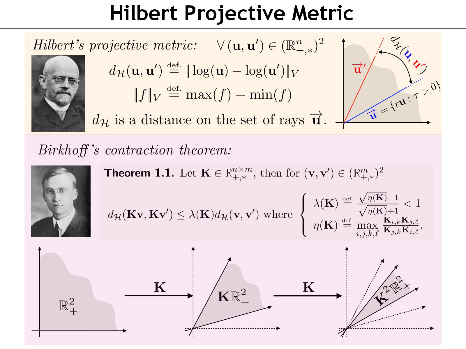 Evolution of K¸ 3 æ {pı} the invariant probability distribution of K€13 = 13. Theorem 4.2. One has (u ( ¸ ) , v ( ¸ ) ) æ (uı, vı) and d H (u ( ¸ ) , uı) = O(⁄(K)2 ¸), d H (v ( ¸ ) , vı) = O(⁄(K)2 ¸). One also has d H (u ( ¸ ) , uı) Æ d H (P ( ¸ ) 1 m , a) 1 ≠ ⁄(K)2 d H (v ( ¸ ) , vı) Æ d H (P ( ¸ ) ,€1 n , b) 1 ≠ ⁄(K)2 ( ¸ ) def. ( ¸ ) ( ¸ ) p 3 K 3 K 2 3 {K¸ 3} Figure 4.8: Evolution of K¸ 3 æ {pı} the invariant probability distribution of K œ K€13 = 13. Theorem 4.2. One has (u ( ¸ ) , v ( ¸ ) ) æ (uı, vı) and d H (u ( ¸ ) , uı) = O(⁄(K)2 ¸), d H (v ( ¸ ) , vı) = O(⁄(K)2 ¸). One also has d H (u ( ¸ ) , uı) Æ d H (P ( ¸ ) 1 m , a) 1 ≠ ⁄(K)2 d H (v ( ¸ ) , vı) Æ d H (P ( ¸ ) ,€1 n , b) 1 ≠ ⁄(K)2 where we denoted P ( ¸ ) def. = diag(u ( ¸ ) )K diag(v ( ¸ ) ). Lastly, one has K 3 K 2 3 {K¸ 3}¸ tion of K¸ 3 æ {pı} the invariant probability distribution of K œ R3 ◊ 3 + ,ú with One has (u ( ¸ ) , v ( ¸ ) ) æ (uı, vı) and H (u ( ¸ ) , uı) = O(⁄(K)2 ¸), d H (v ( ¸ ) , vı) = O(⁄(K)2 ¸). (4.22) d H (u ( ¸ ) , uı) Æ d H (P ( ¸ ) 1 m , a) 1 ≠ ⁄(K)2 d H (v ( ¸ ) , vı) Æ d H (P ( ¸ ) ,€1 n , b) 1 ≠ ⁄(K)2 (4.23) ed P ( ¸ ) def. = diag(u ( ¸ ) )K diag(v ( ¸ ) ). Lastly, one has 3 K 3 K 2 3 Figure 4.8: Evolution of K¸ 3 æ {pı} the invariant probability distr K€13 = 13. Theorem 4.2. One has (u ( ¸ ) , v ( ¸ ) ) æ (uı, vı) and d H (u ( ¸ ) , uı) = O(⁄(K)2 ¸), d H (v ( ¸ ) , vı) = O(⁄ One also has d H (u ( ¸ ) , uı) Æ d H (P ( ¸ ) 1 m , a) 1 ≠ ⁄(K)2 d H (v ( ¸ ) , vı) Æ d H (P ( ¸ ) ,€1 n , b) 1 ≠ ⁄(K)2 where we denoted P ( ¸ ) def. = diag(u ( ¸ ) )K diag(v ( ¸ ) ). Lastly, one Î log(P ( ¸ ) ) ≠ log(Pı)ÎŒ Æ d H (u ( ¸ ) , uı) + d H (v where Pı is the unique solution of (4.2). igure 4.8: Evolution of K¸ 3 æ {pı} the invariant probability distribution of K œ R K€13 = 13. Theorem 4.2. One has (u ( ¸ ) , v ( ¸ ) ) æ (uı, vı) and d H (u ( ¸ ) , uı) = O(⁄(K)2 ¸), d H (v ( ¸ ) , vı) = O(⁄(K)2 ¸). One also has d H (u ( ¸ ) , uı) Æ d H (P ( ¸ ) 1 m , a) 1 ≠ ⁄(K)2 d H (v ( ¸ ) , vı) Æ d H (P ( ¸ ) ,€1 n , b) 1 ≠ ⁄(K)2 where we denoted P ( ¸ ) def. = diag(u ( ¸ ) )K diag(v ( ¸ ) ). Lastly, one has Î log(P ( ¸ ) ) ≠ log(Pı)ÎŒ Æ d H (u ( ¸ ) , uı) + d H (v ( ¸ ) , vı) where Pı is the unique solution of (4.2). Proof. One notices that for any (v, vÕ) œ (Rm + ,ú )2 , one has Sinkhorn under Hilbert’s Metric Theorem: <latexit sha1_base64="F1qx4BuKdPiz0hT2Pil8dyJYcUM=">AABB0nictVzbchu5EYU3t7Vzs5PHvEyidcqb8iqyslW5bKVqZUmWtaZt2aRs7y5tFy8jivaQQ3NISTZXD6m85hfymnxGviN/kDzlF9IXYIAhMdMYxTFKEgbE6W70AI3uBujuJBlms42Nf1764Fvf/s53v/fh5Svf/8EPf/Tjq9d+8iRL59NefNhLk3T6rNvJ4mQ4jg9nw1kSP5tM486om8RPu6+38fOnJ/E0G6bj1uztJH4+6gzGw6NhrzODppdXr7Vn8RngFq3jOJ3Goz+cv7y6trG+Qf+i1cotXVlT+t9Bei06VG3VV6nqqbkaqViN1QzqieqoDMrX6pbaUBNoe64W0DaF2pA+j9W5ugLYOfSKoUcHWl/D7wE8fa1bx/CMNDNC94BLAj9TQEbqOmBS6DeFOnKL6PM5UcbWMtoLoomyvYW/XU1rBK0zdQytEs70DMXhWGbqSP2OxjCEMU2oBUfX01TmpBWUPHJGNQMKE2jDeh8+n0K9R0ij54gwGY0ddduhz/9FPbEVn3u671z9m6S8DiVSTT36NKfQUSdEP6K3OYfPWJ4EOA+AQqzHiLVT0vWIRj+G/gtofwDlnGpGJ10oC2o9r0RuQ/Eht0XkHhQfck9ENqD4kA0ReQDFhzzQSMROSed+fBOKD98UOT+C4kM+EpGPofiQj0XkEyg+5BMR+RUUH/IrEXkHig95R0Teg+JD3hORLSg+ZEtEHkLxIQ9F5C4UH3JXI8tX6hRKSnSGwqrcgnqRB1qKBFq2RPluk3X0YW8HrOleCVZe1Tvw14/dCdBpXILdDZh3RyVYeebtgY30Y2VbdJd2Ex/2rojdhxngx+6L2C/UqxLsFwEr7XUJVl5rDejnx8rW9z48+bH3RewDqPmx8h71EFr82IcBO8akBHsgYh+pNyXYEKs/LcHKdr8JdsWPlfepFvT3Y0Os6bwEK9vTJ+DB+LHybvUUWv3YpyL2mTorwT4TsV+CdfdjvwzYYd+VYM0ee4V2kAH5IzGs2CpqnXxVYm0C1DoC/yTfWxLyjbvQLmEGOWZAmJGI2MsRe4GIRo5oBMuV5XY0I39X5tLMEc1ARDffm7A2E/v38/5YSwIQOzliZwlR5ZHiuzZjOSHvwrRIyFm+c2EtZExpbr+xFuv5UG15DeJhAcFz+5hm/k2KljCCQk1VUTvO93hGRvRchTil6M2M0vCQcbPcKrioMxHV9aC6IuqtB/VWRM09qLmIOvGgTkSUXfkurh0wA6z+8V0s6IlnAPvI5SUCr2ALdp27sEYjmD8H4AU+ppaH8LdJsbdUqiTDaB73ScxyPC9Y4inUFmoN2m1UuEPxdUIrLAbJuOdDHePjE+Y2FnrNsRU+z3fyKM+YhNMZkjyDnA56ixGtp3p07lHLOXl3XKuHv5uve1Orh98ljZ+TF8+1eviZln52AdlbGtu6ALYJq2mitW/rdWlw/oVpmPoV2nXR4uJbHek5g/TOatLf129m/wLvZZtqrB9br0cjc8aXFcZXh4bVc+bouR4V9J7Y6zW1qPZIxjrutfW6MqS0i461HPap7pvBPn39Zky9Ho0D8Li2KeZeOPW6s3eSj8bW69F4ojjveU6evKnXozGgZ9aHrdejgdmWjo7zbb2uZUcNcOxs63Wt+piywJgD4jnPLdYrmpKfNNfUhuQfVGdrXJ9/dR/DnM2LPEaopmR923I63Xwvq5bI+AsxWLVZTTnQv5g7PliRxkJtivEVyzAr7O+rdOwej5pvgBYjWP18BiDlzBOQ0OQk0HonQPGWGHUVR2ZwmyIOZ8nREqqtW2eit2j5ctao2PaSWqW4zI7W6rFN9jqjuTchn7BBmpX00Ch9w2UUJQ01ChqS6dXR3Tu9Xova3xBxkyXEJJ9pPToR4pO06jjVp/Wmo+Pr+pRnBoXPfOz8xWzzkbY2GPOkZItQliqebj+TR3LbcF+9qWyOmz+L6I2ivTohqzGkE6lMjEJNtpi98QU9W9qHdCaHPJhGD95jpKlMFJ+aYRYd8+kRWVTX3kq8UV8mQ8f1jKyuscfV6IGDHnjQ9WOcbdgxHkCtBTHDITy1AqKcK7muUtL4VH2Sn46m9AarI/qkYCENDbY3ccFCVkXZxwUqp4DG2cBRejiNZToG316hJEf9Pnls7Fq0/Nfp5Nacb3dojpfP5vJMTJ+4bhLXiFYNn+ry0zIHlmDh/WST/NfqUSK/OhzRhkpcXzicWS9jOvGPKYKdkGec0GqTVkext5ufWv7EcDpQ5uwcT7NTspAR2b8I9qeU5mREP+7dAXOCzhYhIRsZYneGuXfj83WG4hyzftxQ8a0GO99ismVz4m/ouqsro7nIEQPvA+dLc9vopEG+YExcp9q627Vdvfsg0t6TcGcJU7Rz5Qbx/5h+mx8zT9ZWZgRqGN9Apm2d732kFLOgjjq0y1fbINPXlfKjXIYXWmq7/1mZPipItkMRF8qDu3UfOPfomXnhLJmS3NlKH95Hq7K5SHmypEcc7RFF8Wz3B3oHRrlv0i65RmuuTbNkALNglkcRpq+URV7mW82rSD2MdvZ/oW51XdQaUoyUzeCyhqT8fkzRmitlArOa5+9rWk1+rU+XelXzGdNcHDlr+Rto/Tn8NnKb5zA63YJVuE1zgCnYJ6sRbolWeoTxul3gZWamoWWfLT87J00vt+Ui8TVbNxtjn9SmckCz5kxnLUz9IjReOTReBeqwRWeNVoum3Viil2Js0dKnlaH86nBr1aA8FynLHplBDQOkdGOpMKp9kaoc4xvUO5HWhkirA6vVPQ1w13wI0r/Wl1f3N/nuHqk75Nv0yAPj+KVPq3RIPpdprY7UmAJy/lTbV3f1t6kFuXfJgiJlvseJK4ZPnXpUznNJf6l3tpTsvLUI5t7Sqe5jbGyb6r9ZQY5oTWS0Lg3iU+oRa/ldOaIli7Tu+BwRZf475FOx31EdM7u97TuJCv6EjTd5VVleHCmMSf9S5m1/JXrdd+LXiGLCufauu0Cr/htGCowxmQS/Z5nRG8Jdjk8S2KPtkv1ctVN8ijd2JFonqRfqjwE2hqNeO9fduWVGbMb2K+iJWrdv3ddD5pcEc5T4XeREr0O72kj7qIul54vR6uhdrvhcpYf5El+rjzn1cSMLG+UVMW31WTAXlqgeF8aEcKk3ijry15O8jsx8OhVK2fQ2lIuZBrYxxxQvSfdAEeHz7m54vbmPhXF0V+h1CetS4xaJEmbjUp0fcC0tZqUur+xD3Hq5cjdKnJ2obKcw1N3dwtpvtpAxWb9ESTkb7u3K3i5EKXIWhin0FN/oLYsPXZqfQcHfkfJFh4ZjSO6wCf7tltpWu+/hNsQbXeeMZkQtaAv6S7F3R4+z2KNaR28c6i79EA7hPIaga0n6Ie2kdWVnyrLkLvVw+qdkBaYqFqW