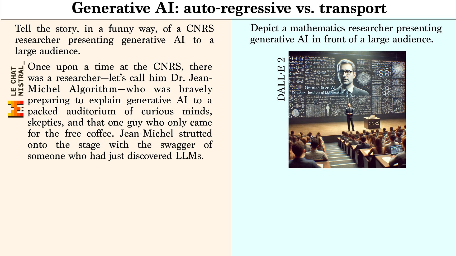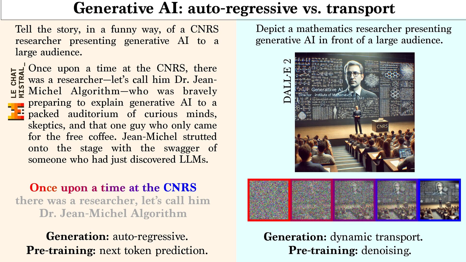 funny way, of a CNRS researcher presenting generative AI to a large audience. Once upon a time at the CNRS, there was a researcher—let’s call him Dr. Jean- Michel Algorithm—who was bravely preparing to explain generative AI to a packed auditorium of curious minds, skeptics, and that one guy who only came for the free coffee. Jean-Michel strutted onto the stage with the swagger of someone who had just discovered LLMs. Depict a mathematics researcher presenting generative AI in front of a large audience. DALL·E 2 Once upon a time at the CNRS there was a researcher, let’s call him Dr. Jean-Michel Algorithm Pre-training: next token prediction. Generation: auto-regressive. Pre-training: denoising. Generation: dynamic transport.