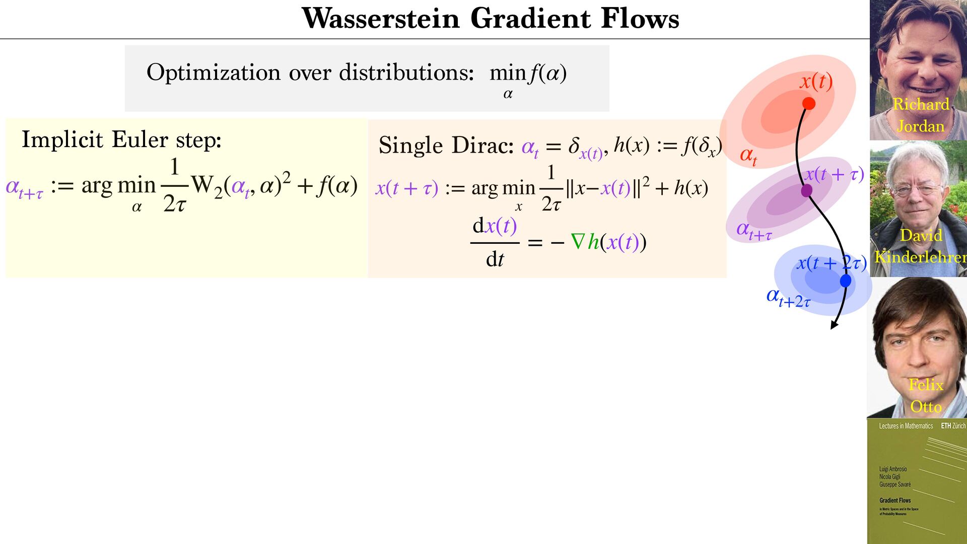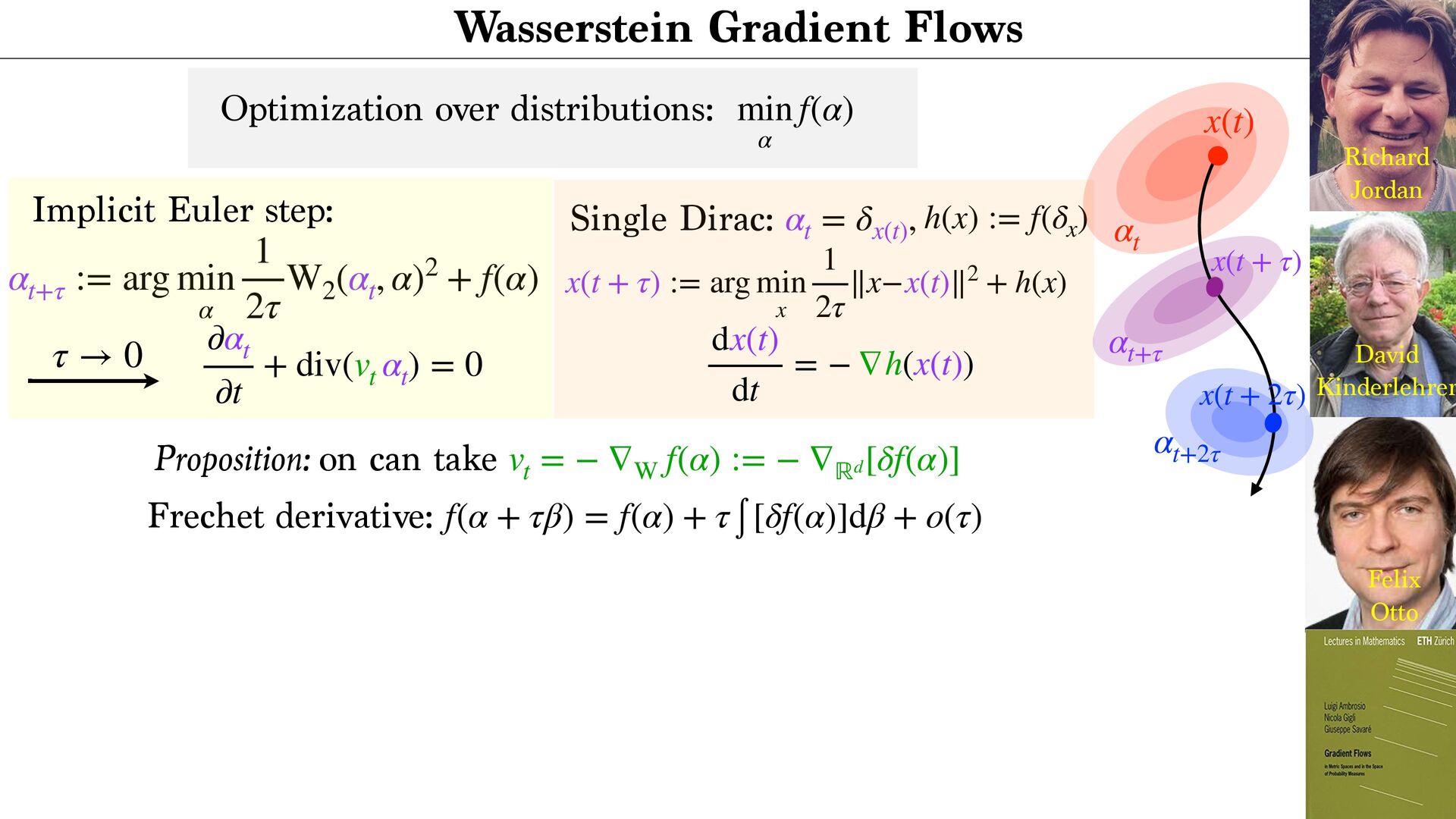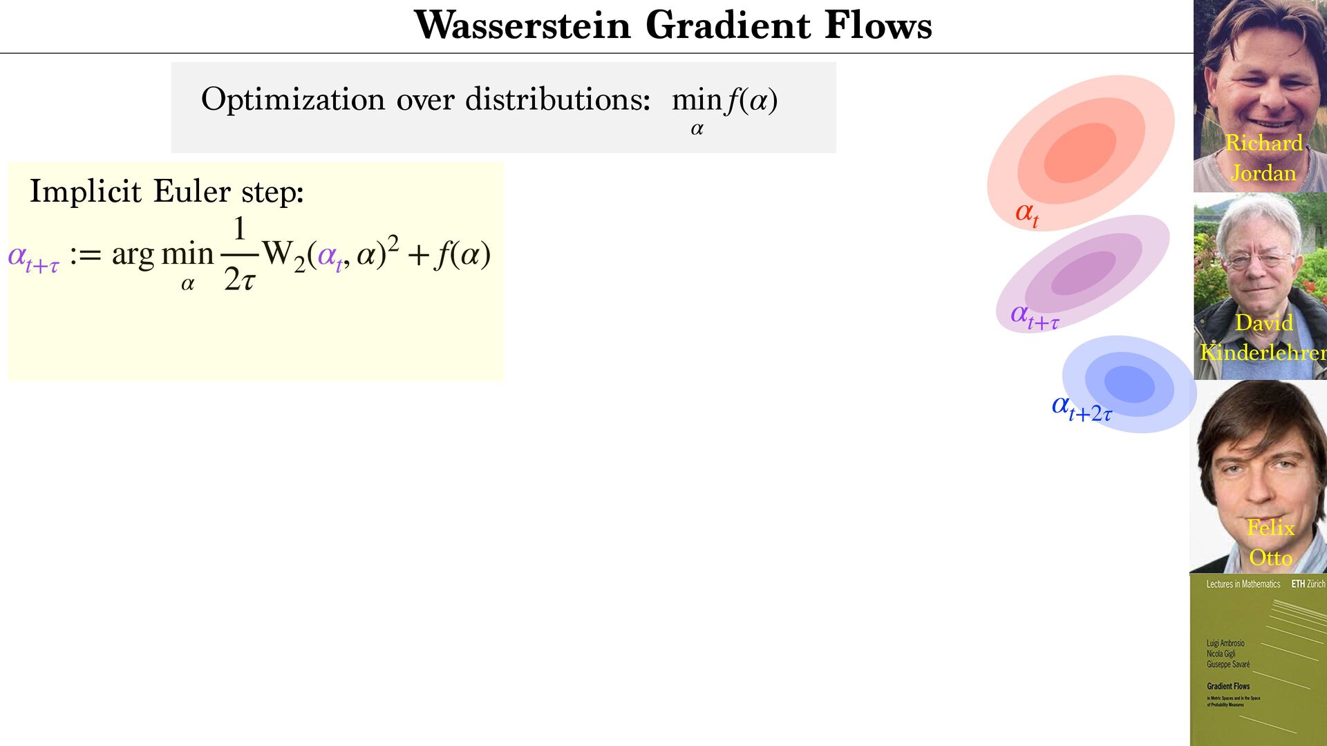 α)2 + f(α) Implicit Euler step: Wasserstein Gradient Flows Felix Otto David Kinderlehrer Richard Jordan αt αt+τ αt+2τ Optimization over distributions: min α f(α)
