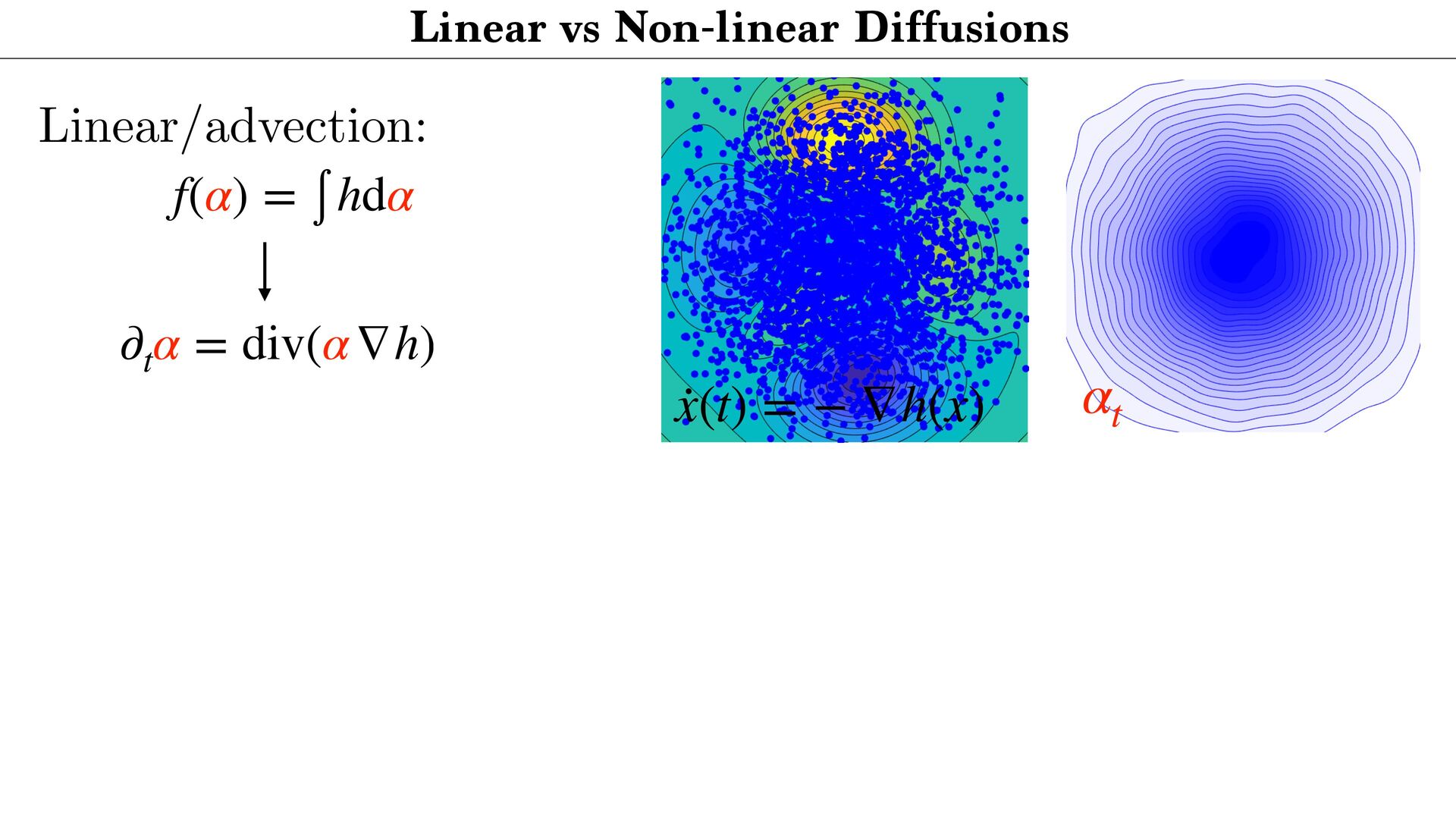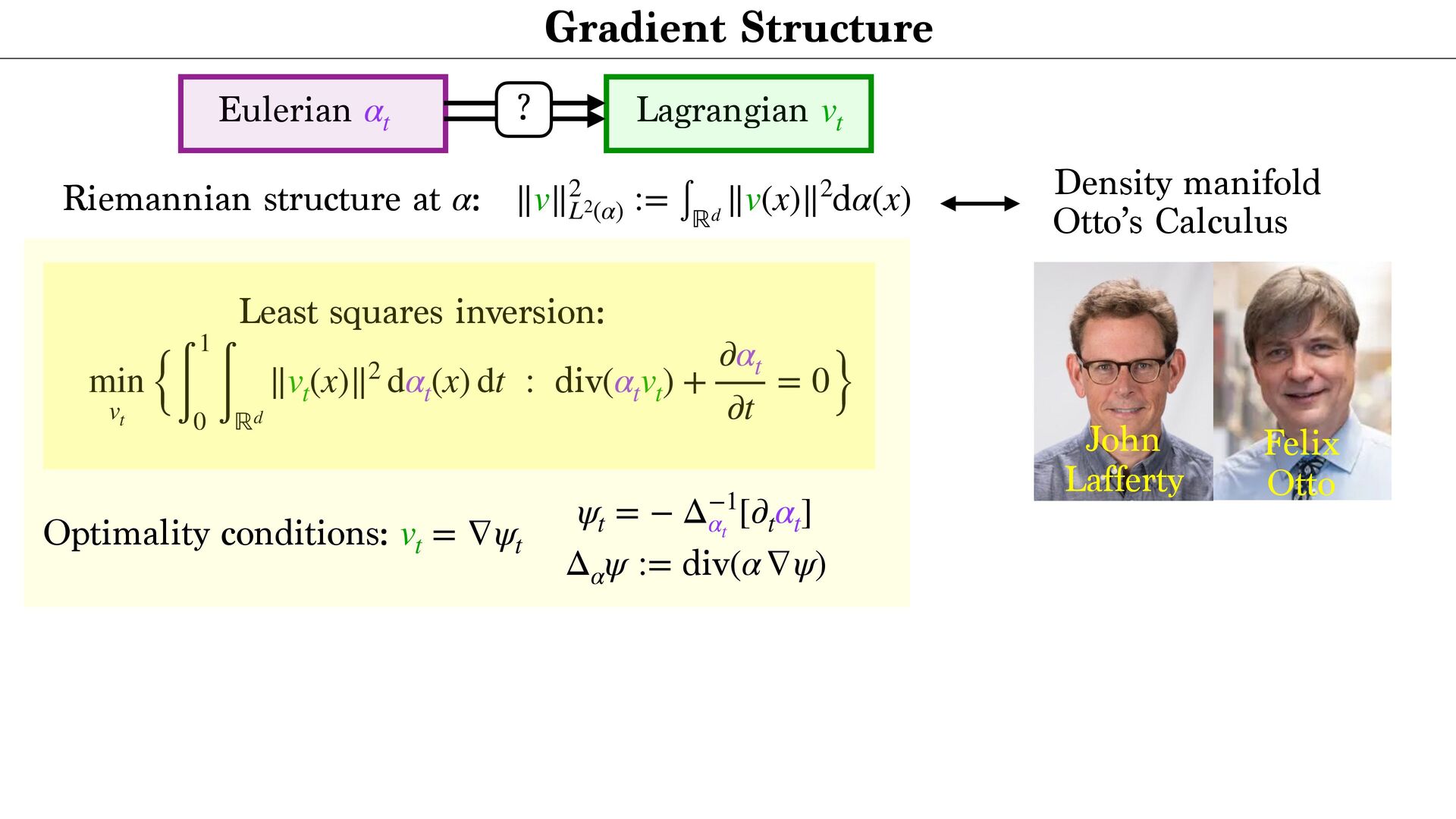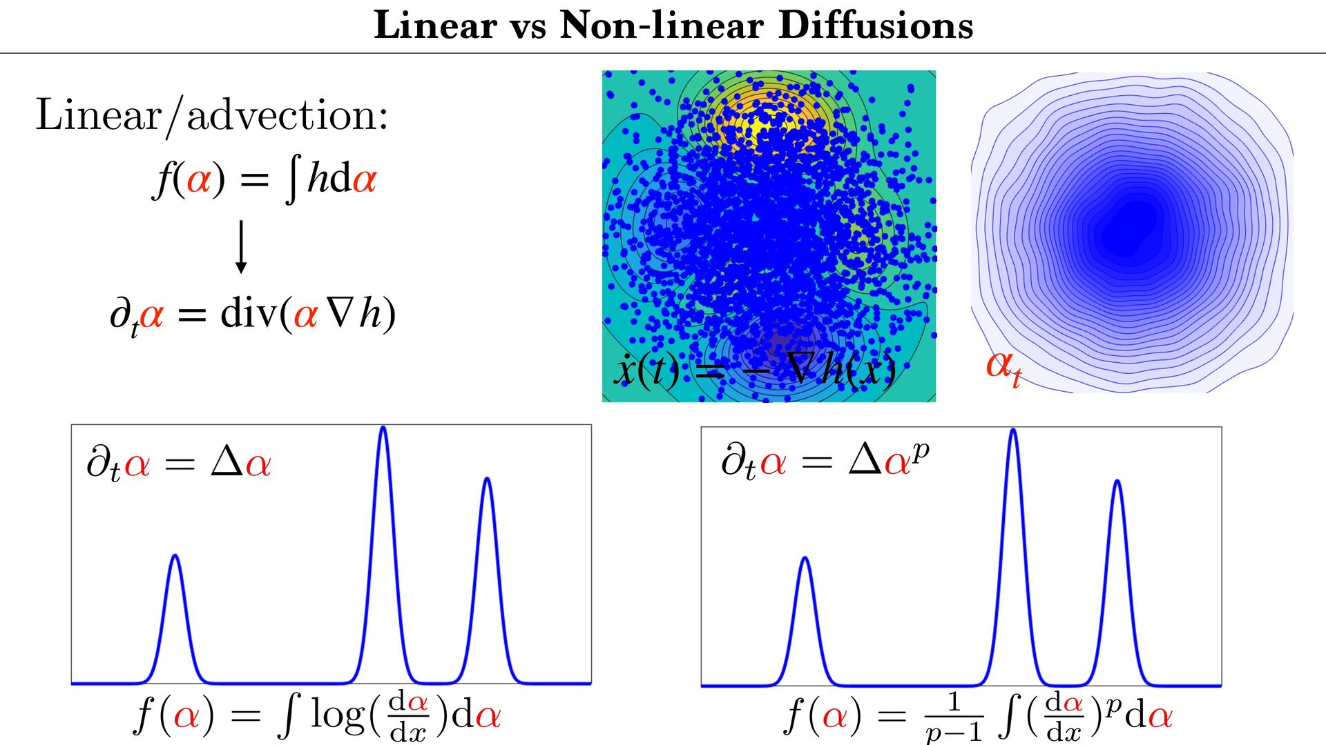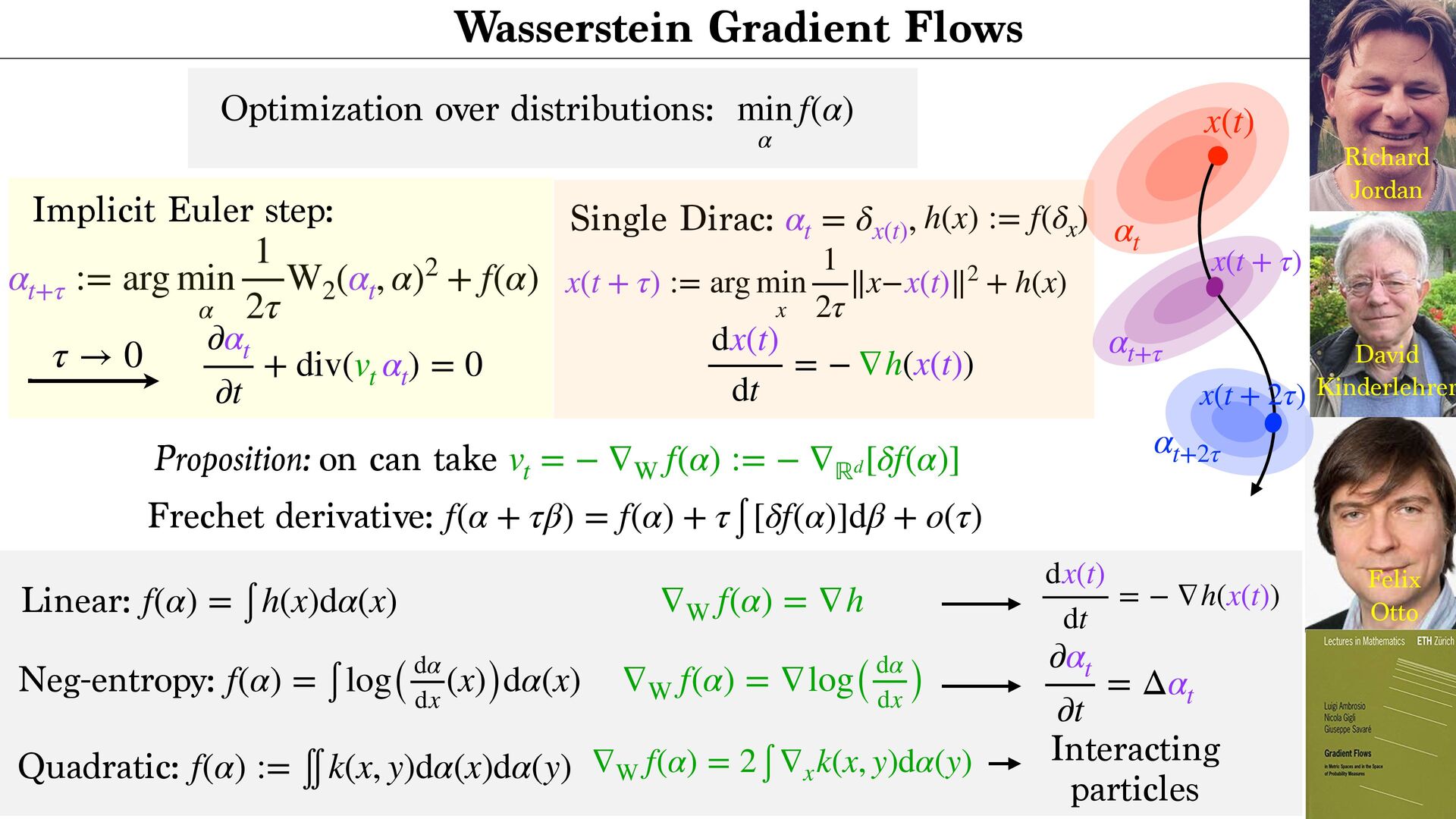 α)2 + f(α) Implicit Euler step: Wasserstein Gradient Flows Felix Otto David Kinderlehrer Richard Jordan αt αt+τ αt+2τ Optimization over distributions: min α f(α)