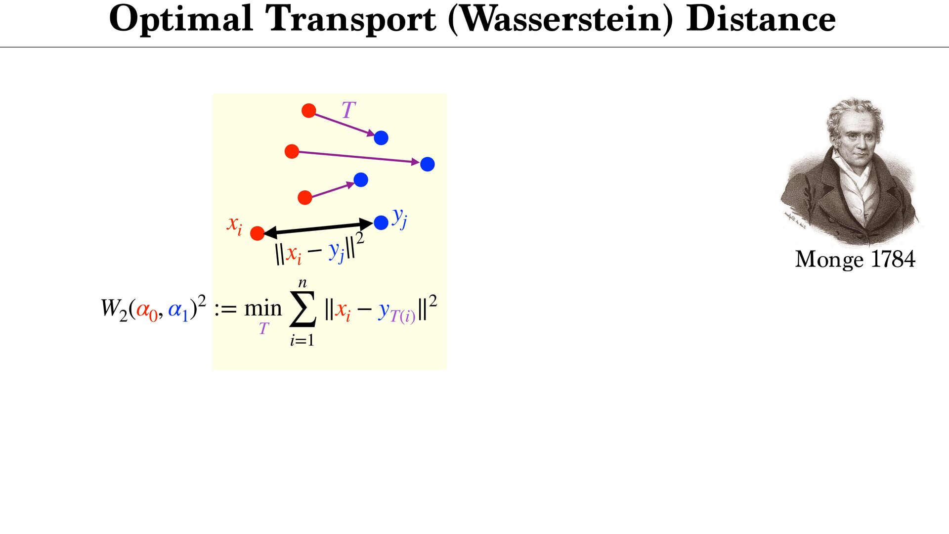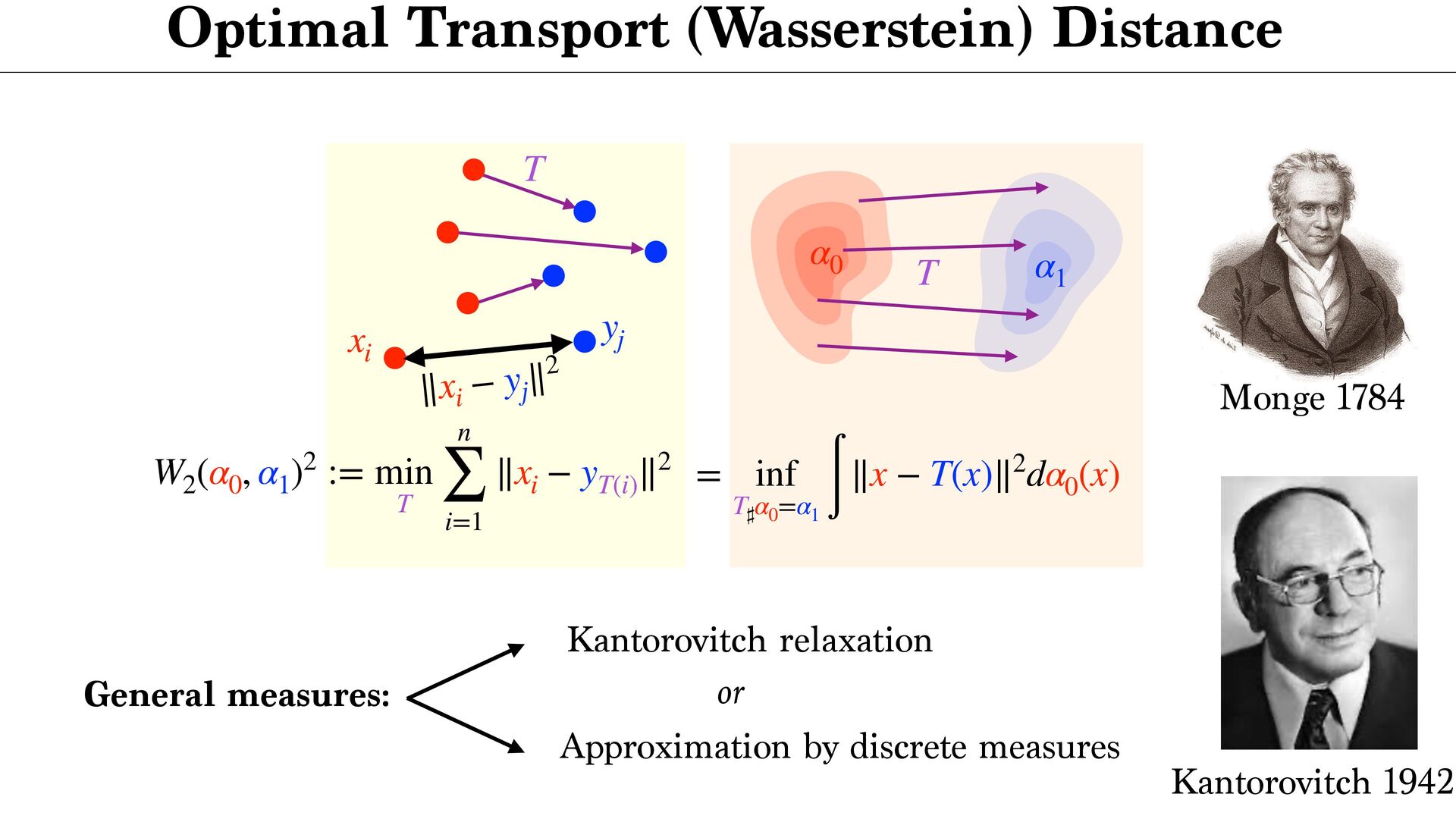 α0 α1 T W2 (α0 , α1 )2 := min T n ∑ i=1 ∥xi − yT(i) ∥2 Optimal Transport (Wasserstein) Distance ∥xi − yj ∥2 xi yj T Monge 1784 General measures: Kantorovitch relaxation Approximation by discrete measures or Kantorovitch 1942