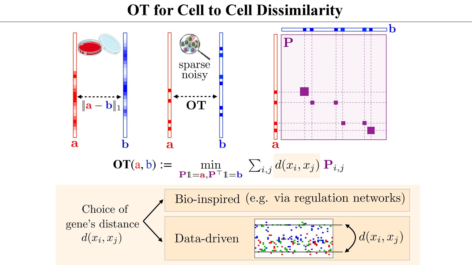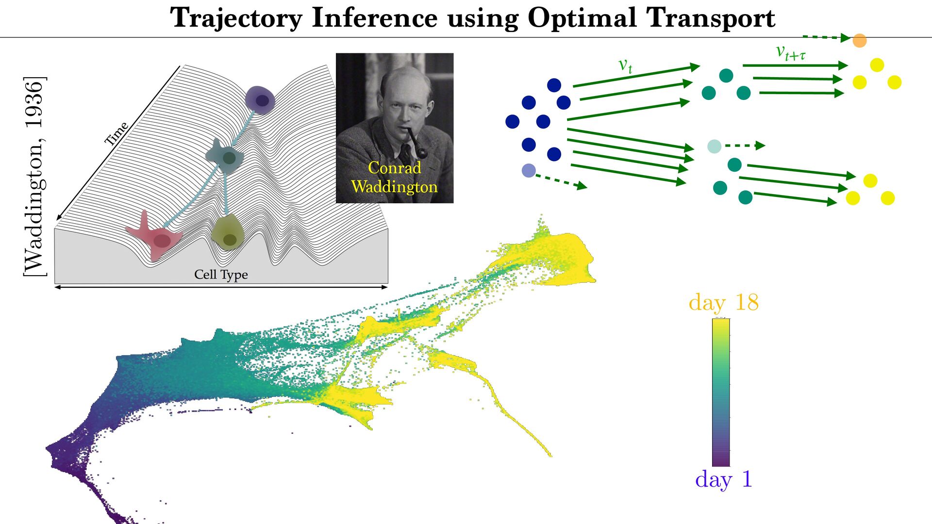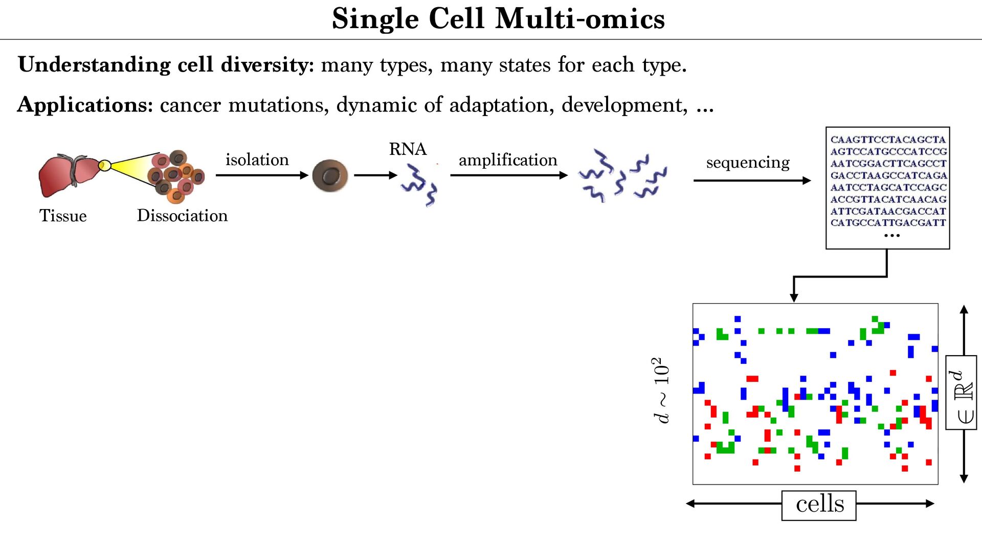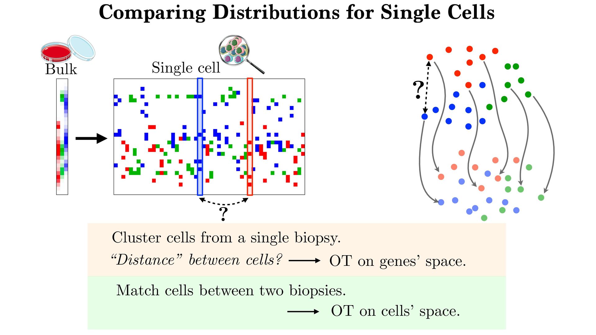 many cells (bulk omics) • Today, we can measure omics at the single cell level1. 2 carelli et al. 2018 2Lähnemann et al. 2020 Single-cell profiling uncovers cellular heterogeneity • Until recently, samples contained many cells (bulk omics) • Today, we can measure omics at the single cell level1. 2 1Mincarelli et al. 2018 2Lähnemann et al. 2020 <latexit sha1_base64="8h9qfn6MXuBvKOcg4p0NkYUZouc=">AAACx3icjVHLTsJAFD3UF+ILdemmkZi4Ii0x6pLgRneYCJIgMe0wwITSNu2USIgLf8Ct/pnxD/QvvDMOiUqMTtP2zLn3nJl7rx8HIpWO85qzFhaXllfyq4W19Y3NreL2TjONsoTxBouCKGn5XsoDEfKGFDLgrTjh3sgP+LU/PFPx6zFPUhGFV3IS887I64eiJ5gnFVXLguFtseSUHb3seeAaUIJZ9aj4ght0EYEhwwgcISThAB5Setpw4SAmroMpcQkhoeMc9yiQNqMsThkesUP69mnXNmxIe+WZajWjUwJ6E1LaOCBNRHkJYXWareOZdlbsb95T7anuNqG/b7xGxEoMiP1LN8v8r07VItHDqa5BUE2xZlR1zLhkuivq5vaXqiQ5xMQp3KV4Qphp5azPttakunbVW0/H33SmYtWemdwM7+qWNGD35zjnQbNSdo/LR5eVUrVmRp3HHvZxSPM8QRXnqKNB3gM84gnP1oUVWWPr7jPVyhnNLr4t6+EDdTmQuA==</latexit> Bulk <latexit sha1_base64="xfWO8cpwoNz5R1B8gV9utdLBqVI=">AAACznicjVHLSsNAFD2Nr1pfVZdugkVwVZIi6rLoxmVF+4BaJJlO69BpEpJJoZTi1h9wq58l/oH+hXfGFNQiOiHJmXPPuTP3Xj+SIlGO85qzFhaXllfyq4W19Y3NreL2TiMJ05jxOgtlGLd8L+FSBLyuhJK8FcXcG/qSN/3BuY43RzxORBhcq3HEO0OvH4ieYJ4iqn0lgr7kNuNS3hZLTtkxy54HbgZKyFYtLL7gBl2EYEgxBEcARVjCQ0JPGy4cRMR1MCEuJiRMnGOKAnlTUnFSeMQO6NunXTtjA9rrnIlxMzpF0huT08YBeULSxYT1abaJpyazZn/LPTE59d3G9PezXENiFe6I/cs3U/7Xp2tR6OHU1CCopsgwujqWZUlNV/TN7S9VKcoQEadxl+IxYWacsz7bxpOY2nVvPRN/M0rN6j3LtCne9S1pwO7Pcc6DRqXsHpePLiul6lk26jz2sI9DmucJqrhADXXT8Uc84dmqWSNrat1/Sq1c5tnFt2U9fACwKpOS</latexit> Single cell <latexit sha1_base64="pydPpuNuJAJzk3J9ohxA5exGGlo=">AAACyHicjVHLSsNAFD2Nr1pfVZdugkVwVZIi6s6iG3FVwbSFtkgyndaheZFMlFLc+ANu9cvEP9C/8M6YglpEJyQ5c+49Z+be68W+SKVlvRaMufmFxaXicmlldW19o7y51UyjLGHcYZEfJW3PTbkvQu5IIX3ejhPuBp7PW97oTMVbtzxJRRReyXHMe4E7DMVAMFcS5XS9gXlyXa5YVUsvcxbYOaggX42o/IIu+ojAkCEARwhJ2IeLlJ4ObFiIiethQlxCSOg4xz1KpM0oi1OGS+yIvkPadXI2pL3yTLWa0Sk+vQkpTeyRJqK8hLA6zdTxTDsr9jfvifZUdxvT38u9AmIlboj9SzfN/K9O1SIxwLGuQVBNsWZUdSx3yXRX1M3NL1VJcoiJU7hP8YQw08ppn02tSXXtqreujr/pTMWqPctzM7yrW9KA7Z/jnAXNWtU+rB5c1ir103zURexgF/s0zyPUcY4GHPIWeMQTno0LIzbujPFnqlHINdv4toyHD4JFkLc=</latexit> ? <latexit sha1_base64="QNHLtJL77Xel7kqDwcr8uqkXoFI=">AAAC6XicjVHLTtwwFD2EUt5tCks2VqdIrKIEocJyBBuWIHUAiSKUGM9gjRNHtoM0GvED7NhVbPkBtvAjVf+g/Yteu0EqINQ6SnJ87j3HvvcWtZLWpemPiWjyzdTb6ZnZufmFxXfv4w9LB1Y3hose10qboyK3QslK9Jx0ShzVRuRlocRhMdzx8cMLYazU1Rc3qsVJmQ8q2Zc8d0Sdxp92VGOdMIwLpSzrG12ynFlZDZRghdS1HSXsNO6kSRoWewmyFnTQrj0df8dXnEGDo0EJgQqOsEIOS88xMqSoiTvBmDhDSIa4wCXmSNtQlqCMnNghfQe0O27Zivbe0wY1p1MUvYaUDKuk0ZRnCPvTWIg3wdmzr3mPg6e/24j+RetVEutwTuy/dI+Z/6vztTj0sRVqkFRTHRhfHW9dmtAVf3P2V1WOHGriPD6juCHMg/KxzyxobKjd9zYP8Z8h07N+z9vcBr/8LWnA2fNxvgQH60n2OdnYX+90t9tRz2AFH7FG89xEF7vYQ4+8r3CHezxEw+g6+hbd/EmNJlrNMp6s6PY3BdOdqw==</latexit> Cluster cells from a single biopsy. <latexit sha1_base64="NAYrO+hblycchNy+rUEIB63nwtY=">AAAC6XicjVHLLgRBFD3a+z1Y2nQMYTXpEcGOYGFJYphkRma6y0Vnqh/prvbIxA/Y2YmtH7DlR8Qf8BdulZ7EI0J1uvvUufecqnuvF0s/VY7z0mV19/T29Q8MDg2PjI6NFyYm99MoSwRVRCSjpOq5KUk/pIrylaRqnJAbeJIOvNamjh+cUZL6UbinLmM6DNyT0D/2hauYahRm64ouWNduNrf4NDcUND9ve6TOiUJbkJTp2lWjUHRKjln2T1DOQRH52okKz6jjCBEEMgQghFCMJVyk/NRQhoOYuUO0mUsY+SZOuMIQazPOIs5wmW3x94R3tZwNea89U6MWfIrkN2GljTnWRJyXMNan2SaeGWfN/ubdNp76bpf893KvgFmFU2b/0nUy/6vTtSgcY9XU4HNNsWF0dSJ3yUxX9M3tT1UpdoiZ0/iI4wljYZSdPttGk5radW9dE381mZrVe5HnZnjTt+QBl7+P8yfYXyyVl0tLu4vF9Y181AOYxgwWeJ4rWMc2dlBh72s84BFPVsu6sW6tu49UqyvXTOHLsu7fAYBOnkY=</latexit> “Distance” between cells? <latexit sha1_base64="yFN6xhMLWSFTo6y4Ic3WSee5g64=">AAAC2HicjVHLSsNAFD2Nr1pf0S7dBIvoqqRF1GXRjTsr9IW1lGQ6raFpEjIToRTBnbj1B9zqF4l/oH/hnTGCWkQnJDlz7j1n5t7rRr4npG2/ZIyZ2bn5hexibml5ZXXNXN9oiDCJGa+z0A/jlusI7nsBr0tP+rwVxdwZuT5vusNjFW9e8Vh4YVCT44h3Rs4g8PoecyRRXTN/WrPCwBrwgIsdS0QO48WuWbCLtl7WNCiloIB0VUPzGRfoIQRDghE4AkjCPhwIetoowUZEXAcT4mJCno5zXCNH2oSyOGU4xA7pO6BdO2UD2itPodWMTvHpjUlpYZs0IeXFhNVplo4n2lmxv3lPtKe625j+buo1Ilbikti/dJ+Z/9WpWiT6ONQ1eFRTpBlVHUtdEt0VdXPrS1WSHCLiFO5RPCbMtPKzz5bWCF276q2j4686U7Fqz9LcBG/qljTg0s9xToNGuVjaL+6dlQuVo3TUWWxiC7s0zwNUcIIq6uQ9xgMe8WScGzfGrXH3kWpkUk0e35Zx/w7KEZZE</latexit> OT on genes’ space. <latexit sha1_base64="c8Nzu7i/2HdZbRFNoq24LWiMXCg=">AAAC53icjVHLLgRBFD3TXmO8BkubionEatIjguWEjY2ExCBBpLsUKmq6Ol3VRCb2dnZi6wds+RPxB/yFW6UnwUSoTnefOveeU3XvjVMljQ3D11LQ1z8wOFQeroyMjo1PVCendozOMy5aXCud7cWREUomomWlVWIvzUTUjpXYjc/XXHz3QmRG6mTbXqXisB2dJvJE8sgSdVSd3YgsP2NcKGVYLOylEAmzl5rFUqdGClNnR9VaWA/9Yr2gUYAairWpqy84wDE0OHK0IZDAElaIYOjZRwMhUuIO0SEuIyR9XOAaFdLmlCUoIyL2nL6ntNsv2IT2ztN4NadTFL0ZKRnmSKMpLyPsTmM+nntnx/7m3fGe7m5X9I8LrzaxFmfE/qXrZv5X52qxOMGKr0FSTalnXHW8cMl9V9zN2ZeqLDmkxDl8TPGMMPfKbp+Z1xhfu+tt5ONvPtOxbs+L3Bzv7pY04MbPcfaCnYV6Y6m+uLVQa64Woy5jBrOYp3kuo4l1bKJF3jd4xBOeAxncBnfB/WdqUCo00/i2gocPIpGc9w==</latexit> Match cells between two biopsies. <latexit sha1_base64="smAhPpTgHUrzBKRMXffs73pgv0w=">AAAC2HicjVHLSsQwFD1TX+N7dJZugoPoaugMoi5FN+4cYV44irQxajDTliYVBhHciVt/wK1+kfgH+hfexAo+EE1pe3LuPSe594aJktr4/nPBGxoeGR0rjk9MTk3PzJbm5ts6zlIuWjxWcdoNAy2UjETLSKNEN0lF0A+V6ITn2zbeuRCplnHUNINEHPaD00ieSB4Yoo5K5d0miyPGhVJ6mekk4KJ6VKr4Vd8t9hPUclBBvhpx6QkHOEYMjgx9CEQwhBUCaHp6qMFHQtwhLolLCUkXF7jCBGkzyhKUERB7Tt9T2vVyNqK99dROzekURW9KSoYl0sSUlxK2pzEXz5yzZX/zvnSe9m4D+oe5V59YgzNi/9J9ZP5XZ2sxOMGGq0FSTYljbHU8d8lcV+zN2aeqDDkkxFl8TPGUMHfKjz4zp9GudtvbwMVfXKZl7Z7nuRle7S1pwLXv4/wJ2vVqba26ulevbG7loy5iAYtYoXmuYxM7aKBF3gPc4wGP3r537d14t++pXiHXlPFleXdvzGyWRQ==</latexit> OT on cells’ space. <latexit sha1_base64="pydPpuNuJAJzk3J9ohxA5exGGlo=">AAACyHicjVHLSsNAFD2Nr1pfVZdugkVwVZIi6s6iG3FVwbSFtkgyndaheZFMlFLc+ANu9cvEP9C/8M6YglpEJyQ5c+49Z+be68W+SKVlvRaMufmFxaXicmlldW19o7y51UyjLGHcYZEfJW3PTbkvQu5IIX3ejhPuBp7PW97oTMVbtzxJRRReyXHMe4E7DMVAMFcS5XS9gXlyXa5YVUsvcxbYOaggX42o/IIu+ojAkCEARwhJ2IeLlJ4ObFiIiethQlxCSOg4xz1KpM0oi1OGS+yIvkPadXI2pL3yTLWa0Sk+vQkpTeyRJqK8hLA6zdTxTDsr9jfvifZUdxvT38u9AmIlboj9SzfN/K9O1SIxwLGuQVBNsWZUdSx3yXRX1M3NL1VJcoiJU7hP8YQw08ppn02tSXXtqreujr/pTMWqPctzM7yrW9KA7Z/jnAXNWtU+rB5c1ir103zURexgF/s0zyPUcY4GHPIWeMQTno0LIzbujPFnqlHINdv4toyHD4JFkLc=</latexit> ?