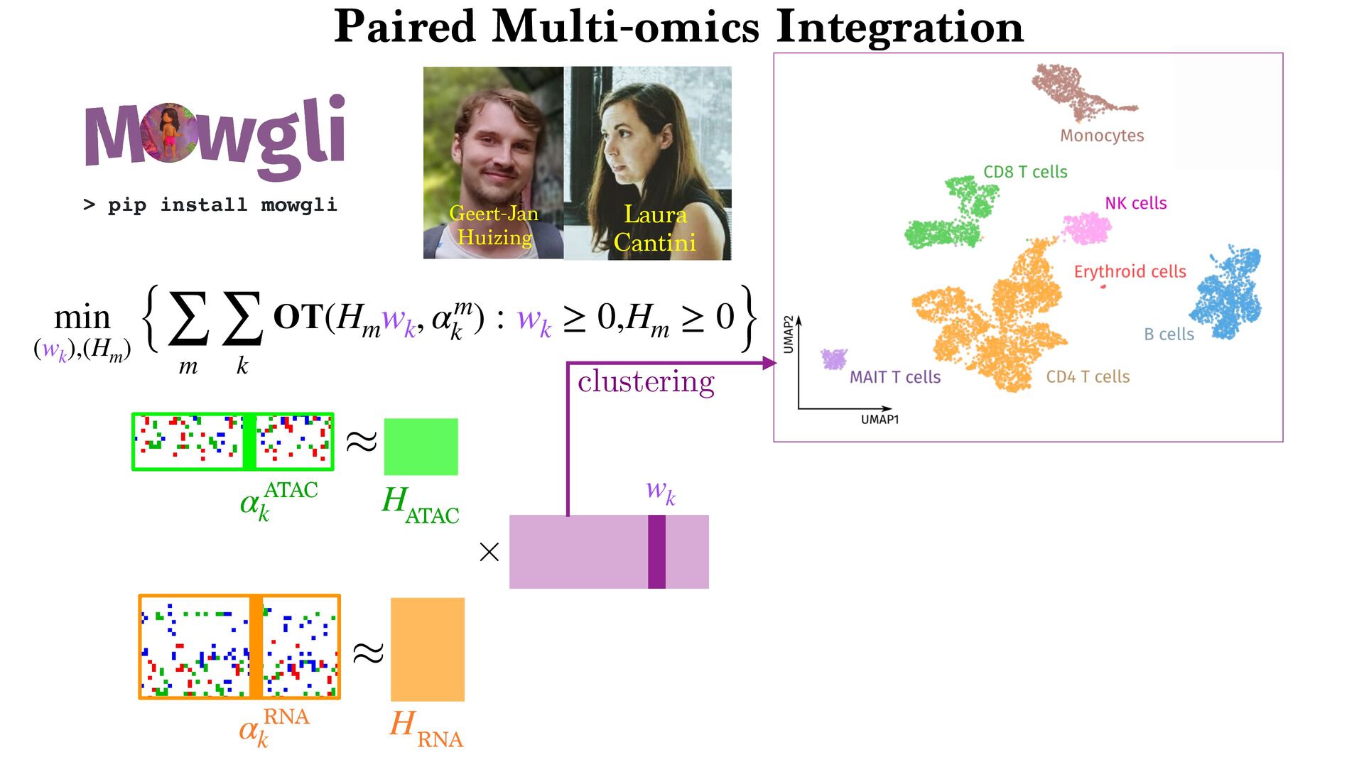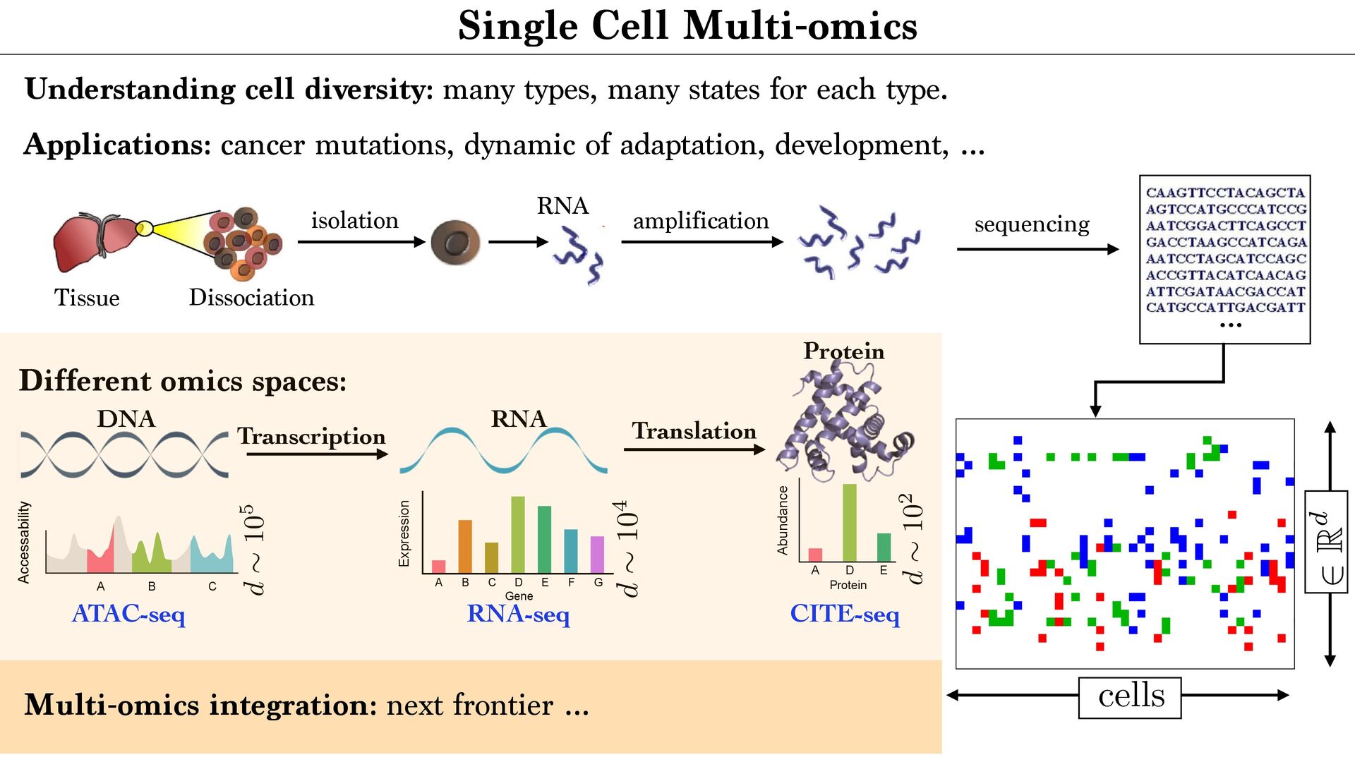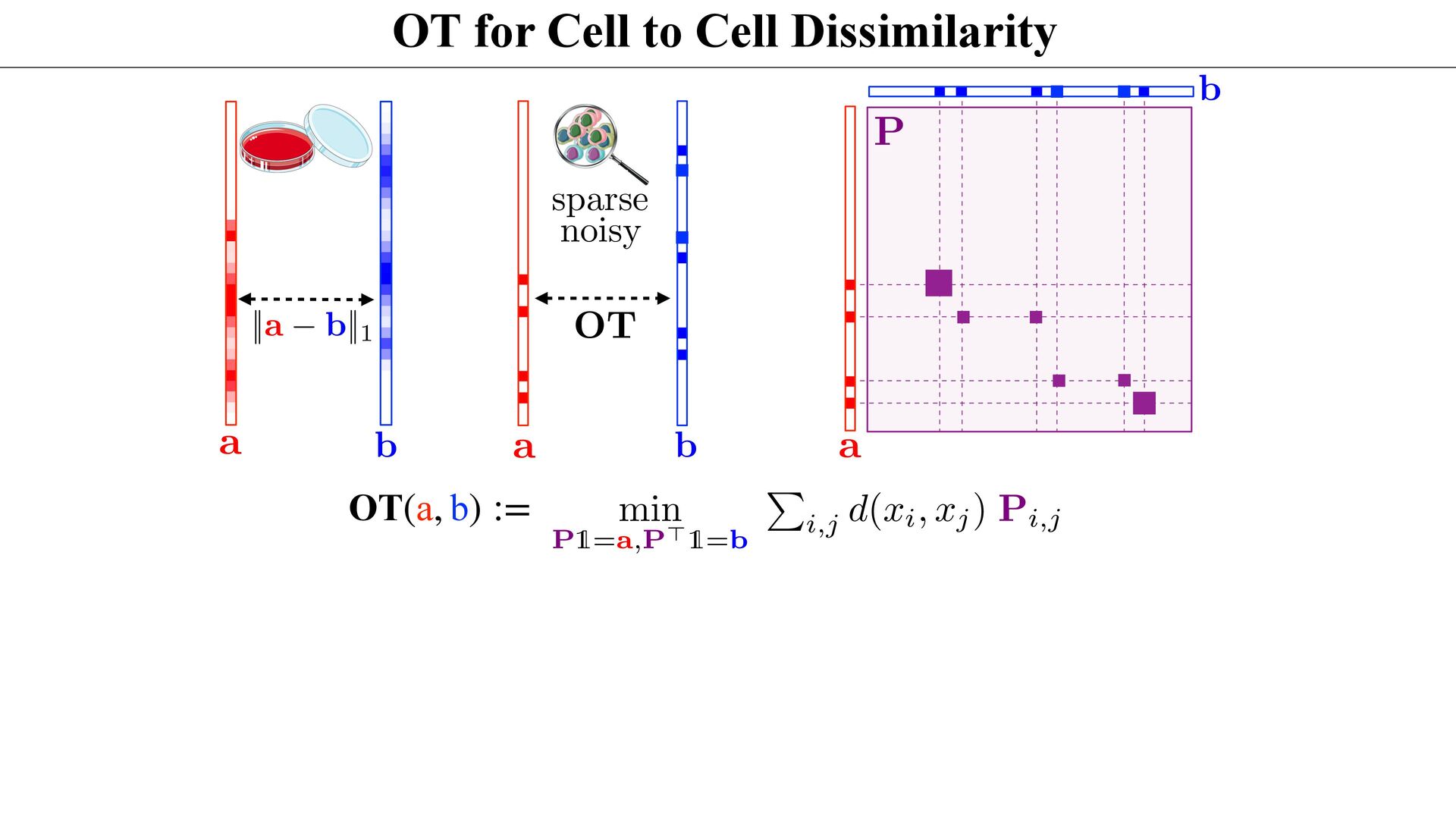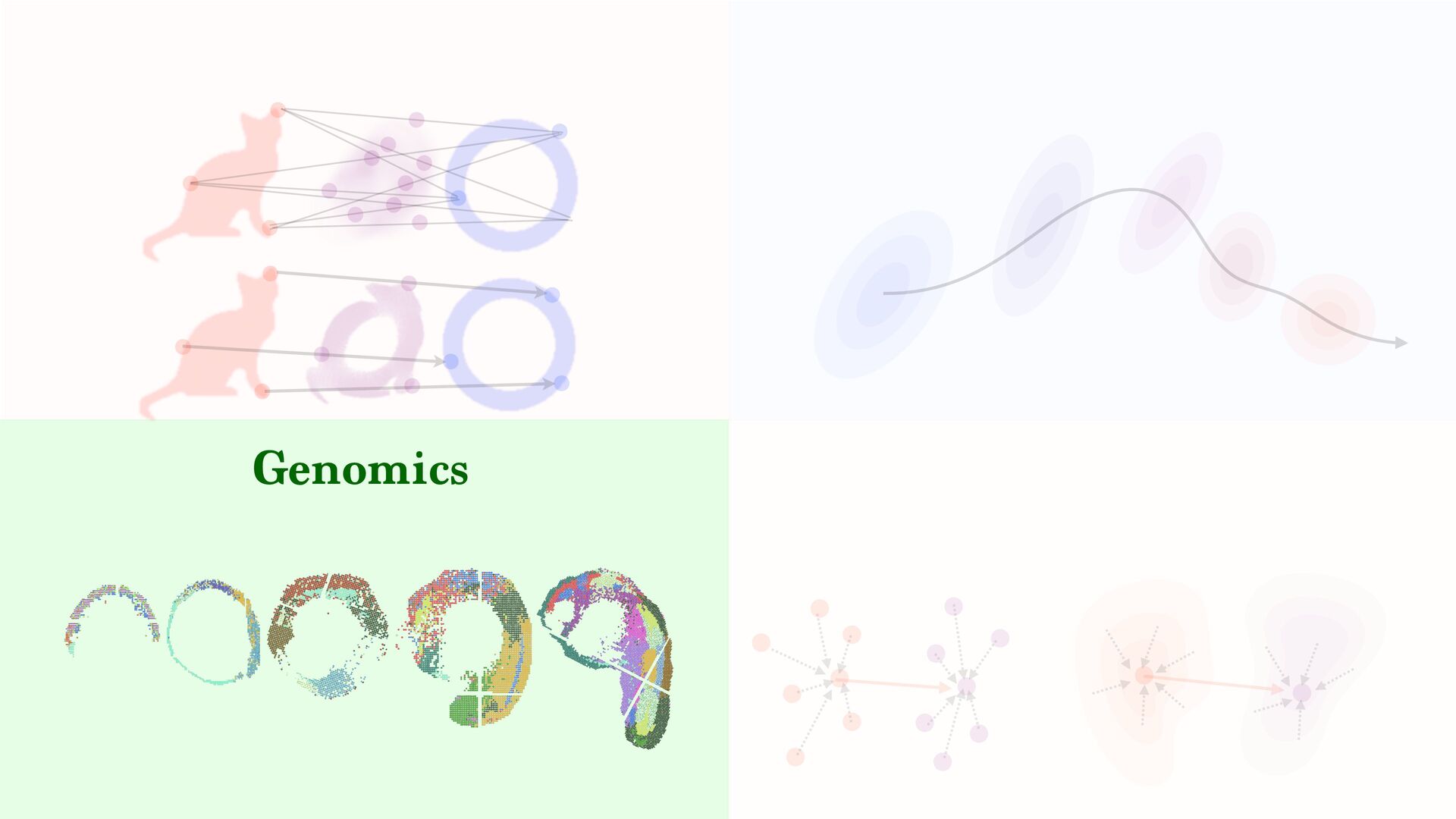 many cells (bulk omics) • Today, we can measure omics at the single cell level1. 2 carelli et al. 2018 2Lähnemann et al. 2020 Single-cell profiling uncovers cellular heterogeneity • Until recently, samples contained many cells (bulk omics) • Today, we can measure omics at the single cell level1. 2 1Mincarelli et al. 2018 2Lähnemann et al. 2020 <latexit sha1_base64="8h9qfn6MXuBvKOcg4p0NkYUZouc=">AAACx3icjVHLTsJAFD3UF+ILdemmkZi4Ii0x6pLgRneYCJIgMe0wwITSNu2USIgLf8Ct/pnxD/QvvDMOiUqMTtP2zLn3nJl7rx8HIpWO85qzFhaXllfyq4W19Y3NreL2TjONsoTxBouCKGn5XsoDEfKGFDLgrTjh3sgP+LU/PFPx6zFPUhGFV3IS887I64eiJ5gnFVXLguFtseSUHb3seeAaUIJZ9aj4ght0EYEhwwgcISThAB5Setpw4SAmroMpcQkhoeMc9yiQNqMsThkesUP69mnXNmxIe+WZajWjUwJ6E1LaOCBNRHkJYXWareOZdlbsb95T7anuNqG/b7xGxEoMiP1LN8v8r07VItHDqa5BUE2xZlR1zLhkuivq5vaXqiQ5xMQp3KV4Qphp5azPttakunbVW0/H33SmYtWemdwM7+qWNGD35zjnQbNSdo/LR5eVUrVmRp3HHvZxSPM8QRXnqKNB3gM84gnP1oUVWWPr7jPVyhnNLr4t6+EDdTmQuA==</latexit> Bulk <latexit sha1_base64="xfWO8cpwoNz5R1B8gV9utdLBqVI=">AAACznicjVHLSsNAFD2Nr1pfVZdugkVwVZIi6rLoxmVF+4BaJJlO69BpEpJJoZTi1h9wq58l/oH+hXfGFNQiOiHJmXPPuTP3Xj+SIlGO85qzFhaXllfyq4W19Y3NreL2TiMJ05jxOgtlGLd8L+FSBLyuhJK8FcXcG/qSN/3BuY43RzxORBhcq3HEO0OvH4ieYJ4iqn0lgr7kNuNS3hZLTtkxy54HbgZKyFYtLL7gBl2EYEgxBEcARVjCQ0JPGy4cRMR1MCEuJiRMnGOKAnlTUnFSeMQO6NunXTtjA9rrnIlxMzpF0huT08YBeULSxYT1abaJpyazZn/LPTE59d3G9PezXENiFe6I/cs3U/7Xp2tR6OHU1CCopsgwujqWZUlNV/TN7S9VKcoQEadxl+IxYWacsz7bxpOY2nVvPRN/M0rN6j3LtCne9S1pwO7Pcc6DRqXsHpePLiul6lk26jz2sI9DmucJqrhADXXT8Uc84dmqWSNrat1/Sq1c5tnFt2U9fACwKpOS</latexit> Single cell <latexit sha1_base64="pydPpuNuJAJzk3J9ohxA5exGGlo=">AAACyHicjVHLSsNAFD2Nr1pfVZdugkVwVZIi6s6iG3FVwbSFtkgyndaheZFMlFLc+ANu9cvEP9C/8M6YglpEJyQ5c+49Z+be68W+SKVlvRaMufmFxaXicmlldW19o7y51UyjLGHcYZEfJW3PTbkvQu5IIX3ejhPuBp7PW97oTMVbtzxJRRReyXHMe4E7DMVAMFcS5XS9gXlyXa5YVUsvcxbYOaggX42o/IIu+ojAkCEARwhJ2IeLlJ4ObFiIiethQlxCSOg4xz1KpM0oi1OGS+yIvkPadXI2pL3yTLWa0Sk+vQkpTeyRJqK8hLA6zdTxTDsr9jfvifZUdxvT38u9AmIlboj9SzfN/K9O1SIxwLGuQVBNsWZUdSx3yXRX1M3NL1VJcoiJU7hP8YQw08ppn02tSXXtqreujr/pTMWqPctzM7yrW9KA7Z/jnAXNWtU+rB5c1ir103zURexgF/s0zyPUcY4GHPIWeMQTno0LIzbujPFnqlHINdv4toyHD4JFkLc=</latexit> ? <latexit sha1_base64="QNHLtJL77Xel7kqDwcr8uqkXoFI=">AAAC6XicjVHLTtwwFD2EUt5tCks2VqdIrKIEocJyBBuWIHUAiSKUGM9gjRNHtoM0GvED7NhVbPkBtvAjVf+g/Yteu0EqINQ6SnJ87j3HvvcWtZLWpemPiWjyzdTb6ZnZufmFxXfv4w9LB1Y3hose10qboyK3QslK9Jx0ShzVRuRlocRhMdzx8cMLYazU1Rc3qsVJmQ8q2Zc8d0Sdxp92VGOdMIwLpSzrG12ynFlZDZRghdS1HSXsNO6kSRoWewmyFnTQrj0df8dXnEGDo0EJgQqOsEIOS88xMqSoiTvBmDhDSIa4wCXmSNtQlqCMnNghfQe0O27Zivbe0wY1p1MUvYaUDKuk0ZRnCPvTWIg3wdmzr3mPg6e/24j+RetVEutwTuy/dI+Z/6vztTj0sRVqkFRTHRhfHW9dmtAVf3P2V1WOHGriPD6juCHMg/KxzyxobKjd9zYP8Z8h07N+z9vcBr/8LWnA2fNxvgQH60n2OdnYX+90t9tRz2AFH7FG89xEF7vYQ4+8r3CHezxEw+g6+hbd/EmNJlrNMp6s6PY3BdOdqw==</latexit> Cluster cells from a single biopsy. <latexit sha1_base64="NAYrO+hblycchNy+rUEIB63nwtY=">AAAC6XicjVHLLgRBFD3a+z1Y2nQMYTXpEcGOYGFJYphkRma6y0Vnqh/prvbIxA/Y2YmtH7DlR8Qf8BdulZ7EI0J1uvvUufecqnuvF0s/VY7z0mV19/T29Q8MDg2PjI6NFyYm99MoSwRVRCSjpOq5KUk/pIrylaRqnJAbeJIOvNamjh+cUZL6UbinLmM6DNyT0D/2hauYahRm64ouWNduNrf4NDcUND9ve6TOiUJbkJTp2lWjUHRKjln2T1DOQRH52okKz6jjCBEEMgQghFCMJVyk/NRQhoOYuUO0mUsY+SZOuMIQazPOIs5wmW3x94R3tZwNea89U6MWfIrkN2GljTnWRJyXMNan2SaeGWfN/ubdNp76bpf893KvgFmFU2b/0nUy/6vTtSgcY9XU4HNNsWF0dSJ3yUxX9M3tT1UpdoiZ0/iI4wljYZSdPttGk5radW9dE381mZrVe5HnZnjTt+QBl7+P8yfYXyyVl0tLu4vF9Y181AOYxgwWeJ4rWMc2dlBh72s84BFPVsu6sW6tu49UqyvXTOHLsu7fAYBOnkY=</latexit> “Distance” between cells? <latexit sha1_base64="yFN6xhMLWSFTo6y4Ic3WSee5g64=">AAAC2HicjVHLSsNAFD2Nr1pf0S7dBIvoqqRF1GXRjTsr9IW1lGQ6raFpEjIToRTBnbj1B9zqF4l/oH/hnTGCWkQnJDlz7j1n5t7rRr4npG2/ZIyZ2bn5hexibml5ZXXNXN9oiDCJGa+z0A/jlusI7nsBr0tP+rwVxdwZuT5vusNjFW9e8Vh4YVCT44h3Rs4g8PoecyRRXTN/WrPCwBrwgIsdS0QO48WuWbCLtl7WNCiloIB0VUPzGRfoIQRDghE4AkjCPhwIetoowUZEXAcT4mJCno5zXCNH2oSyOGU4xA7pO6BdO2UD2itPodWMTvHpjUlpYZs0IeXFhNVplo4n2lmxv3lPtKe625j+buo1Ilbikti/dJ+Z/9WpWiT6ONQ1eFRTpBlVHUtdEt0VdXPrS1WSHCLiFO5RPCbMtPKzz5bWCF276q2j4686U7Fqz9LcBG/qljTg0s9xToNGuVjaL+6dlQuVo3TUWWxiC7s0zwNUcIIq6uQ9xgMe8WScGzfGrXH3kWpkUk0e35Zx/w7KEZZE</latexit> OT on genes’ space. <latexit sha1_base64="c8Nzu7i/2HdZbRFNoq24LWiMXCg=">AAAC53icjVHLLgRBFD3TXmO8BkubionEatIjguWEjY2ExCBBpLsUKmq6Ol3VRCb2dnZi6wds+RPxB/yFW6UnwUSoTnefOveeU3XvjVMljQ3D11LQ1z8wOFQeroyMjo1PVCendozOMy5aXCud7cWREUomomWlVWIvzUTUjpXYjc/XXHz3QmRG6mTbXqXisB2dJvJE8sgSdVSd3YgsP2NcKGVYLOylEAmzl5rFUqdGClNnR9VaWA/9Yr2gUYAairWpqy84wDE0OHK0IZDAElaIYOjZRwMhUuIO0SEuIyR9XOAaFdLmlCUoIyL2nL6ntNsv2IT2ztN4NadTFL0ZKRnmSKMpLyPsTmM+nntnx/7m3fGe7m5X9I8LrzaxFmfE/qXrZv5X52qxOMGKr0FSTalnXHW8cMl9V9zN2ZeqLDmkxDl8TPGMMPfKbp+Z1xhfu+tt5ONvPtOxbs+L3Bzv7pY04MbPcfaCnYV6Y6m+uLVQa64Woy5jBrOYp3kuo4l1bKJF3jd4xBOeAxncBnfB/WdqUCo00/i2gocPIpGc9w==</latexit> Match cells between two biopsies. <latexit sha1_base64="smAhPpTgHUrzBKRMXffs73pgv0w=">AAAC2HicjVHLSsQwFD1TX+N7dJZugoPoaugMoi5FN+4cYV44irQxajDTliYVBhHciVt/wK1+kfgH+hfexAo+EE1pe3LuPSe594aJktr4/nPBGxoeGR0rjk9MTk3PzJbm5ts6zlIuWjxWcdoNAy2UjETLSKNEN0lF0A+V6ITn2zbeuRCplnHUNINEHPaD00ieSB4Yoo5K5d0miyPGhVJ6mekk4KJ6VKr4Vd8t9hPUclBBvhpx6QkHOEYMjgx9CEQwhBUCaHp6qMFHQtwhLolLCUkXF7jCBGkzyhKUERB7Tt9T2vVyNqK99dROzekURW9KSoYl0sSUlxK2pzEXz5yzZX/zvnSe9m4D+oe5V59YgzNi/9J9ZP5XZ2sxOMGGq0FSTYljbHU8d8lcV+zN2aeqDDkkxFl8TPGUMHfKjz4zp9GudtvbwMVfXKZl7Z7nuRle7S1pwLXv4/wJ2vVqba26ulevbG7loy5iAYtYoXmuYxM7aKBF3gPc4wGP3r537d14t++pXiHXlPFleXdvzGyWRQ==</latexit> OT on cells’ space. <latexit sha1_base64="pydPpuNuJAJzk3J9ohxA5exGGlo=">AAACyHicjVHLSsNAFD2Nr1pfVZdugkVwVZIi6s6iG3FVwbSFtkgyndaheZFMlFLc+ANu9cvEP9C/8M6YglpEJyQ5c+49Z+be68W+SKVlvRaMufmFxaXicmlldW19o7y51UyjLGHcYZEfJW3PTbkvQu5IIX3ejhPuBp7PW97oTMVbtzxJRRReyXHMe4E7DMVAMFcS5XS9gXlyXa5YVUsvcxbYOaggX42o/IIu+ojAkCEARwhJ2IeLlJ4ObFiIiethQlxCSOg4xz1KpM0oi1OGS+yIvkPadXI2pL3yTLWa0Sk+vQkpTeyRJqK8hLA6zdTxTDsr9jfvifZUdxvT38u9AmIlboj9SzfN/K9O1SIxwLGuQVBNsWZUdSx3yXRX1M3NL1VJcoiJU7hP8YQw08ppn02tSXXtqreujr/pTMWqPctzM7yrW9KA7Z/jnAXNWtU+rB5c1ir103zURexgF/s0zyPUcY4GHPIWeMQTno0LIzbujPFnqlHINdv4toyHD4JFkLc=</latexit> ?