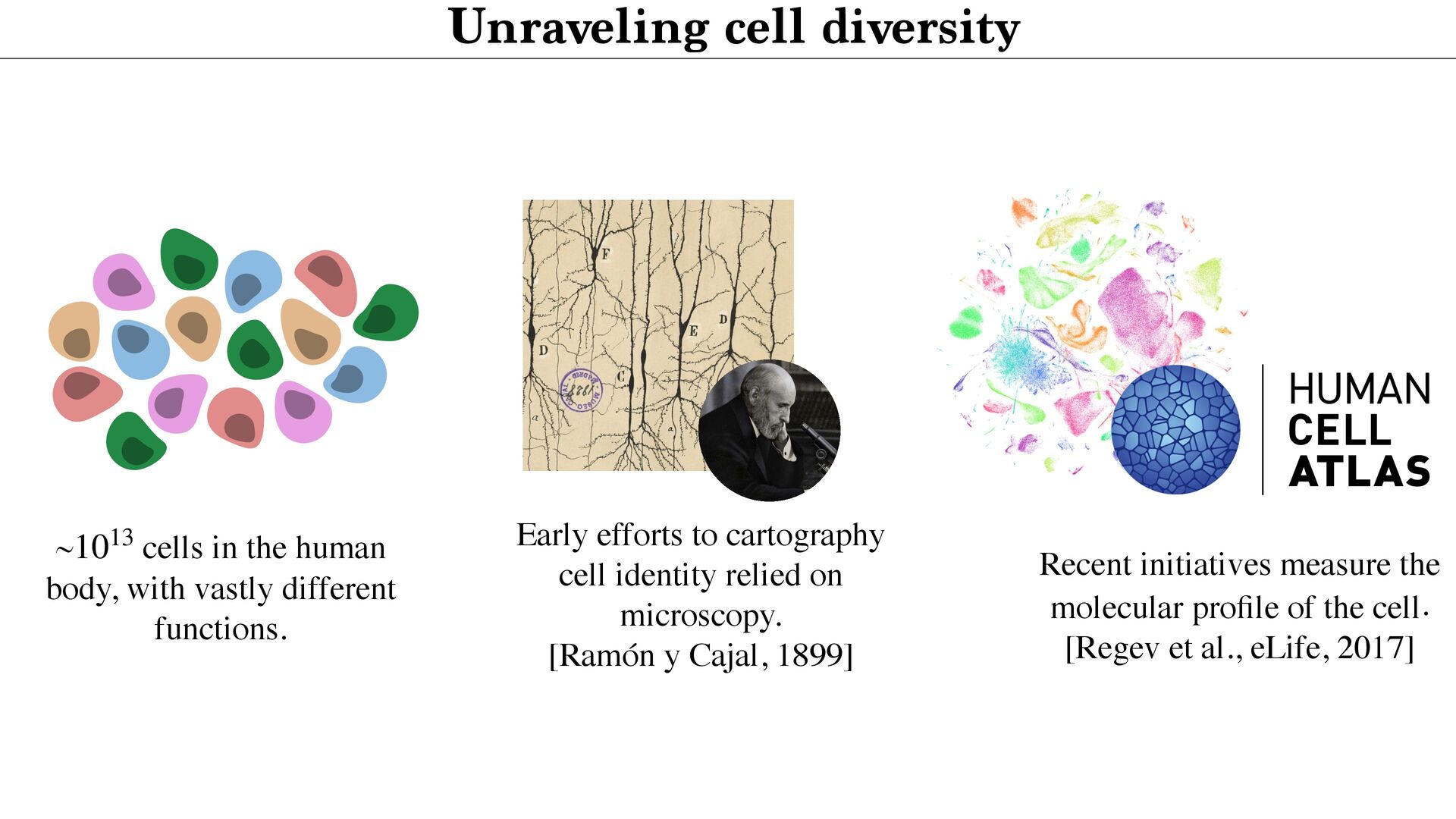 Early efforts to cartography cell identity relied on microscopy1. Recent initiatives me molecular profile of s in the human body, ly different functions. Early efforts to cartography cell identity relied on microscopy1. Recent initiatives measure th molecular profile of the cell e human body, erent functions. Early efforts to cartography cell identity relied on microscopy1. Recent initiatives measure the molecular profile of the cell2. ~ cells in the human body, with vastly different functions. 1013 Early efforts to cartography cell identity relied on microscopy. [Ramón y Cajal, 1899] Recent initiatives measure the molecular pro fi le of the cell. [Regev et al., eLife, 2017] Unraveling cell diversity