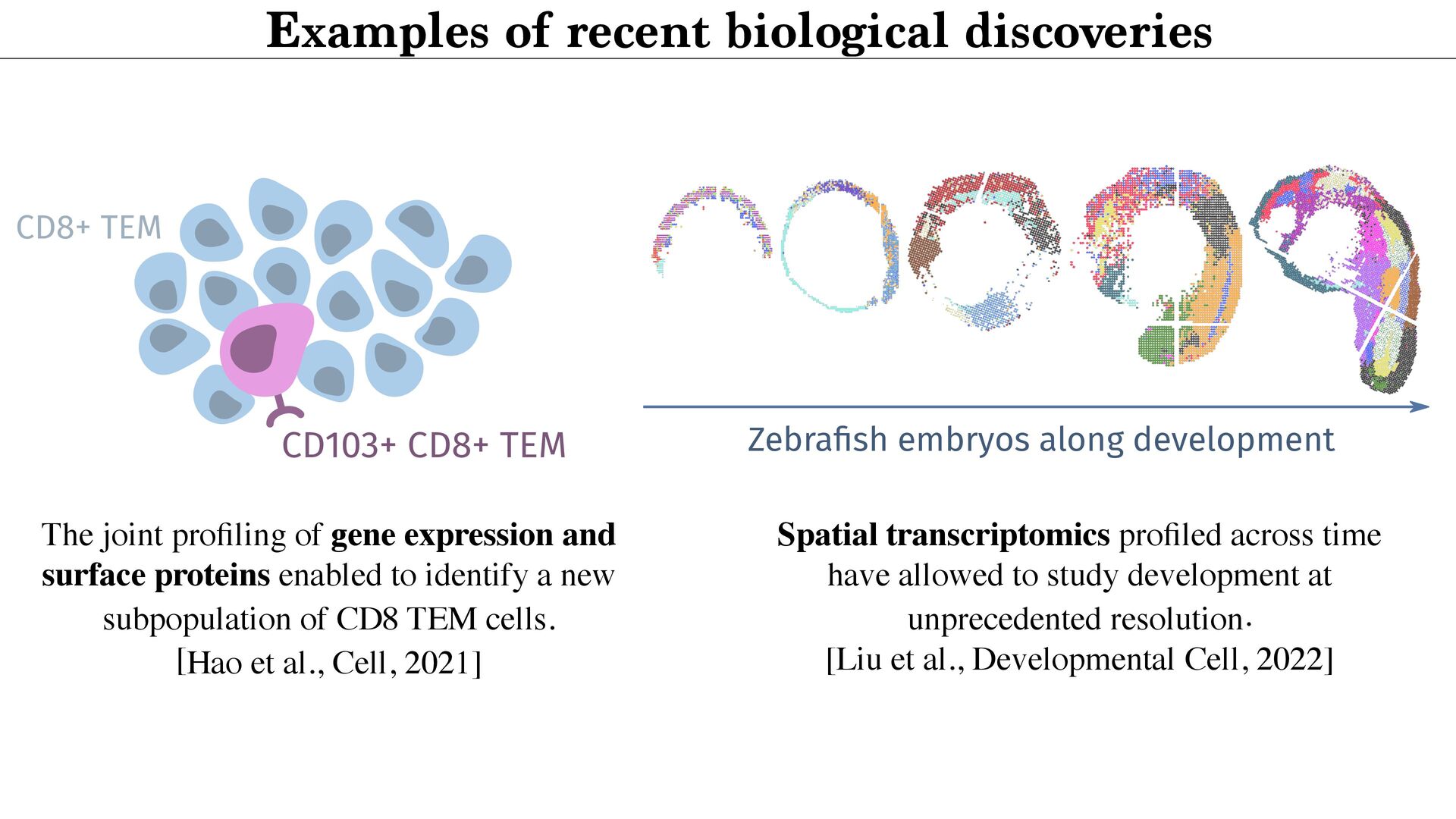 to identify a new ubpopulation of CD8 TEM cells8. Spatial transcriptomics profiled across time have allowed to study development at unprecedented resolution9. CD103+ CD8+ TEM CD8+ TEM Zebrafish embryos along development ing of gene expression and ns enabled to identify a new of CD8 TEM cells8. Spatial transcriptomics profiled across time have allowed to study development at unprecedented resolution9. CD103+ CD8+ TEM Zebrafish embryos along development The joint pro fi ling of gene expression and surface proteins enabled to identify a new subpopulation of CD8 TEM cells. [Hao et al., Cell, 2021] Spatial transcriptomics pro fi led across time have allowed to study development at unprecedented resolution. [Liu et al., Developmental Cell, 2022] Examples of recent biological discoveries