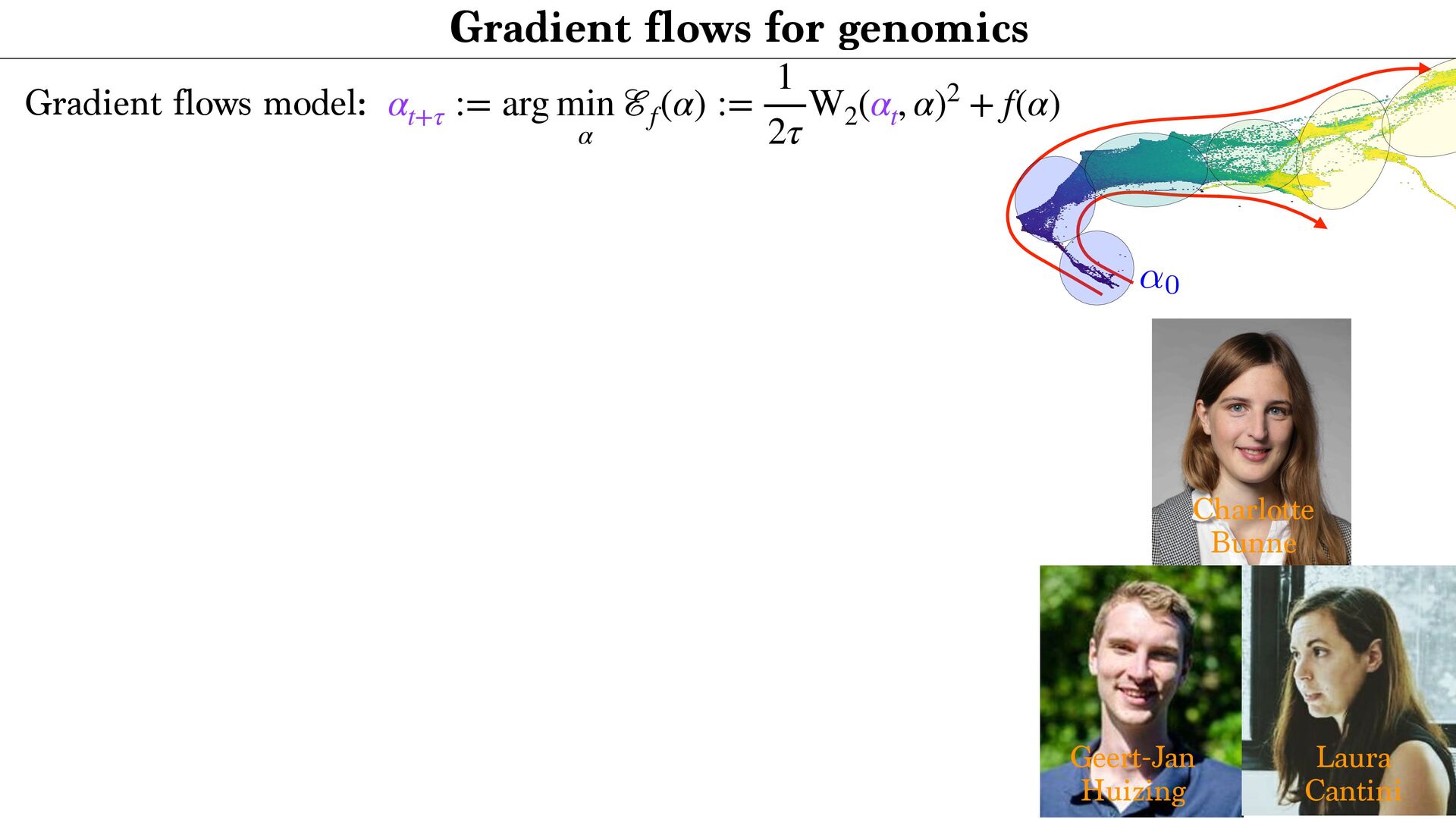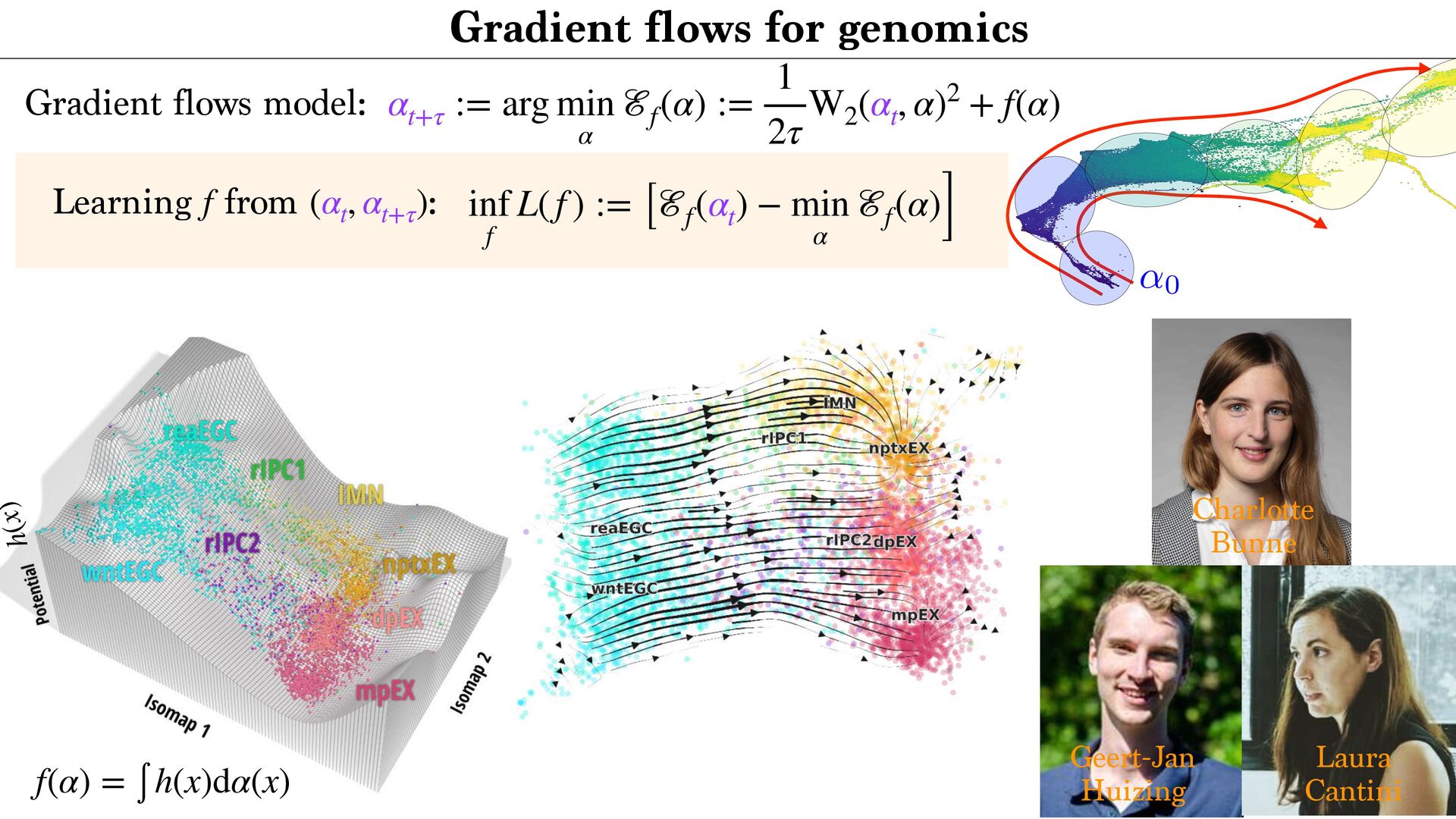 find … Straight flow easier to discretize! Optimizing: going deeper with ResNet Still a Wasserstein flow! Global convergence open … Raphaël Barboni Conclusion Genomics: beyond linear functionals Scalability problems … Integrating multiomics … Geert-Jan Huizing <latexit sha1_base64="Tis7/dOjTO3ezjstyD8AzcqN46U=">AABE+3ictVxZcxu5EYY318a5vMlTKi+z0Trl3VIcSXGOqq1UrSzJstayLZuU7F3TdnHIEU17xKF5+eCy8mNSeUmlkqc853fkB6QqecpfSB/AAENipjGKo7FEDIivu9EDNLobGMfDtD+ebGz848J7X/v6N775rfe/ffE73/3e939w6YMfnoyz6aiTHHeyNBs9jNvjJO0PkuNJf5ImD4ejpH0Wp8mD+MUOfv9glozG/WzQnLwZJo/P2r1B/7TfaU+g6umlH7eIxqNRL34831y/eg3+LaLt5vbO00trG1c36CdaLWzqwprSP0fZBx/+U7VUV2Wqo6bqTCVqoCZQTlVbjeF6pDbVhhpC3WM1h7oRlPr0faIW6iJgp9AqgRZtqH0Bf3tw90jXDuAeaY4J3QEuKfyOABmpy4DJoN0Iysgtou+nRBlry2jPiSbK9gY+Y03rDGon6hnUSjjTMhSHfZmoU/Vb6kMf+jSkGuxdR1OZklZQ8sjp1QQoDKEOy134fgTlDiGNniPCjKnvqNs2ff8vaom1eN/Rbafq3yTlZbgi1dC9z3IKbTUj+hE9zSl8x/KkwLkHFBLdRyy9Il2fUe8H0H4O9XfgWlDJ6CSGa061i0rkDlw+5I6I3IfLh9wXkYdw+ZCHIvIILh/ySCMROyKd+/ENuHz4hsj5Hlw+5D0ReR8uH/K+iDyBy4c8EZFfwuVDfikib8DlQ94Qkbfg8iFvicgmXD5kU0Qew+VDHovIPbh8yD2NLJ+pI7gyotMXZuU2lIs80FKkULMtynedrKMPez1gTndKsPKs3oVPP3Y3QKdJCXYvYNydlmDlkbcPNtKPlW3RTVpNfNibIvYARoAfeyBiP1fPS7CfB8y0FyVYea4dQjs/Vra+t+HOj70tYu9AyY+V16i7UOPH3g1YMYYl2CMRe0+9LMGGWP1RCVa2+w2wK36svE41ob0fG2JNpyVY2Z6egAfjx8qr1QOo9WMfiNiH6nUJ9qGI/QKsux/7RcAK+7YEa9bYi7SC9MgfSWDGVlFr57MSS0Og1hb4p/nakpJvHEO9hOnlmB5hzkTEfo7YD0Qc5ojDYLnGuR0dk78rc2nkiEYgIs7XJixNxPbdvD2W0gDEbo7YXUJUeaT4rE1fZuRdmBoJOclXLiyF9CnL7TeWEj0eqi2vQdwtIHhsP6ORv07REkZQqKkqas/yNZ6REd1XIV5R9GZ6aXjIuEluFVzUaxEVe1CxiHrjQb0RUVMPaiqiZh7UTETZme/iWgEjwOofn8Wc7ngEsI9cfkXgFWzDqnMT5mgE4+cIvMD7VHMXPhsUe0tXlWQYzeM6iVmOxwVLPILSXK1BvY0Kdym+TmmGJSAZt7yrY3y8w9zGXM85tsKLfCWP8oxJOJ0+ydPL6aC3GNF8qkfnFtUsyLvjUj38zXzem1I9/B5pfEFePJfq4Sda+sk5ZG9qbPMc2AbMpqHWvi3XpcH5F6Zhyhdp1UWLi0/1TI8ZpPe6Jv0D/WQOzvFcdqjE+rHlejTGTv/Ghf7VoWH1PHb0XI8Kek/s9ZpSVLsnAx332nJdGTJaRQdaDntX98lgm65+MqZcj8YReFw7FHPPnXLd0TvMe2PL9WicKM57LsiTN+V6NHp0z/qw5Xo0MNvS1nG+Lde17KgBjp1tua5VH1AWGHNAPOa5xnpFI/KTpppan/yD6myN6/OvrmOYs3mSxwjVlKxvW04nzteyaomMv5CAVZvUlAP9i6njgxVpzNWWGF+xDJPC+r5Kx67xqPlD0GIEs5/3AKSceQoSmpwEWu8UKG6KUVexZwa3JeJwlJwuoVq6diJ6i5YvZ42KdU+pVorLbG+tHltkr8c09obkEx6SZiU9HJY+4TKKkoYOCxqS6dXR3Vs9X4va3xBxwyXEMB9pHdoR4p206jjVp/WGo+PLepdnAhfv+djxi9nmU21tMObJyBahLFU83XYmj+TW4bq6rmyOm7+L6ImivZqR1ejTjtRYjEJNtpi98TndW9rHtCeHPJhGB55jpKkMFe+aYRYd8+kRWVTX3kq8UV8mQ8flMVldY4+r0T0H3fOg68c4O7Bi3IFSE2KGY7hrBkQ5F3NdZaTxkfp5vjua0ROsjujTgoU0NNjeJAULWRVlPytQeQVoHA0cpYfTWKZj8K0VSnLU75PHxq5Fy3+Zdm7N/nabxnj5aC7PxHSJ6xZxjWjW8K4u3y1zYAnm3m+2yH+t7iXyq8MRbajE9YnDmfUyoB3/hCLYIXnGKc02aXYUW7v5qeVvDKcjZfbOcTc7IwsZkf2LYH3KaExG9OueHTA76GwRUrKRIXann3s3Pl+nL44x68f1FZ9qsOMtIVs2Jf6Grju7xjQWOWLgdWCxNLaNTg7JF0yI60hbdzu3q1cfRNpzEu4oYYp2rFwh/h/TX/NrxsnayohADeMTGGtb53seGcUsqKM2rfLVNsi0daX8KJfhiZbarn9Wpo8Kku1SxIXy4GrdBc4dumdeOEpGJPd4pQ2vo1XZXKQ8XNIj9vaUoni2+z29AqPc67RKrtGca9Eo6cEomORRhGkrZZGX+VbzKlIPoz3+v1C3ui5qDSlGymZwWUNSfj+haM2VMoVRzeP3Bc0mv9ZHS62q+QxoLJ45c/krqP0Q/hq5zX0YnbhgFa7TGGAK9s5qhGuilRZhvK4XeJmRaWjZe8vPjknTyq05T3zN1s3G2LPaVI5o1LzWWQtTPg+N5w6N54E6bNJeo9WiqTeW6KkYWzT1bmUovzrcmjUoT0XKskdmUP0AKd1YKoxqV6Qqx/gG9VaktSHSasNsdXcD3DkfgvTP9eXZ/VW+ukfqBvk2HfLAOH7p0iztk89laqsjNaaAnK9p++rO/hbVIPeYLChS5nOcOGN416lD1yKX9Gd6ZcvIzluLYM4tvdJtjI1tUfmXK8gzmhNjmpcGcY1aJFp+V45oySJddXyOiDL/bfKp2O+ojpnd1vaZRAV/wsabPKssL44UBqR/KfN2sBK9Hjjxa0Qx4VR71zHQqv+EkQJjTCbB71mO6QnhKsc7CezRxmQ/V+0U7+INHImuktRz9bsAG8NRrx3r7tgyPTZ9+wRaotbtU/e1kPmlwRwlfufZ0WvTqnamfdT50v35aLX1Kle8r9LDdImv1ceU2riRhY3yipiW+jSYC0tUjwtjQrjU60Ud+etJXkdm3p0KpWxaG8rFTAPbmGcUL0nnQBHh8+6ueL25j4V+xCv0YsK61LhGooTZuEznB1xLi1mpaClCcuulNSl11qOy9cLycFcNa8fZUiZkBVMl5W64tduHViFakbMxTKGj+GRvWZzo0vwULvwbKV+UaDiG5BAb4Oduqx219w5ORbzUZc5sRlSDNqG7FIO3dT+LLap19NKh7tIP4RDOow+6lqTv04paV3amLEvuUg+n/4qswUglovS2Zf0+uFzknqxyqtOfPlk4uTd9Zd7JqdsXwyGkJ0Uu4Xx4f0Pqxaky7zbV64OhLvegyKEOD3OeIeyZ29b1ebmcqvW1yiWUB68DZufF4HAHsDxmse1CLNTIeSLvngNah9MK6ma1+F/7YfhYTvV5hXIb0ztnzwOeOrdLdGYW/eL6c8ZyCxnN5RzDeWZ576zX5OfH/l9U60llTm/ePX30S+0YMLzmivOhsnSMd0eRlTeUCu4P+GTI1H/U3y/IbyW8zGmUyVGHktmvKKdmWsjUzJuXvt6Z70JksnTKZCpSs/FEg07G7qgDdQN+d3IPsO4pUX6nkj8R63+Ptgu1p2Q9TDadMwgtqksoC2J307p0b8/RlkmMZ3r5jG8TanBP/JBq8bzvHWqPZ36bhb6Vv0nCc/22ylS3EJks7/LZeRVDD4o7cJwLMu/7RnSmnrNZfALtLGCPkc9RcaRk3n6eE6JLceGypHNCmNFSRTn2Uo7pTFJSQjsu9K1DI3yod/px3wHP57fz7FKkfkF1bb064EotSXXkkeoRZQZi0v8GRGi/Uuvwua7LfkmPViQd0zMoSvTa+a76JNjCOy7s24yXKQ9mMnUz3S6jqN7uHlZnYndLufCJ92p8rwLfc6Rs0NN6QXH3SFXnDqcVNKdaJnc/d6BM3pP1gNFsOx8f1fHzrILXLKD/t0rRtxxJ90GWmLLtEe3njYheqnWzR9LzucrqvO3NCmnNW5tM056stOPAnJGs3hNI9bgrn/18DlLK1SQldNy5zicypdMifS8leX4OA05DtAN6K/c1pKcSlakoyTTgTeRZgCyzADqngjSnIoWeKIm2D08vrW0u/18fq4WTraubv7567d7W2mfX9f8D8r76ifqpugJr32/UZzD+j9QxcPq9+qP6i/rr7mL3D7t/2v0zN33vgsb8SBV+dv/2X8iWSHA=</latexit> ATAC <latexit sha1_base64="yLexRhVyH/8+kX4r+aALcN6qwFs=">AABE+nictVxZcxu5EYY318a5vMlLqvIyG61T3i1FkRTnqNpK1dqiLGst27JJyd41bReHHNG0Rxyalw9a+TGpvKRSyVPe8zvyA1KVPOUvpA9ggCEx0xhlo7FEDIivu9EDNLobGMejdDCZbm7+48J7X/v6N775rfe/ffE73/3e939w6YMfHk+y2bibHHWzNBs/jDuTJB0Mk6PpYJomD0fjpHMap8mD+MUOfv9gnowng2zYmr4ZJY9PO/3h4GTQ7Uyh6umlH7eJxqNxP3682Li6Dv+2zqL7d649vbS2ubFJP9FqYUsX1pT+Ocw++PCfqq16KlNdNVOnKlFDNYVyqjpqAtcjtaU21QjqHqsF1I2hNKDvE3WmLgJ2Bq0SaNGB2hfwtw93j3TtEO6R5oTQXeCSwu8YkJG6DJgM2o2hjNwi+n5GlLG2jPaCaKJsb+Az1rROoXaqnkGthDMtQ3HYl6k6Ub+lPgygTyOqwd51NZUZaQUlj5xeTYHCCOqw3IPvx1DuEtLoOSLMhPqOuu3Q9/+illiL913ddqb+TVJehitSTd37LKfQUXOiH9HTnMF3LE8KnPtAIdF9xNIr0vUp9X4I7RdQfweuMyoZncRwLaj2rBK5A5cPuSMi9+DyIfdE5AFcPuSBiDyEy4c81EjEjknnfnwTLh++KXK+B5cPeU9E3ofLh7wvIo/h8iGPReSXcPmQX4rIG3D5kDdE5C24fMhbIrIFlw/ZEpFHcPmQRyJyFy4fclcjy2fqGK6M6AyEWXkNykUeaClSqLkmynedrKMPez1gTndLsPKsbsCnH9sI0GlSgt0NGHcnJVh55O2BjfRjZVt0k1YTH/amiN2HEeDH7ovYz9XzEuznATPtRQlWnmsH0M6Pla3vbbjzY2+L2DtQ8mPlNeou1PixdwNWjFEJ9lDE3lMvS7AhVn9cgpXtfhPsih8rr1MtaO/HhljTWQlWtqfH4MH4sfJq9QBq/dgHIvahel2CfShivwDr7sd+EbDCvi3BmjX2Iq0gffJHEpixVdQ6+azE0giodQT+ab62pOQbx1AvYfo5pk+YUxGxlyP2AhEHOeIgWK5Jbkcn5O/KXJo5ohmIiPO1CUtTsX0vb4+lNADRyBGNJUSVR4rP2vRlTt6FqZGQ03zlwlJIn7LcfmMp0eOh2vIaxN0Cgsf2Mxr56xQtYQSFmqqi9ixf4xkZ0X0V4hVFb6aXhoeMm+ZWwUW9FlGxBxWLqDce1BsRNfOgZiJq7kHNRZSd+S6uHTACrP7xWSzojk