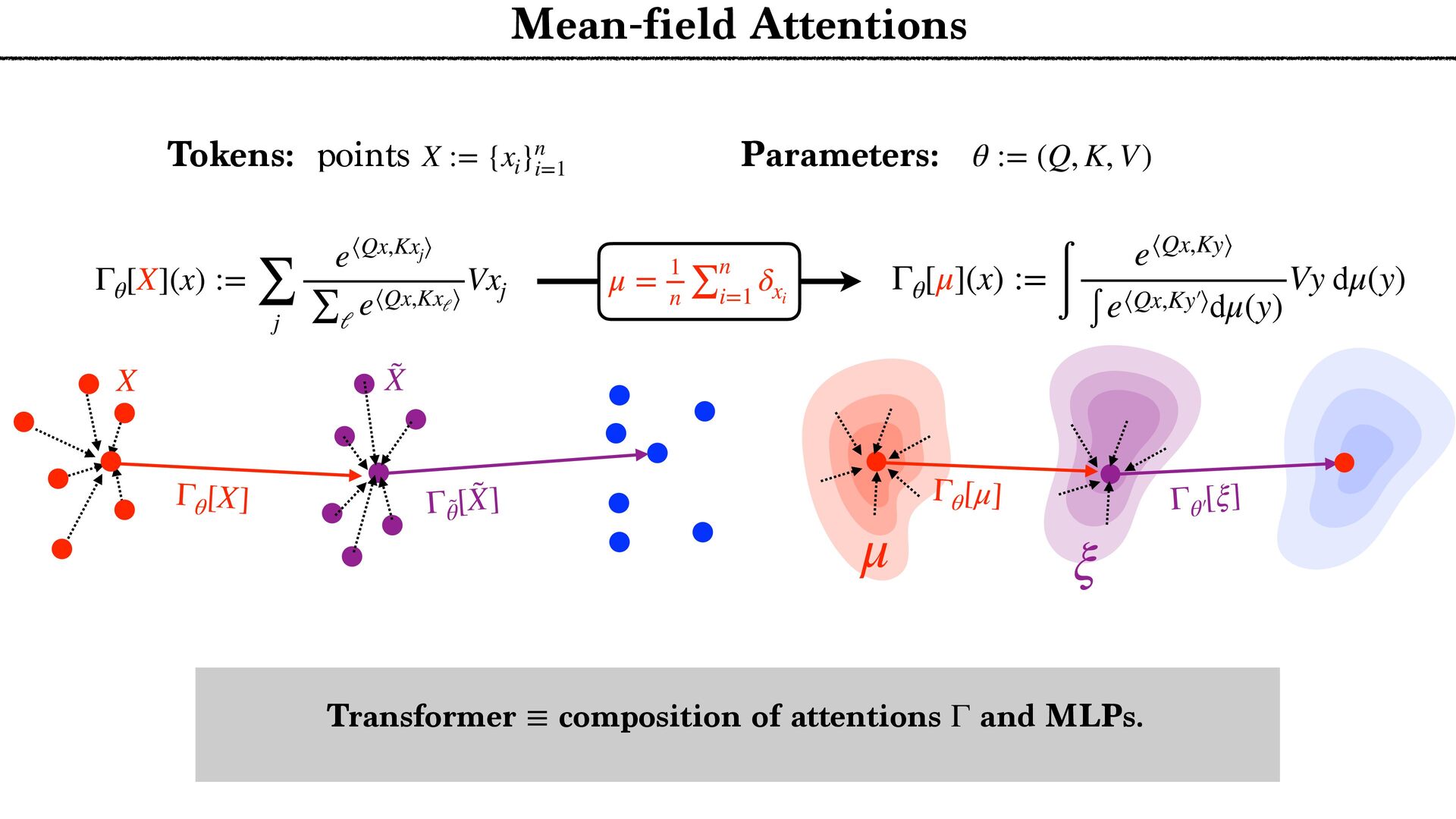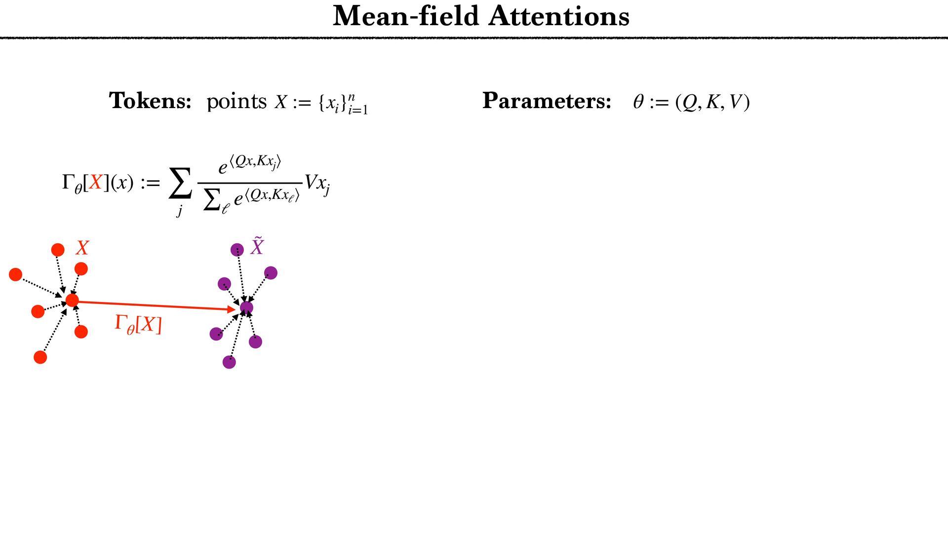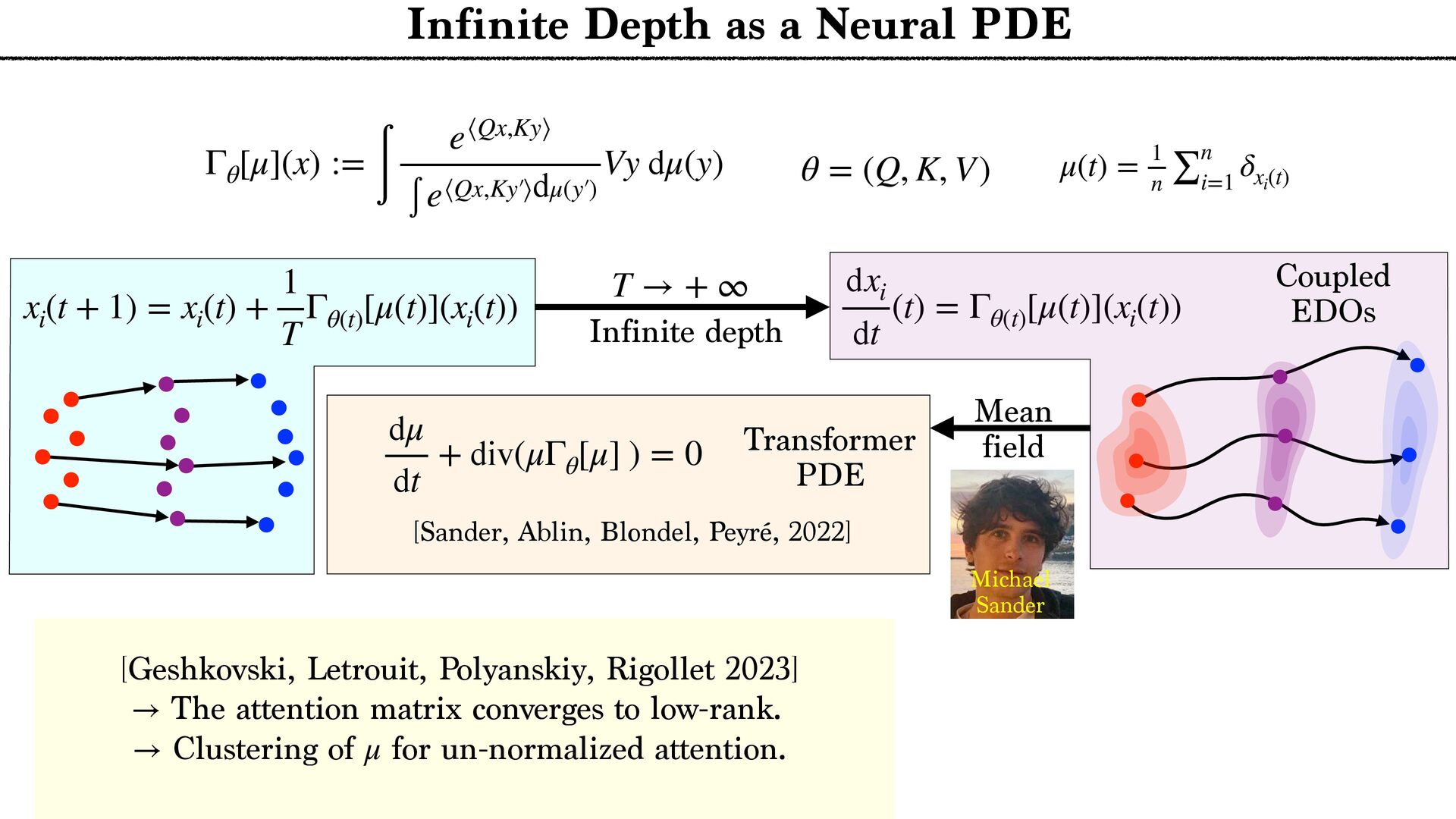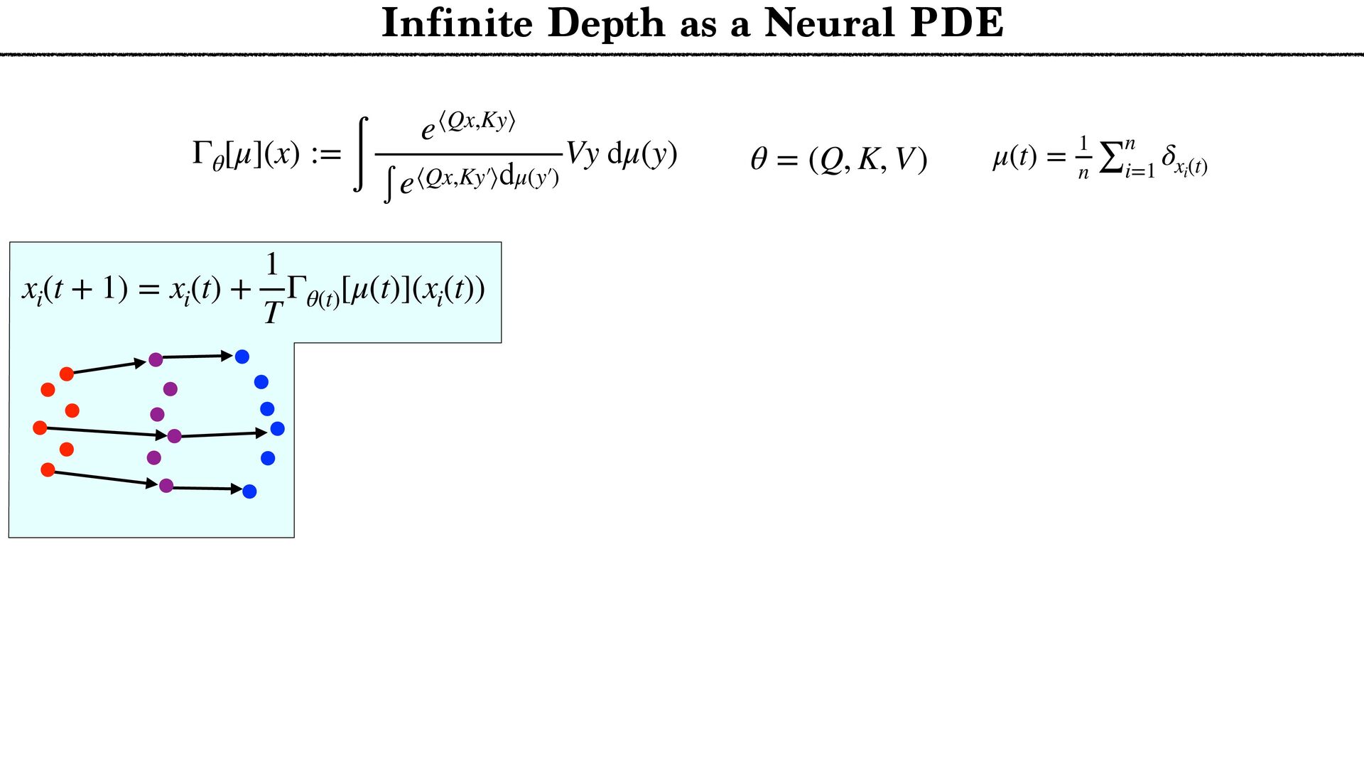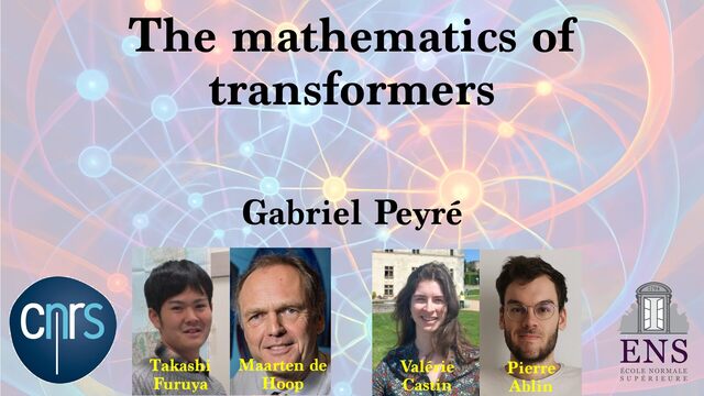 cloud Positional encoding Token encoding Tokenize Tell the story of a C N R S r e s e a r c h e r presenting generative AI to a large audience in a funny way. Tell the story of a C N R S r e s e a r c h e r presenting generative AI to a large audience in a funny way. <latexit sha1_base64="aTL0Qvb1dLhAur6wfZM9PGylzLY=">AAA9iHictVttcxu3EYbTt1h9c9qPnelcq7iTdFyNpHqadjKaifViSbFiySYlOwltDV9O1NknHs0jJdkM/0e/tn+kv6P/oP3Uv9DdBXDAkbhbQHV1IwkH4nl2sQcsdoFjZ5gm+Xh19Z+3Pvje93/wwx99eHvpxz/56c9+fuejX5zk2WTUjY+7WZqNnnfaeZwmg/h4nIzT+PlwFLcvOmn8rPN6Cz9/dhmP8iQbNMdvh/GLi3Z/kJwl3fYYql62iGE6inuz69O10zvLqyur9BMtFtZUYVmon6Pso1+vi5boiUx0xURciFgMxBjKqWiLHK5vxZpYFUOoeyGmUDeCUkKfx2ImlgA7gVYxtGhD7Wv424e7b1XtAO6RMyd0F6Sk8DsCZCTuAiaDdiMoo7SIPp8QM9ZWcU+JE3V7C/87iusCasfiHGo5nG7pi8O+jMWZ+DP1IYE+DakGe9dVLBOyCmoeWb0aA8MQ6rDcg89HUO4SUts5IkxOfUfbtunzf1FLrMX7rmo7Ef8mLe/CFYmG6n1WMLTFJfFH9DQn8JnUJwXJfWCIVR+xdEW2vqDeD6D9FOofwzWjkrZJB64p1c5qkVtwuZBbLHIXLhdyl0UewOVCHrDII7hcyCOFROyIbO7GN+By4Rus5CdwuZBPWORTuFzIpyzyBC4X8oRFfgOXC/kNi3wIlwv5kEU+gsuFfMQim3C5kE0WeQyXC3nMInfgciF3FLJ6po7gyognYWblAyiXZaCnSKHmAavfJnlHF3bTY053K7D8rN6G/27stodN4wrsjse4O6vA8iNvF3ykG8v7oj1aTVzYPRa7DyPAjd1nsV+KVxXYLz1m2usKLD/XDqCdG8t736/gzo39isU+hpIby69Rh1Djxh56rBjDCuwRi30i3lRgfbz+qALL+/0G+BU3ll+nmtDejfXxppMKLO9PTyCCcWP51eoZ1Lqxz1jsc3FdgX3OYr8G7+7Gfu2xwr6rwOo1dolWkD7FIzHM2Dq2djErsTQEtjYjPy3WlpRi4w7Uc5h+gekT5oJF7BaIXU/EQYE48NYrL/xoTvEuL6VRIBqeiE6xNmFpzLbvFe2xlHogtgvE9hyiLiLFZ637cknRha7hkONi5cKST5+ywn9jKVbjod7zasRhCSHH9jmN/HuULWEGhZaqYzsv1niJjOi+DnFF2ZvupZbB48aFV7BR1yyq40B1WNRbB+oti5o4UBMWdelAXbIoM/NtXMtjBBj747OY0p0cATJGrr4iiAoewKqzB3M0gvFzBFHgU6o5hP8Nyr25q04zzOZxncRdjhclTzyC0lQsQ73JCrcpv05phsWgmWx5qHJ8vMO9jamac9ILz4qVPCp2TPx5EtKnX/BgtBjRfArjeUQ1M4ruZCkMv1fMe10Kw++QxWcUxctSGH6stB/fQPemwjZvgG3AbBoq65tyKIfcf5EcurxEqy56XHyqF2rMIN91IP++ejL7N3guW1SS9jHlMI7c6l9e6l8Ih7Fzbtk5jAWjJxn16lIU3JOByntNOVSHjFbRgdLD3IU+GWzTU09Gl8M4jiDi2qKce2qVQ0fvsOiNKYdxnAi57zmjSF6Xwzj6dC/tYcphHLjb0lZ5vimHena0gMydTTnUqw9oFxj3gOSYlzUmKhpRnDRRbAnFB/W7NXbMv7iO4Z7NyyJHqGcysW01T6dYy+o10vFCDF5tHKgHxhcTKwYrc0zFOptfSR3GpfV9kces8Wj5A7BiBLNfngFwe+YpaKj3JNB7p8C4xmZd5Z5p3DqLw1FyNodqqdoxGy0auXLXqFx3SrVcXmZ6a+zYIn+d09gbUkx4QJbl7HBQ+YSrGDkLHZQsxPOF2O6dmq9l66+yuOEcYliMtC6dCMmTtPo81WX1hmXju+qUZwyXPPMx4xd3m8+Ut8GcJyNfhLrUybTb6X0kuw7X1XvC7HHLzyJ6ouivLslrJHQilbNZqN4tltH4lO4N9zGdyaEMydGF5xgplqGQp2a4i4776RF5VNvfcrLRXnqHTpZz8rraH9ej+xa670CH5zhbsGI8hlITcoZjuGt6ZDlLha0ysvhI/KE4Hc3oCdZn9GnJQ2oO6W/ikoesy7LPSyxXgMbRILN0f455Ho1vLTDxWb9LH5O7lj3/XTq51efbbRrj1aO5eiemR1LXSWpEs0ae6sq7eQlSg6nzk3WKX+t7ifJCJKIP5aS+tCRLuwzoxD+mDHZIkXFKs42bHeXW9v7U/Cda0pHQZ+d4mp2Rh4zI/0WwPmU0JiP6td8d0Cfo0iOk5CN9/E5SRDeuWCdhx5iJ4xIh32ow4y0mXzYh+ZrXnl05jUWZMch1YDY3trVNDigWjEnqSHl3M7frVx9Emvck7FEiGc1Y+YTkf0p/9a8eJ8sLIwItjE8gV77O9TwyylnQRm1a5et9kG5ra/lxocNLpbVZ/4xOH5c026aMC/XB1boHkrt0L2XhKBmR3vlCG7mO1u3mIvNwzo7Y2zPK4qXf76sVGPW+R6vkMs25Fo2SPoyCcZFF6LbcLvK83HpZZXY/7vz/wm5sXbYaMkbC7OBKC3H7+zFla7aWKYxqOX5f02xyW30016pezoDG4oU1l7+D2t/AX623vvfj6ZS8wiaNAclg7oxFZE200MJP1mZJlh6ZmsvcG3lmTOpWds1N8mvp3UyOfRnMckSj5lrtWujyTTheWRyvPG3YpLNGY0Vdrz3RKZtbNNVppa+8EGnNAOYJy8xHZBqVeGhp51J+rD2Wlc/xNeody7XKcrVhttqnAfac90G65/r87P6uWN0j8ZBimy5FYDJ/6dEsTSjm0rX1mZpkQMn3lX+1Z3+LalB6hzwoMsv3OHHGyFOnLl2zQtPfqZUtIz9vPIJ+b+lKtdE+tkXlPy4gL2hO5DQvNeI+tYiV/rYe0ZxHWrFijoh2/tsUU8m4oz5ntlubZxKV4gmTb8pZZWTJTGFA9ud23vYXstd9K3+NKCecqOi6A1zhTxgZJEbvJLgjy5yeEK5y8iRBRrQd8p+Lfkqe4g0sjVZI66nY8PAxMus1Y90eW7rHum+/h5ZodfPUXS14eam3RE7eTU702rSqXagYdTp3fzOutlrlyvd1dpjMyTX2mFAbO7MwWV4Z0xKfe0uRGoVJkRgfKWG9CNE/TPMQneXplC+zbq2ZyzsN0secU77EvQeKCFd094kzmvuU6Udnga9DWJtN1nBMuBuXqf0B29PirtTthXVI1t6uXY1SayWqWik0u71aGP8tPWRM3i8V3J6NbG3r3iplKfwujGToCvlGb1V+aHN+Dhf+jYQrO9QSffYOGxDfPhBbYuc9vA3xRpXljmZENegLenO5d1v1s9yi3kZvLHab30eCv4wEbM1pn9BKGqq7ZOY1t9n9+a/IC4xEzGpvWob3wZbC92RRUkh/EvJsfG8Sob+LE9oXLcGnJ2Up/nLkuQbXizOhv9MU1gfNzvegLCFEhn6Pwe+Zm9bhsmxJ9fZalOIrQ64C+sRF4/DkrzpXMe18PNTIeiLvXwJ6h7Madr1a/K/90HKMpHBZvtJy+q7ZK4+nLtvFakcW4+HwOWOk+Yzmaon+MrOidyZacsuTcV8U9KQyqzfvnx/jUTMGtKypkPugvHYSb48io68vC54LuHTIxH/EP27x30Z4U3BU6RHCpM8pqtl0C55Nf+PS1Tv9mY9OhqdKpzKbySMa9EbsltgXD+F3q4gAQ98Old+llP8R6/7+bA9qz8h76F10uXPQorqYdj/MKVqP7tUe4+md5bX5byEvFk7WV9b+tHL/yf3lLzbVN5Q/FL8Sv4W8ZE18Jr4Qe9DfYzpX+Kv4m/j7xtLG6sZnG3+RTT+4pTC/FKWfjc3/Ajzs2dE=</latexit> x1 ˜ xi := ∑ j e⟨Qxi ,Kxj ⟩ ∑ ℓ e⟨Qxi ,Kxℓ ⟩ Vxj xi xj (Unmasked) Attention layer Tokenize xn {xi }n i=1 Arbitrary number of Tokens Layers n → + ∞ T → + ∞ … next token probabilities Attention Norm MLP Classif … T ×