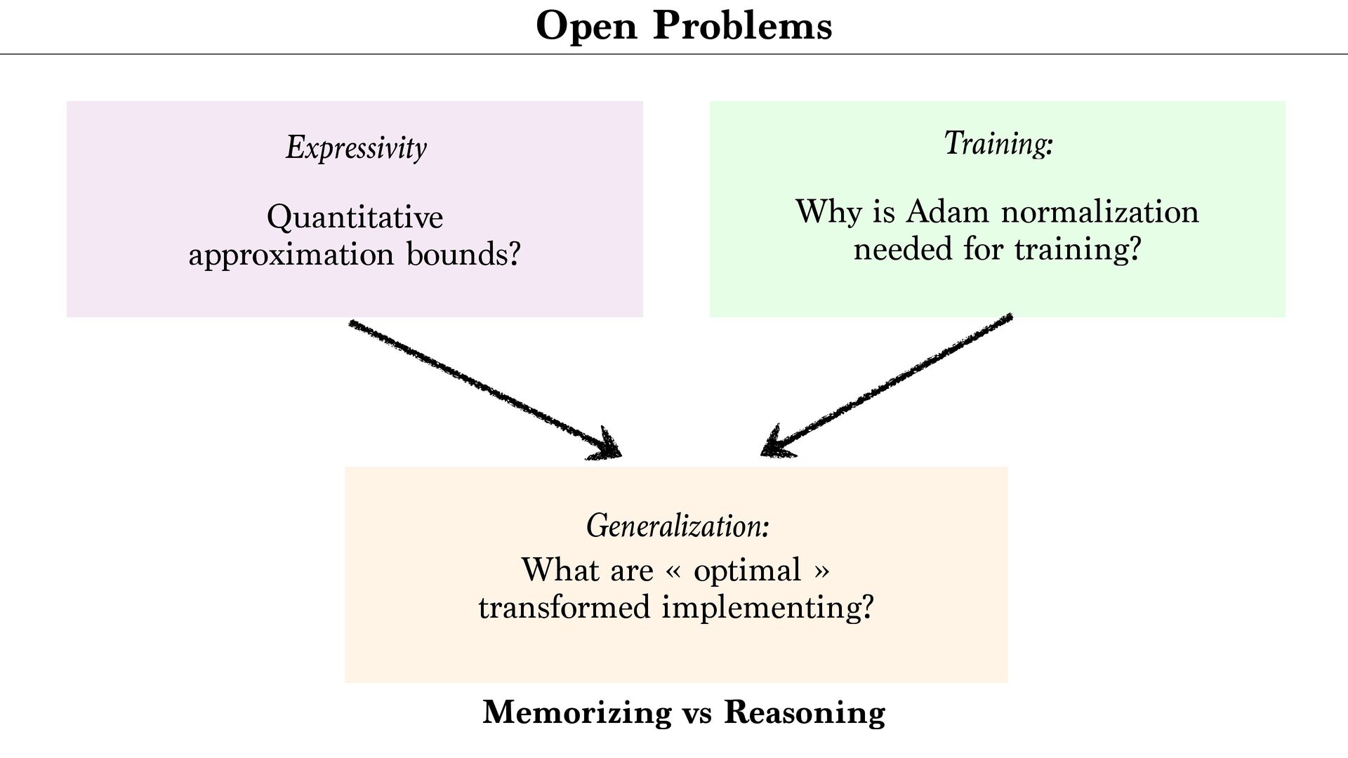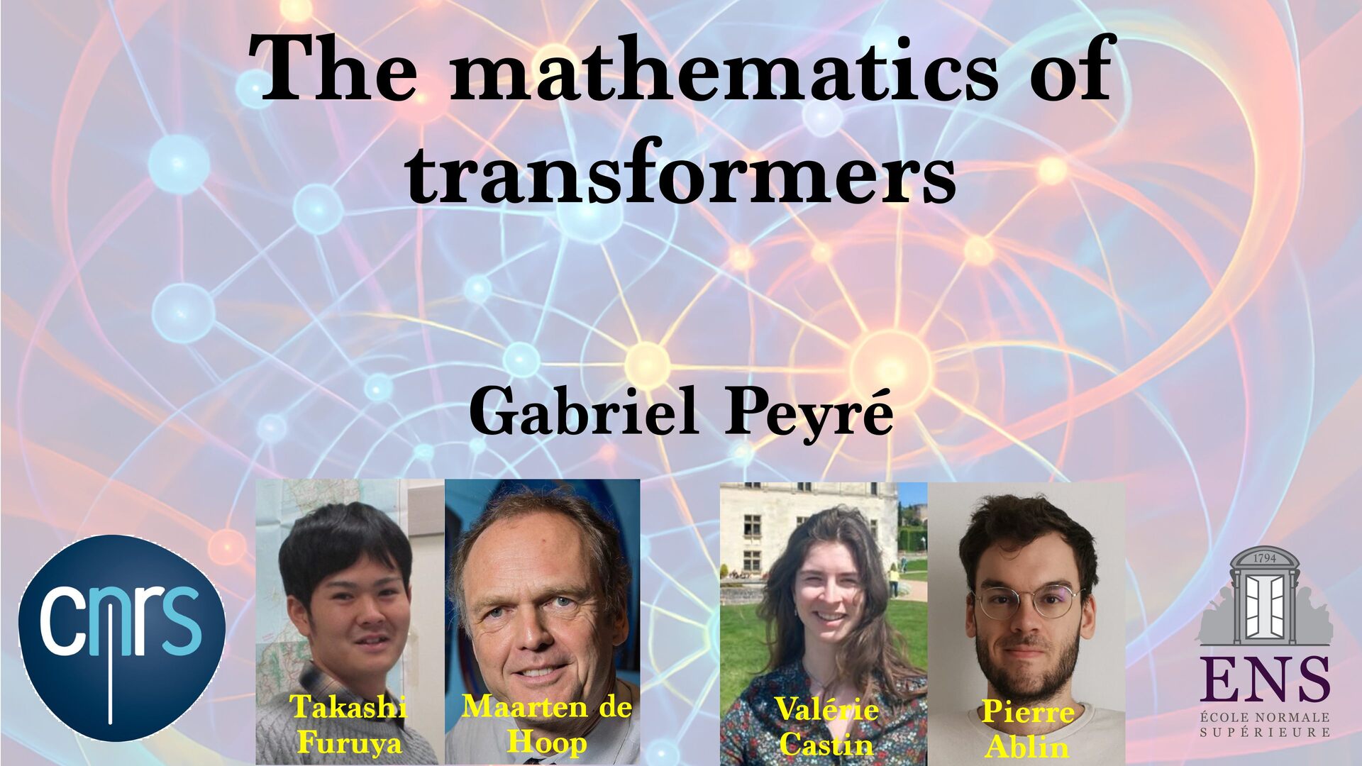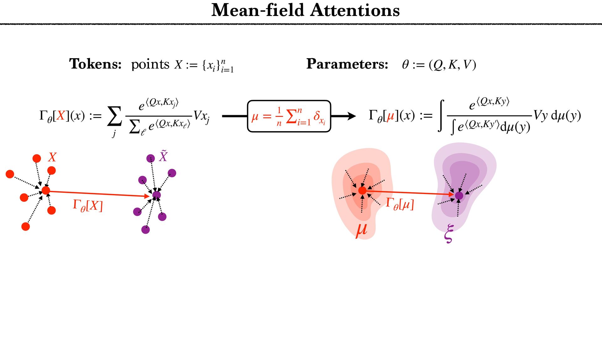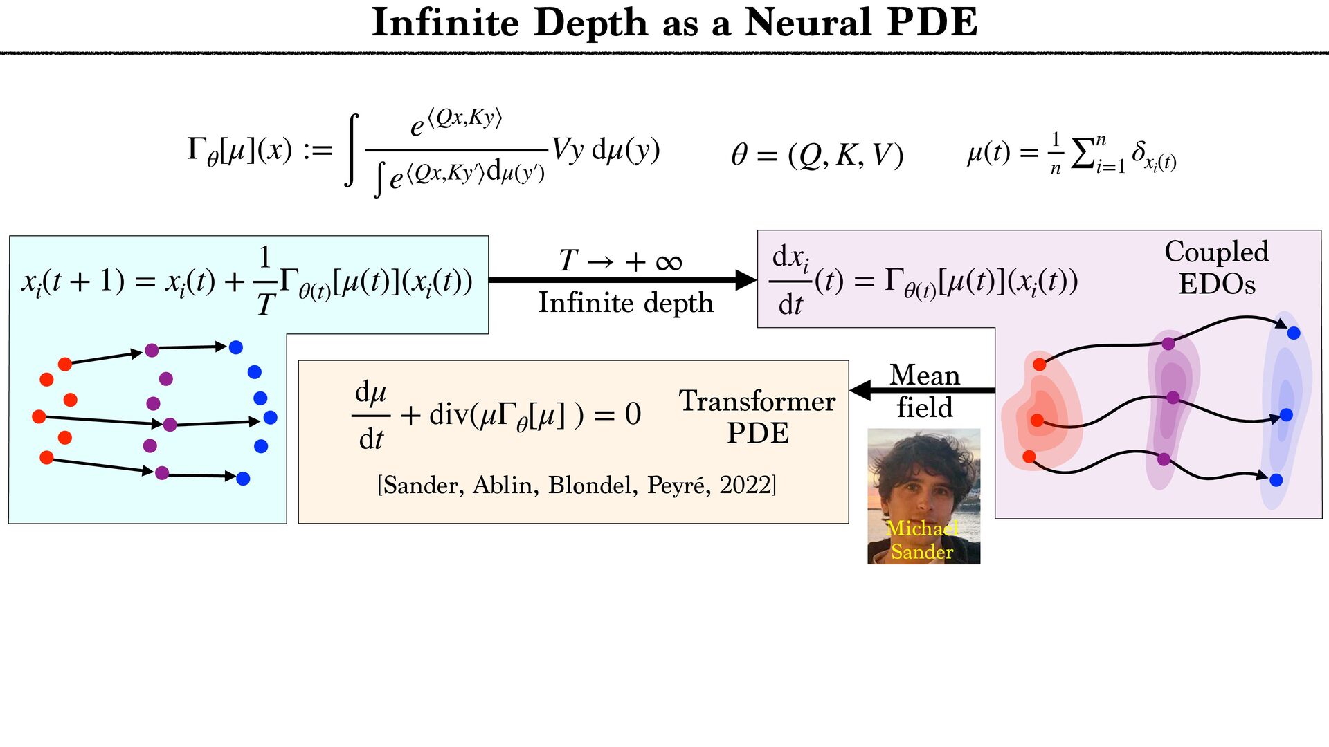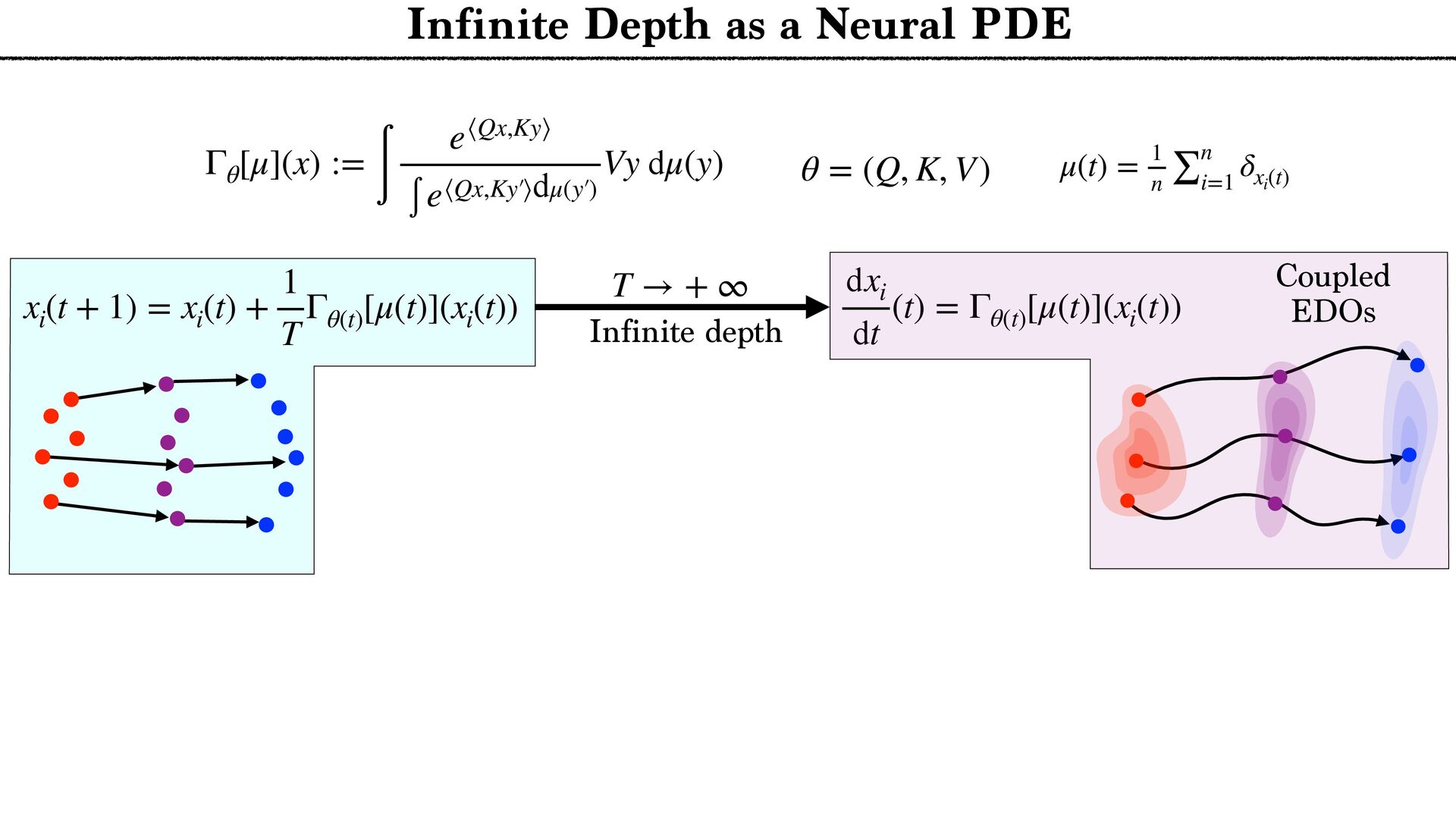 cloud Positional encoding Token encoding Tokenize Tell the story of a C N R S r e s e a r c h e r presenting generative AI to a large audience in a funny way. Tell the story of a C N R S r e s e a r c h e r presenting generative AI to a large audience in a funny way. <latexit sha1_base64="aTL0Qvb1dLhAur6wfZM9PGylzLY=">AAA9iHictVttcxu3EYbTt1h9c9qPnelcq7iTdFyNpHqadjKaifViSbFiySYlOwltDV9O1NknHs0jJdkM/0e/tn+kv6P/oP3Uv9DdBXDAkbhbQHV1IwkH4nl2sQcsdoFjZ5gm+Xh19Z+3Pvje93/wwx99eHvpxz/56c9+fuejX5zk2WTUjY+7WZqNnnfaeZwmg/h4nIzT+PlwFLcvOmn8rPN6Cz9/dhmP8iQbNMdvh/GLi3Z/kJwl3fYYql62iGE6inuz69O10zvLqyur9BMtFtZUYVmon6Pso1+vi5boiUx0xURciFgMxBjKqWiLHK5vxZpYFUOoeyGmUDeCUkKfx2ImlgA7gVYxtGhD7Wv424e7b1XtAO6RMyd0F6Sk8DsCZCTuAiaDdiMoo7SIPp8QM9ZWcU+JE3V7C/87iusCasfiHGo5nG7pi8O+jMWZ+DP1IYE+DakGe9dVLBOyCmoeWb0aA8MQ6rDcg89HUO4SUts5IkxOfUfbtunzf1FLrMX7rmo7Ef8mLe/CFYmG6n1WMLTFJfFH9DQn8JnUJwXJfWCIVR+xdEW2vqDeD6D9FOofwzWjkrZJB64p1c5qkVtwuZBbLHIXLhdyl0UewOVCHrDII7hcyCOFROyIbO7GN+By4Rus5CdwuZBPWORTuFzIpyzyBC4X8oRFfgOXC/kNi3wIlwv5kEU+gsuFfMQim3C5kE0WeQyXC3nMInfgciF3FLJ6po7gyognYWblAyiXZaCnSKHmAavfJnlHF3bTY053K7D8rN6G/27stodN4wrsjse4O6vA8iNvF3ykG8v7oj1aTVzYPRa7DyPAjd1nsV+KVxXYLz1m2usKLD/XDqCdG8t736/gzo39isU+hpIby69Rh1Djxh56rBjDCuwRi30i3lRgfbz+qALL+/0G+BU3ll+nmtDejfXxppMKLO9PTyCCcWP51eoZ1Lqxz1jsc3FdgX3OYr8G7+7Gfu2xwr6rwOo1dolWkD7FIzHM2Dq2djErsTQEtjYjPy3WlpRi4w7Uc5h+gekT5oJF7BaIXU/EQYE48NYrL/xoTvEuL6VRIBqeiE6xNmFpzLbvFe2xlHogtgvE9hyiLiLFZ637cknRha7hkONi5cKST5+ywn9jKVbjod7zasRhCSHH9jmN/HuULWEGhZaqYzsv1niJjOi+DnFF2ZvupZbB48aFV7BR1yyq40B1WNRbB+oti5o4UBMWdelAXbIoM/NtXMtjBBj747OY0p0cATJGrr4iiAoewKqzB3M0gvFzBFHgU6o5hP8Nyr25q04zzOZxncRdjhclTzyC0lQsQ73JCrcpv05phsWgmWx5qHJ8vMO9jamac9ILz4qVPCp2TPx5EtKnX/BgtBjRfArjeUQ1M4ruZCkMv1fMe10Kw++QxWcUxctSGH6stB/fQPemwjZvgG3AbBoq65tyKIfcf5EcurxEqy56XHyqF2rMIN91IP++ejL7N3guW1SS9jHlMI7c6l9e6l8Ih7Fzbtk5jAWjJxn16lIU3JOByntNOVSHjFbRgdLD3IU+GWzTU09Gl8M4jiDi2qKce2qVQ0fvsOiNKYdxnAi57zmjSF6Xwzj6dC/tYcphHLjb0lZ5vimHena0gMydTTnUqw9oFxj3gOSYlzUmKhpRnDRRbAnFB/W7NXbMv7iO4Z7NyyJHqGcysW01T6dYy+o10vFCDF5tHKgHxhcTKwYrc0zFOptfSR3GpfV9kces8Wj5A7BiBLNfngFwe+YpaKj3JNB7p8C4xmZd5Z5p3DqLw1FyNodqqdoxGy0auXLXqFx3SrVcXmZ6a+zYIn+d09gbUkx4QJbl7HBQ+YSrGDkLHZQsxPOF2O6dmq9l66+yuOEcYliMtC6dCMmTtPo81WX1hmXju+qUZwyXPPMx4xd3m8+Ut8GcJyNfhLrUybTb6X0kuw7X1XvC7HHLzyJ6ouivLslrJHQilbNZqN4tltH4lO4N9zGdyaEMydGF5xgplqGQp2a4i4776RF5VNvfcrLRXnqHTpZz8rraH9ej+xa670CH5zhbsGI8hlITcoZjuGt6ZDlLha0ysvhI/KE4Hc3oCdZn9GnJQ2oO6W/ikoesy7LPSyxXgMbRILN0f455Ho1vLTDxWb9LH5O7lj3/XTq51efbbRrj1aO5eiemR1LXSWpEs0ae6sq7eQlSg6nzk3WKX+t7ifJCJKIP5aS+tCRLuwzoxD+mDHZIkXFKs42bHeXW9v7U/Cda0pHQZ+d4mp2Rh4zI/0WwPmU0JiP6td8d0Cfo0iOk5CN9/E5SRDeuWCdhx5iJ4xIh32ow4y0mXzYh+ZrXnl05jUWZMch1YDY3trVNDigWjEnqSHl3M7frVx9Emvck7FEiGc1Y+YTkf0p/9a8eJ8sLIwItjE8gV77O9TwyylnQRm1a5et9kG5ra/lxocNLpbVZ/4xOH5c026aMC/XB1boHkrt0L2XhKBmR3vlCG7mO1u3mIvNwzo7Y2zPK4qXf76sVGPW+R6vkMs25Fo2SPoyCcZFF6LbcLvK83HpZZXY/7vz/wm5sXbYaMkbC7OBKC3H7+zFla7aWKYxqOX5f02xyW30016pezoDG4oU1l7+D2t/AX623vvfj6ZS8wiaNAclg7oxFZE200MJP1mZJlh6ZmsvcG3lmTOpWds1N8mvp3UyOfRnMckSj5lrtWujyTTheWRyvPG3YpLNGY0Vdrz3RKZtbNNVppa+8EGnNAOYJy8xHZBqVeGhp51J+rD2Wlc/xNeody7XKcrVhttqnAfac90G65/r87P6uWN0j8ZBimy5FYDJ/6dEsTSjm0rX1mZpkQMn3lX+1Z3+LalB6hzwoMsv3OHHGyFOnLl2zQtPfqZUtIz9vPIJ+b+lKtdE+tkXlPy4gL2hO5DQvNeI+tYiV/rYe0ZxHWrFijoh2/tsUU8m4oz5ntlubZxKV4gmTb8pZZWTJTGFA9ud23vYXstd9K3+NKCecqOi6A1zhTxgZJEbvJLgjy5yeEK5y8iRBRrQd8p+Lfkqe4g0sjVZI66nY8PAxMus1Y90eW7rHum+/h5ZodfPUXS14eam3RE7eTU702rSqXagYdTp3fzOutlrlyvd1dpjMyTX2mFAbO7MwWV4Z0xKfe0uRGoVJkRgfKWG9CNE/TPMQneXplC+zbq2ZyzsN0secU77EvQeKCFd094kzmvuU6Udnga9DWJtN1nBMuBuXqf0B29PirtTthXVI1t6uXY1SayWqWik0u71aGP8tPWRM3i8V3J6NbG3r3iplKfwujGToCvlGb1V+aHN+Dhf+jYQrO9QSffYOGxDfPhBbYuc9vA3xRpXljmZENegLenO5d1v1s9yi3kZvLHab30eCv4wEbM1pn9BKGqq7ZOY1t9n9+a/IC4xEzGpvWob3wZbC92RRUkh/EvJsfG8Sob+LE9oXLcGnJ2Up/nLkuQbXizOhv9MU1gfNzvegLCFEhn6Pwe+Zm9bhsmxJ9fZalOIrQ64C+sRF4/DkrzpXMe18PNTIeiLvXwJ6h7Madr1a/K/90HKMpHBZvtJy+q7ZK4+nLtvFakcW4+HwOWOk+Yzmaon+MrOidyZacsuTcV8U9KQyqzfvnx/jUTMGtKypkPugvHYSb48io68vC54LuHTIxH/EP27x30Z4U3BU6RHCpM8pqtl0C55Nf+PS1Tv9mY9OhqdKpzKbySMa9EbsltgXD+F3q4gAQ98Old+llP8R6/7+bA9qz8h76F10uXPQorqYdj/MKVqP7tUe4+md5bX5byEvFk7WV9b+tHL/yf3lLzbVN5Q/FL8Sv4W8ZE18Jr4Qe9DfYzpX+Kv4m/j7xtLG6sZnG3+RTT+4pTC/FKWfjc3/Ajzs2dE=</latexit> x1 ˜ xi := ∑ j e⟨Qxi ,Kxj ⟩ ∑ ℓ e⟨Qxi ,Kxℓ ⟩ Vxj xi xj (Unmasked) Attention layer Tokenize xn {xi }n i=1 Arbitrary number of Tokens Layers n → + ∞ T → + ∞ … next token probabilities Attention Norm MLP Classif … T ×