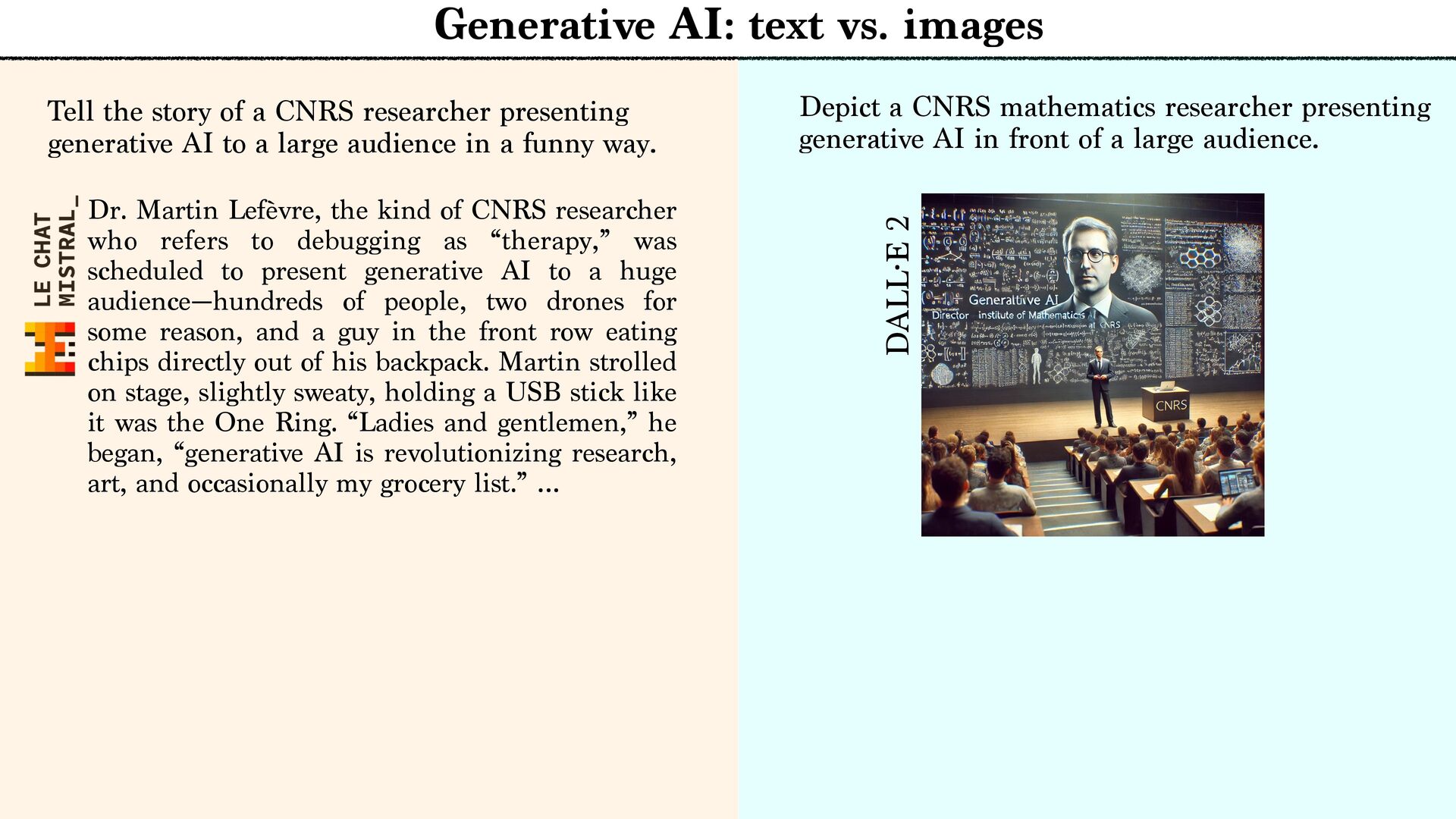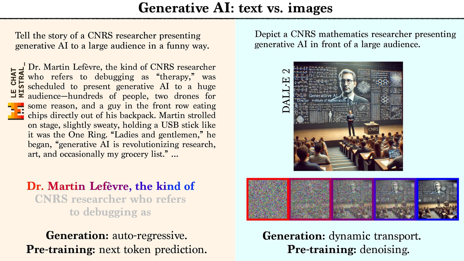 CNRS researcher presenting generative AI to a large audience in a funny way. Dr. Martin Lefèvre, the kind of CNRS researcher who refers to debugging as “therapy,” was scheduled to present generative AI to a huge audience—hundreds of people, two drones for some reason, and a guy in the front row eating chips directly out of his backpack. Martin strolled on stage, slightly sweaty, holding a USB stick like it was the One Ring. “Ladies and gentlemen,” he began, “generative AI is revolutionizing research, art, and occasionally my grocery list.” … Depict a CNRS mathematics researcher presenting generative AI in front of a large audience. DALL·E 2 Pre-training: denoising. Generation: dynamic transport. Pre-training: next token prediction. Generation: auto-regressive. Dr. Martin Lefèvre, the kind of CNRS researcher who refers to debugging as