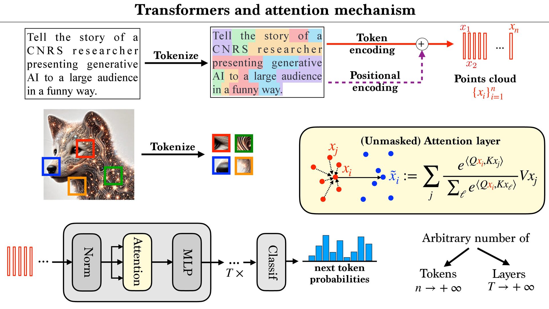 cloud Positional encoding Token encoding Tokenize Tell the story of a C N R S r e s e a r c h e r presenting generative AI to a large audience in a funny way. Tell the story of a C N R S r e s e a r c h e r presenting generative AI to a large audience in a funny way. <latexit sha1_base64="aTL0Qvb1dLhAur6wfZM9PGylzLY=">AAA9iHictVttcxu3EYbTt1h9c9qPnelcq7iTdFyNpHqadjKaifViSbFiySYlOwltDV9O1NknHs0jJdkM/0e/tn+kv6P/oP3Uv9DdBXDAkbhbQHV1IwkH4nl2sQcsdoFjZ5gm+Xh19Z+3Pvje93/wwx99eHvpxz/56c9+fuejX5zk2WTUjY+7WZqNnnfaeZwmg/h4nIzT+PlwFLcvOmn8rPN6Cz9/dhmP8iQbNMdvh/GLi3Z/kJwl3fYYql62iGE6inuz69O10zvLqyur9BMtFtZUYVmon6Pso1+vi5boiUx0xURciFgMxBjKqWiLHK5vxZpYFUOoeyGmUDeCUkKfx2ImlgA7gVYxtGhD7Wv424e7b1XtAO6RMyd0F6Sk8DsCZCTuAiaDdiMoo7SIPp8QM9ZWcU+JE3V7C/87iusCasfiHGo5nG7pi8O+jMWZ+DP1IYE+DakGe9dVLBOyCmoeWb0aA8MQ6rDcg89HUO4SUts5IkxOfUfbtunzf1FLrMX7rmo7Ef8mLe/CFYmG6n1WMLTFJfFH9DQn8JnUJwXJfWCIVR+xdEW2vqDeD6D9FOofwzWjkrZJB64p1c5qkVtwuZBbLHIXLhdyl0UewOVCHrDII7hcyCOFROyIbO7GN+By4Rus5CdwuZBPWORTuFzIpyzyBC4X8oRFfgOXC/kNi3wIlwv5kEU+gsuFfMQim3C5kE0WeQyXC3nMInfgciF3FLJ6po7gyognYWblAyiXZaCnSKHmAavfJnlHF3bTY053K7D8rN6G/27stodN4wrsjse4O6vA8iNvF3ykG8v7oj1aTVzYPRa7DyPAjd1nsV+KVxXYLz1m2usKLD/XDqCdG8t736/gzo39isU+hpIby69Rh1Djxh56rBjDCuwRi30i3lRgfbz+qALL+/0G+BU3ll+nmtDejfXxppMKLO9PTyCCcWP51eoZ1Lqxz1jsc3FdgX3OYr8G7+7Gfu2xwr6rwOo1dolWkD7FIzHM2Dq2djErsTQEtjYjPy3WlpRi4w7Uc5h+gekT5oJF7BaIXU/EQYE48NYrL/xoTvEuL6VRIBqeiE6xNmFpzLbvFe2xlHogtgvE9hyiLiLFZ637cknRha7hkONi5cKST5+ywn9jKVbjod7zasRhCSHH9jmN/HuULWEGhZaqYzsv1niJjOi+DnFF2ZvupZbB48aFV7BR1yyq40B1WNRbB+oti5o4UBMWdelAXbIoM/NtXMtjBBj747OY0p0cATJGrr4iiAoewKqzB3M0gvFzBFHgU6o5hP8Nyr25q04zzOZxncRdjhclTzyC0lQsQ73JCrcpv05phsWgmWx5qHJ8vMO9jamac9ILz4qVPCp2TPx5EtKnX/BgtBjRfArjeUQ1M4ruZCkMv1fMe10Kw++QxWcUxctSGH6stB/fQPemwjZvgG3AbBoq65tyKIfcf5EcurxEqy56XHyqF2rMIN91IP++ejL7N3guW1SS9jHlMI7c6l9e6l8Ih7Fzbtk5jAWjJxn16lIU3JOByntNOVSHjFbRgdLD3IU+GWzTU09Gl8M4jiDi2qKce2qVQ0fvsOiNKYdxnAi57zmjSF6Xwzj6dC/tYcphHLjb0lZ5vimHena0gMydTTnUqw9oFxj3gOSYlzUmKhpRnDRRbAnFB/W7NXbMv7iO4Z7NyyJHqGcysW01T6dYy+o10vFCDF5tHKgHxhcTKwYrc0zFOptfSR3GpfV9kces8Wj5A7BiBLNfngFwe+YpaKj3JNB7p8C4xmZd5Z5p3DqLw1FyNodqqdoxGy0auXLXqFx3SrVcXmZ6a+zYIn+d09gbUkx4QJbl7HBQ+YSrGDkLHZQsxPOF2O6dmq9l66+yuOEcYliMtC6dCMmTtPo81WX1hmXju+qUZwyXPPMx4xd3m8+Ut8GcJyNfhLrUybTb6X0kuw7X1XvC7HHLzyJ6ouivLslrJHQilbNZqN4tltH4lO4N9zGdyaEMydGF5xgplqGQp2a4i4776RF5VNvfcrLRXnqHTpZz8rraH9ej+xa670CH5zhbsGI8hlITcoZjuGt6ZDlLha0ysvhI/KE4Hc3oCdZn9GnJQ2oO6W/ikoesy7LPSyxXgMbRILN0f455Ho1vLTDxWb9LH5O7lj3/XTq51efbbRrj1aO5eiemR1LXSWpEs0ae6sq7eQlSg6nzk3WKX+t7ifJCJKIP5aS+tCRLuwzoxD+mDHZIkXFKs42bHeXW9v7U/Cda0pHQZ+d4mp2Rh4zI/0WwPmU0JiP6td8d0Cfo0iOk5CN9/E5SRDeuWCdhx5iJ4xIh32ow4y0mXzYh+ZrXnl05jUWZMch1YDY3trVNDigWjEnqSHl3M7frVx9Emvck7FEiGc1Y+YTkf0p/9a8eJ8sLIwItjE8gV77O9TwyylnQRm1a5et9kG5ra/lxocNLpbVZ/4xOH5c026aMC/XB1boHkrt0L2XhKBmR3vlCG7mO1u3mIvNwzo7Y2zPK4qXf76sVGPW+R6vkMs25Fo2SPoyCcZFF6LbcLvK83HpZZXY/7vz/wm5sXbYaMkbC7OBKC3H7+zFla7aWKYxqOX5f02xyW30016pezoDG4oU1l7+D2t/AX623vvfj6ZS8wiaNAclg7oxFZE200MJP1mZJlh6ZmsvcG3lmTOpWds1N8mvp3UyOfRnMckSj5lrtWujyTTheWRyvPG3YpLNGY0Vdrz3RKZtbNNVppa+8EGnNAOYJy8xHZBqVeGhp51J+rD2Wlc/xNeody7XKcrVhttqnAfac90G65/r87P6uWN0j8ZBimy5FYDJ/6dEsTSjm0rX1mZpkQMn3lX+1Z3+LalB6hzwoMsv3OHHGyFOnLl2zQtPfqZUtIz9vPIJ+b+lKtdE+tkXlPy4gL2hO5DQvNeI+tYiV/rYe0ZxHWrFijoh2/tsUU8m4oz5ntlubZxKV4gmTb8pZZWTJTGFA9ud23vYXstd9K3+NKCecqOi6A1zhTxgZJEbvJLgjy5yeEK5y8iRBRrQd8p+Lfkqe4g0sjVZI66nY8PAxMus1Y90eW7rHum+/h5ZodfPUXS14eam3RE7eTU702rSqXagYdTp3fzOutlrlyvd1dpjMyTX2mFAbO7MwWV4Z0xKfe0uRGoVJkRgfKWG9CNE/TPMQneXplC+zbq2ZyzsN0secU77EvQeKCFd094kzmvuU6Udnga9DWJtN1nBMuBuXqf0B29PirtTthXVI1t6uXY1SayWqWik0u71aGP8tPWRM3i8V3J6NbG3r3iplKfwujGToCvlGb1V+aHN+Dhf+jYQrO9QSffYOGxDfPhBbYuc9vA3xRpXljmZENegLenO5d1v1s9yi3kZvLHab30eCv4wEbM1pn9BKGqq7ZOY1t9n9+a/IC4xEzGpvWob3wZbC92RRUkh/EvJsfG8Sob+LE9oXLcGnJ2Up/nLkuQbXizOhv9MU1gfNzvegLCFEhn6Pwe+Zm9bhsmxJ9fZalOIrQ64C+sRF4/DkrzpXMe18PNTIeiLvXwJ6h7Madr1a/K/90HKMpHBZvtJy+q7ZK4+nLtvFakcW4+HwOWOk+Yzmaon+MrOidyZacsuTcV8U9KQyqzfvnx/jUTMGtKypkPugvHYSb48io68vC54LuHTIxH/EP27x30Z4U3BU6RHCpM8pqtl0C55Nf+PS1Tv9mY9OhqdKpzKbySMa9EbsltgXD+F3q4gAQ98Old+llP8R6/7+bA9qz8h76F10uXPQorqYdj/MKVqP7tUe4+md5bX5byEvFk7WV9b+tHL/yf3lLzbVN5Q/FL8Sv4W8ZE18Jr4Qe9DfYzpX+Kv4m/j7xtLG6sZnG3+RTT+4pTC/FKWfjc3/Ajzs2dE=</latexit> x1 ˜ xi := ∑ j e⟨Qxi ,Kxj ⟩ ∑ ℓ e⟨Qxi ,Kxℓ ⟩ Vxj xi xj (Unmasked) Attention layer Tokenize xn {xi }n i=1 … next token probabilities Attention Norm MLP Classif … T ×