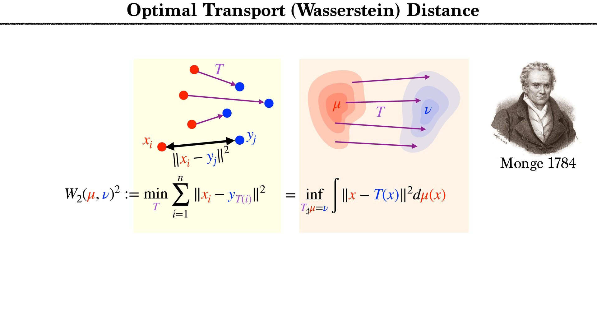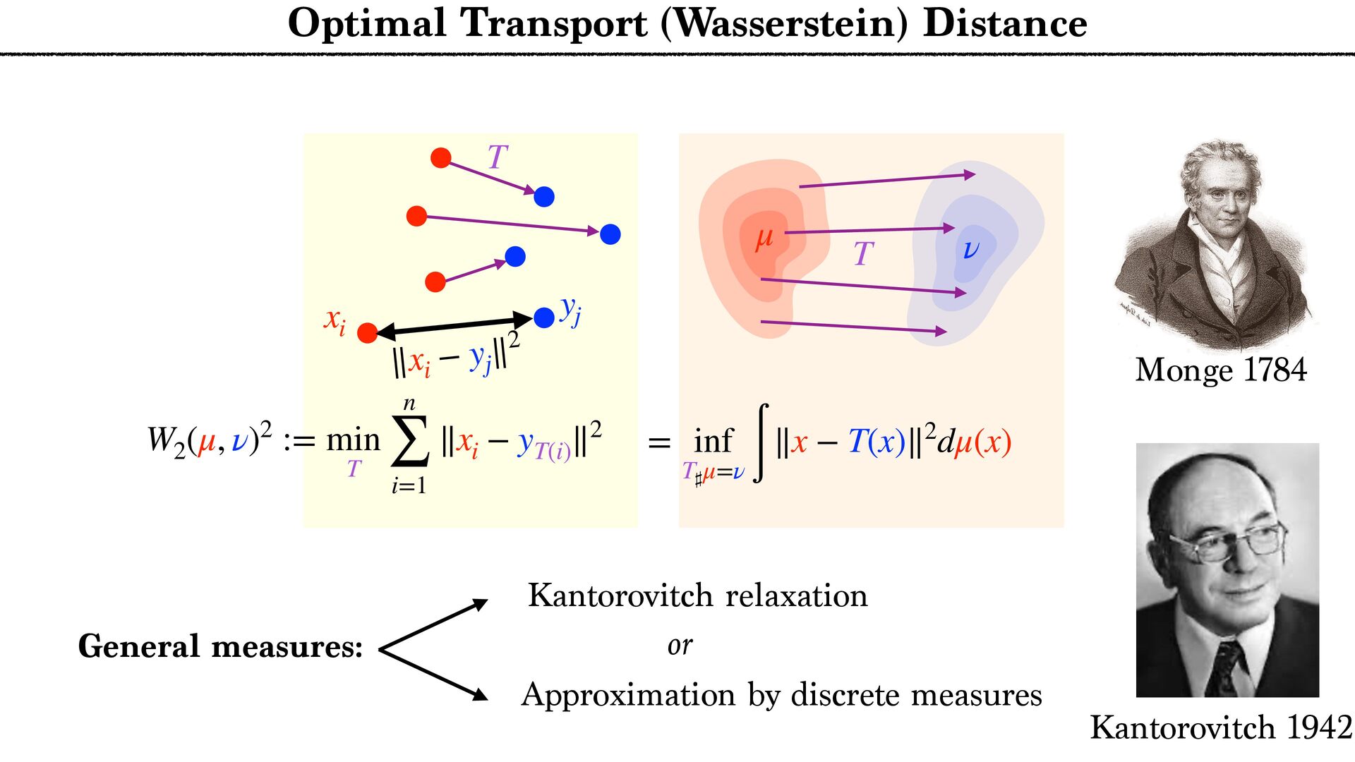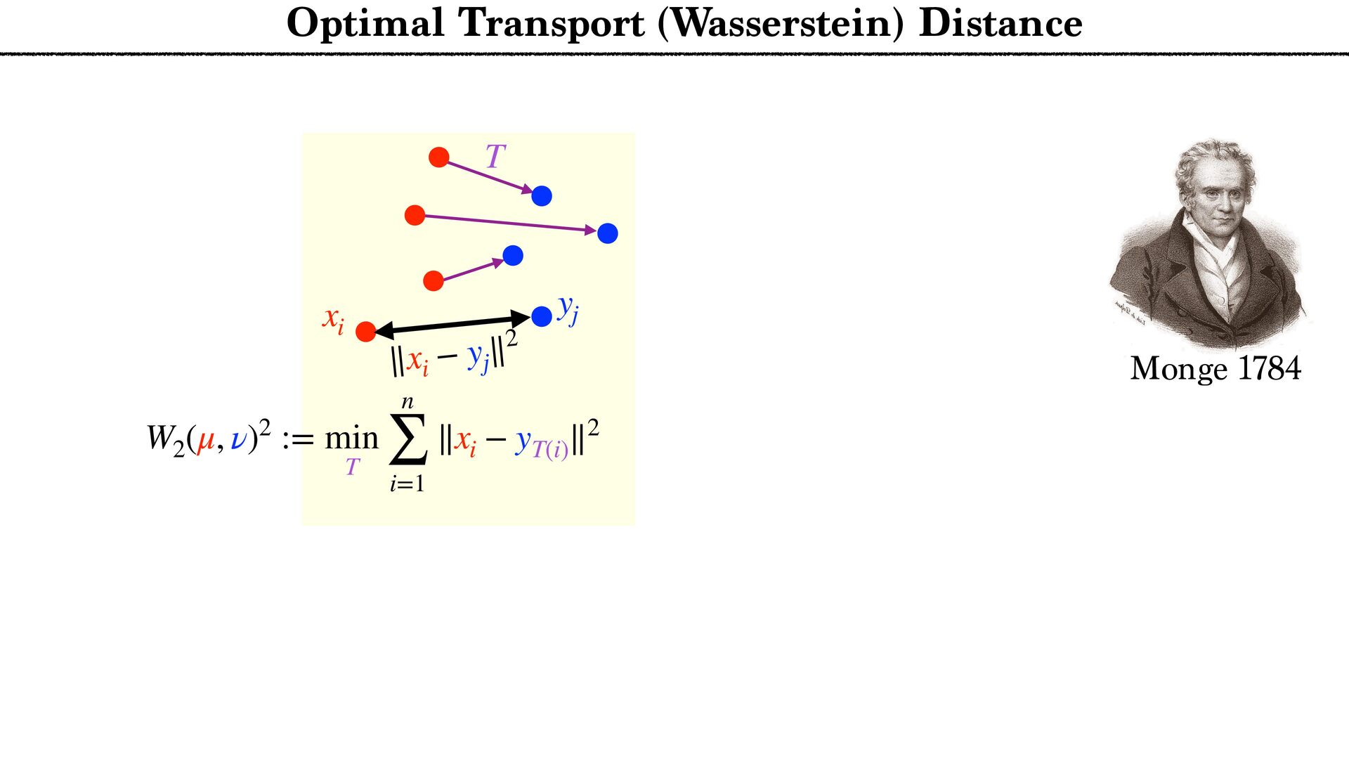 T W2 (μ, ν)2 := min T n ∑ i=1 ∥xi − yT(i) ∥2 Optimal Transport (Wasserstein) Distance ∥xi − yj ∥2 xi yj T Monge 1784 General measures: Kantorovitch relaxation Approximation by discrete measures or Kantorovitch 1942