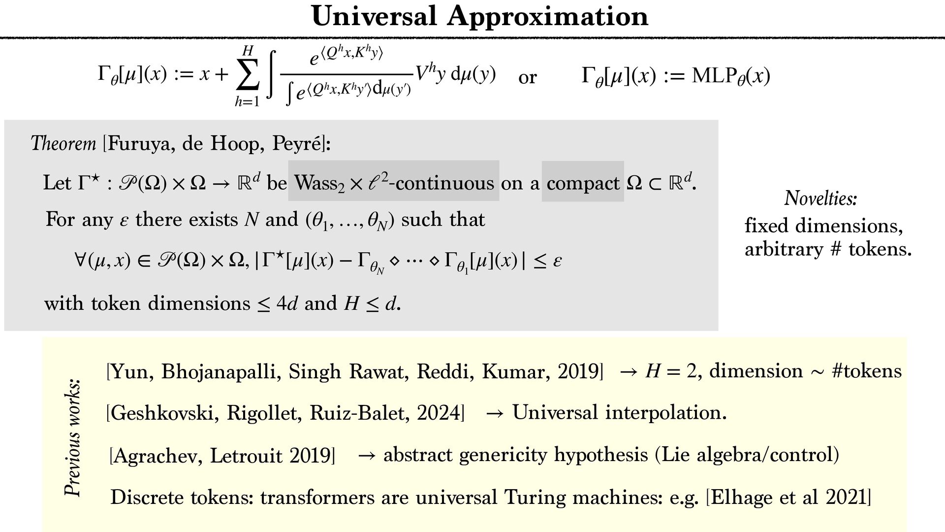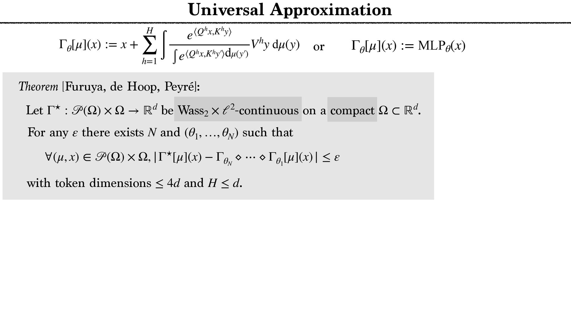 ∫ e⟨Qhx,Khy⟩ ∫ e⟨Qhx,Khy′  ⟩dμ(y′  ) Vhy dμ(y) Theorem [Furuya, de Hoop, Peyré]: Let be -continuous on a compact . Γ⋆ : 𝒫 (Ω) × Ω → ℝd Wass2 × ℓ2 Ω ⊂ ℝd Γθ [μ](x) := MLPθ (x) or For any there exists and such that ε N (θ1 , …, θN ) ∀(μ, x) ∈ 𝒫 (Ω) × Ω, |Γ⋆[μ](x) − ΓθN ⋄ ⋯ ⋄ Γθ1 [μ](x)| ≤ ε with and . token dimensions ≤ 4d H ≤ d