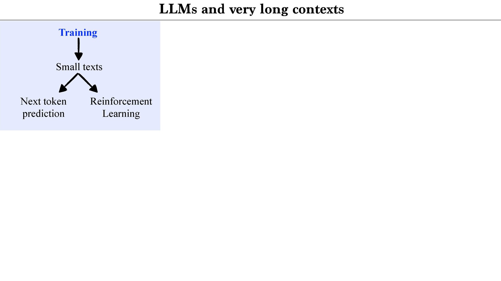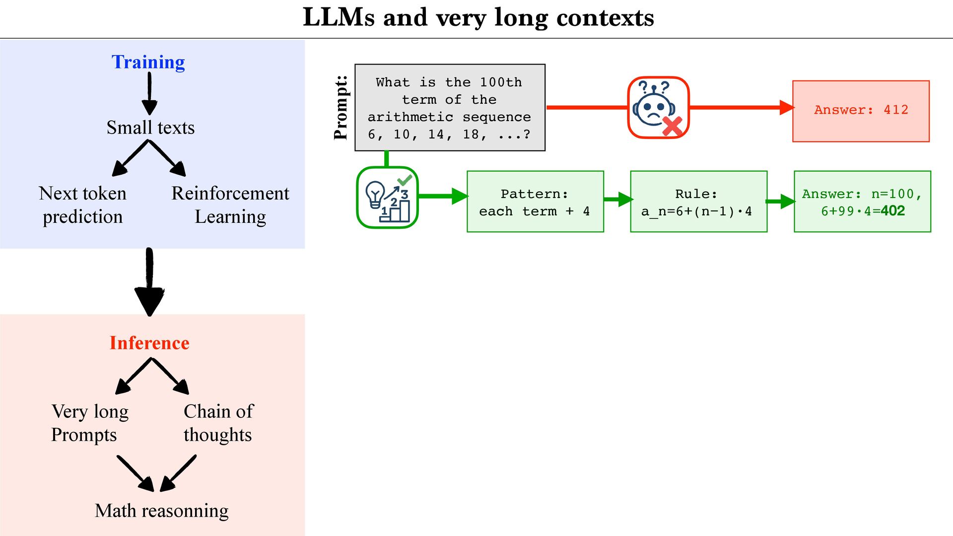 of the arithmetic sequence 6, 10, 14, 18, ...? Answer: 412 Prompt: Pattern: each term + 4 Rule: a_n=6+(n−1)·4 Answer: n=100, 6+99·4=402 Training Small texts Next token prediction Reinforcement Learning Inference Very long Prompts Chain of thoughts Math reasonning