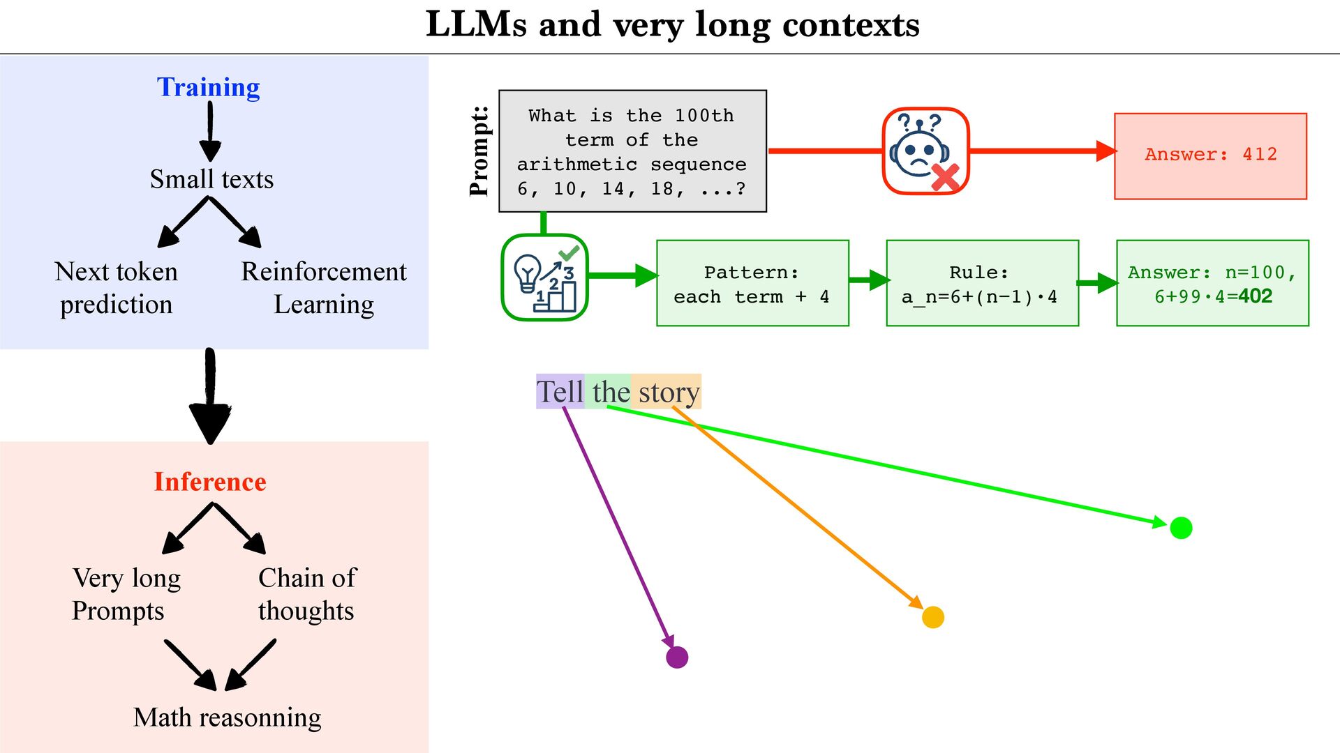 of the arithmetic sequence 6, 10, 14, 18, ...? Answer: 412 Prompt: Pattern: each term + 4 Rule: a_n=6+(n−1)·4 Answer: n=100, 6+99·4=402 Tell the story Training Small texts Next token prediction Reinforcement Learning Inference Very long Prompts Chain of thoughts Math reasonning