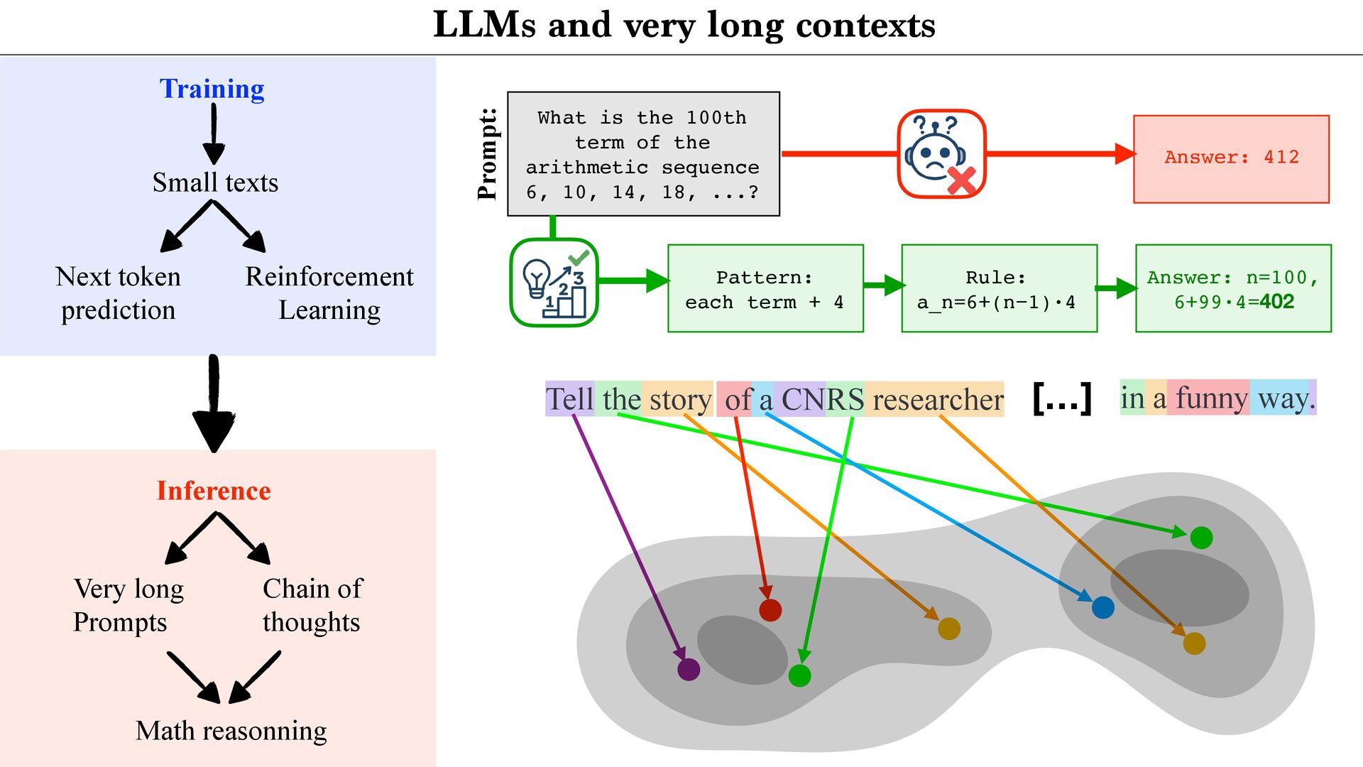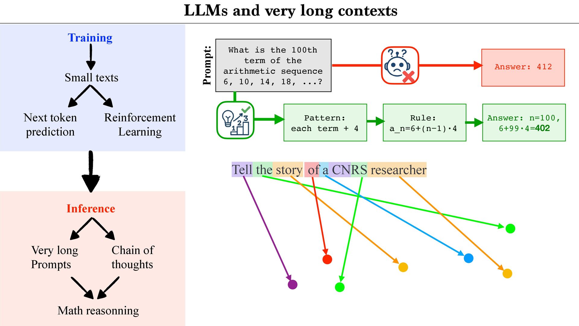 of the arithmetic sequence 6, 10, 14, 18, ...? Answer: 412 Prompt: Pattern: each term + 4 Rule: a_n=6+(n−1)·4 Answer: n=100, 6+99·4=402 Tell the story of a CNRS researcher Training Small texts Next token prediction Reinforcement Learning Inference Very long Prompts Chain of thoughts Math reasonning