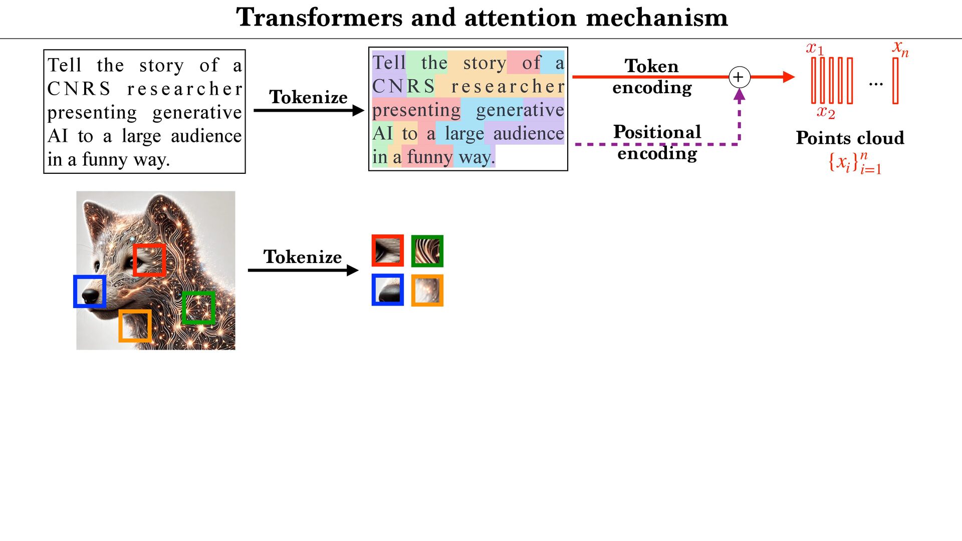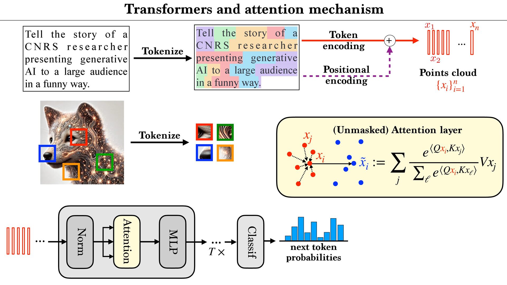 cloud Positional encoding Token encoding Tokenize Tell the story of a C N R S r e s e a r c h e r presenting generative AI to a large audience in a funny way. Tell the story of a C N R S r e s e a r c h e r presenting generative AI to a large audience in a funny way. <latexit sha1_base64="aTL0Qvb1dLhAur6wfZM9PGylzLY=">AAA9iHictVttcxu3EYbTt1h9c9qPnelcq7iTdFyNpHqadjKaifViSbFiySYlOwltDV9O1NknHs0jJdkM/0e/tn+kv6P/oP3Uv9DdBXDAkbhbQHV1IwkH4nl2sQcsdoFjZ5gm+Xh19Z+3Pvje93/wwx99eHvpxz/56c9+fuejX5zk2WTUjY+7WZqNnnfaeZwmg/h4nIzT+PlwFLcvOmn8rPN6Cz9/dhmP8iQbNMdvh/GLi3Z/kJwl3fYYql62iGE6inuz69O10zvLqyur9BMtFtZUYVmon6Pso1+vi5boiUx0xURciFgMxBjKqWiLHK5vxZpYFUOoeyGmUDeCUkKfx2ImlgA7gVYxtGhD7Wv424e7b1XtAO6RMyd0F6Sk8DsCZCTuAiaDdiMoo7SIPp8QM9ZWcU+JE3V7C/87iusCasfiHGo5nG7pi8O+jMWZ+DP1IYE+DakGe9dVLBOyCmoeWb0aA8MQ6rDcg89HUO4SUts5IkxOfUfbtunzf1FLrMX7rmo7Ef8mLe/CFYmG6n1WMLTFJfFH9DQn8JnUJwXJfWCIVR+xdEW2vqDeD6D9FOofwzWjkrZJB64p1c5qkVtwuZBbLHIXLhdyl0UewOVCHrDII7hcyCOFROyIbO7GN+By4Rus5CdwuZBPWORTuFzIpyzyBC4X8oRFfgOXC/kNi3wIlwv5kEU+gsuFfMQim3C5kE0WeQyXC3nMInfgciF3FLJ6po7gyognYWblAyiXZaCnSKHmAavfJnlHF3bTY053K7D8rN6G/27stodN4wrsjse4O6vA8iNvF3ykG8v7oj1aTVzYPRa7DyPAjd1nsV+KVxXYLz1m2usKLD/XDqCdG8t736/gzo39isU+hpIby69Rh1Djxh56rBjDCuwRi30i3lRgfbz+qALL+/0G+BU3ll+nmtDejfXxppMKLO9PTyCCcWP51eoZ1Lqxz1jsc3FdgX3OYr8G7+7Gfu2xwr6rwOo1dolWkD7FIzHM2Dq2djErsTQEtjYjPy3WlpRi4w7Uc5h+gekT5oJF7BaIXU/EQYE48NYrL/xoTvEuL6VRIBqeiE6xNmFpzLbvFe2xlHogtgvE9hyiLiLFZ637cknRha7hkONi5cKST5+ywn9jKVbjod7zasRhCSHH9jmN/HuULWEGhZaqYzsv1niJjOi+DnFF2ZvupZbB48aFV7BR1yyq40B1WNRbB+oti5o4UBMWdelAXbIoM/NtXMtjBBj747OY0p0cATJGrr4iiAoewKqzB3M0gvFzBFHgU6o5hP8Nyr25q04zzOZxncRdjhclTzyC0lQsQ73JCrcpv05phsWgmWx5qHJ8vMO9jamac9ILz4qVPCp2TPx5EtKnX/BgtBjRfArjeUQ1M4ruZCkMv1fMe10Kw++QxWcUxctSGH6stB/fQPemwjZvgG3AbBoq65tyKIfcf5EcurxEqy56XHyqF2rMIN91IP++ejL7N3guW1SS9jHlMI7c6l9e6l8Ih7Fzbtk5jAWjJxn16lIU3JOByntNOVSHjFbRgdLD3IU+GWzTU09Gl8M4jiDi2qKce2qVQ0fvsOiNKYdxnAi57zmjSF6Xwzj6dC/tYcphHLjb0lZ5vimHena0gMydTTnUqw9oFxj3gOSYlzUmKhpRnDRRbAnFB/W7NXbMv7iO4Z7NyyJHqGcysW01T6dYy+o10vFCDF5tHKgHxhcTKwYrc0zFOptfSR3GpfV9kces8Wj5A7BiBLNfngFwe+YpaKj3JNB7p8C4xmZd5Z5p3DqLw1FyNodqqdoxGy0auXLXqFx3SrVcXmZ6a+zYIn+d09gbUkx4QJbl7HBQ+YSrGDkLHZQsxPOF2O6dmq9l66+yuOEcYliMtC6dCMmTtPo81WX1hmXju+qUZwyXPPMx4xd3m8+Ut8GcJyNfhLrUybTb6X0kuw7X1XvC7HHLzyJ6ouivLslrJHQilbNZqN4tltH4lO4N9zGdyaEMydGF5xgplqGQp2a4i4776RF5VNvfcrLRXnqHTpZz8rraH9ej+xa670CH5zhbsGI8hlITcoZjuGt6ZDlLha0ysvhI/KE4Hc3oCdZn9GnJQ2oO6W/ikoesy7LPSyxXgMbRILN0f455Ho1vLTDxWb9LH5O7lj3/XTq51efbbRrj1aO5eiemR1LXSWpEs0ae6sq7eQlSg6nzk3WKX+t7ifJCJKIP5aS+tCRLuwzoxD+mDHZIkXFKs42bHeXW9v7U/Cda0pHQZ+d4mp2Rh4zI/0WwPmU0JiP6td8d0Cfo0iOk5CN9/E5SRDeuWCdhx5iJ4xIh32ow4y0mXzYh+ZrXnl05jUWZMch1YDY3trVNDigWjEnqSHl3M7frVx9Emvck7FEiGc1Y+YTkf0p/9a8eJ8sLIwItjE8gV77O9TwyylnQRm1a5et9kG5ra/lxocNLpbVZ/4xOH5c026aMC/XB1boHkrt0L2XhKBmR3vlCG7mO1u3mIvNwzo7Y2zPK4qXf76sVGPW+R6vkMs25Fo2SPoyCcZFF6LbcLvK83HpZZXY/7vz/wm5sXbYaMkbC7OBKC3H7+zFla7aWKYxqOX5f02xyW30016pezoDG4oU1l7+D2t/AX623vvfj6ZS8wiaNAclg7oxFZE200MJP1mZJlh6ZmsvcG3lmTOpWds1N8mvp3UyOfRnMckSj5lrtWujyTTheWRyvPG3YpLNGY0Vdrz3RKZtbNNVppa+8EGnNAOYJy8xHZBqVeGhp51J+rD2Wlc/xNeody7XKcrVhttqnAfac90G65/r87P6uWN0j8ZBimy5FYDJ/6dEsTSjm0rX1mZpkQMn3lX+1Z3+LalB6hzwoMsv3OHHGyFOnLl2zQtPfqZUtIz9vPIJ+b+lKtdE+tkXlPy4gL2hO5DQvNeI+tYiV/rYe0ZxHWrFijoh2/tsUU8m4oz5ntlubZxKV4gmTb8pZZWTJTGFA9ud23vYXstd9K3+NKCecqOi6A1zhTxgZJEbvJLgjy5yeEK5y8iRBRrQd8p+Lfkqe4g0sjVZI66nY8PAxMus1Y90eW7rHum+/h5ZodfPUXS14eam3RE7eTU702rSqXagYdTp3fzOutlrlyvd1dpjMyTX2mFAbO7MwWV4Z0xKfe0uRGoVJkRgfKWG9CNE/TPMQneXplC+zbq2ZyzsN0secU77EvQeKCFd094kzmvuU6Udnga9DWJtN1nBMuBuXqf0B29PirtTthXVI1t6uXY1SayWqWik0u71aGP8tPWRM3i8V3J6NbG3r3iplKfwujGToCvlGb1V+aHN+Dhf+jYQrO9QSffYOGxDfPhBbYuc9vA3xRpXljmZENegLenO5d1v1s9yi3kZvLHab30eCv4wEbM1pn9BKGqq7ZOY1t9n9+a/IC4xEzGpvWob3wZbC92RRUkh/EvJsfG8Sob+LE9oXLcGnJ2Up/nLkuQbXizOhv9MU1gfNzvegLCFEhn6Pwe+Zm9bhsmxJ9fZalOIrQ64C+sRF4/DkrzpXMe18PNTIeiLvXwJ6h7Madr1a/K/90HKMpHBZvtJy+q7ZK4+nLtvFakcW4+HwOWOk+Yzmaon+MrOidyZacsuTcV8U9KQyqzfvnx/jUTMGtKypkPugvHYSb48io68vC54LuHTIxH/EP27x30Z4U3BU6RHCpM8pqtl0C55Nf+PS1Tv9mY9OhqdKpzKbySMa9EbsltgXD+F3q4gAQ98Old+llP8R6/7+bA9qz8h76F10uXPQorqYdj/MKVqP7tUe4+md5bX5byEvFk7WV9b+tHL/yf3lLzbVN5Q/FL8Sv4W8ZE18Jr4Qe9DfYzpX+Kv4m/j7xtLG6sZnG3+RTT+4pTC/FKWfjc3/Ajzs2dE=</latexit> x1 Tokenize xn {xi }n i=1
