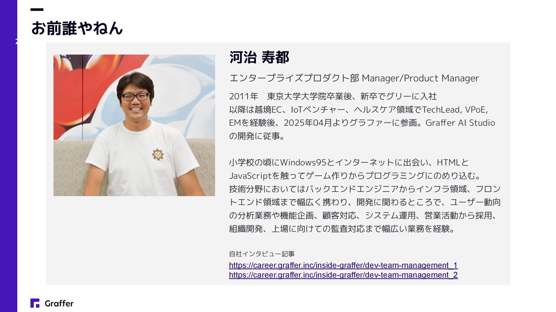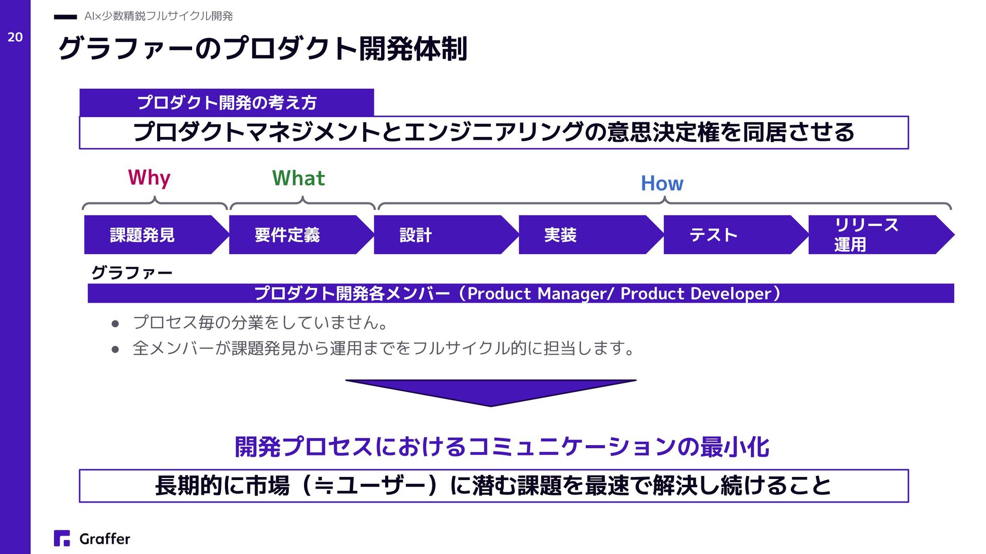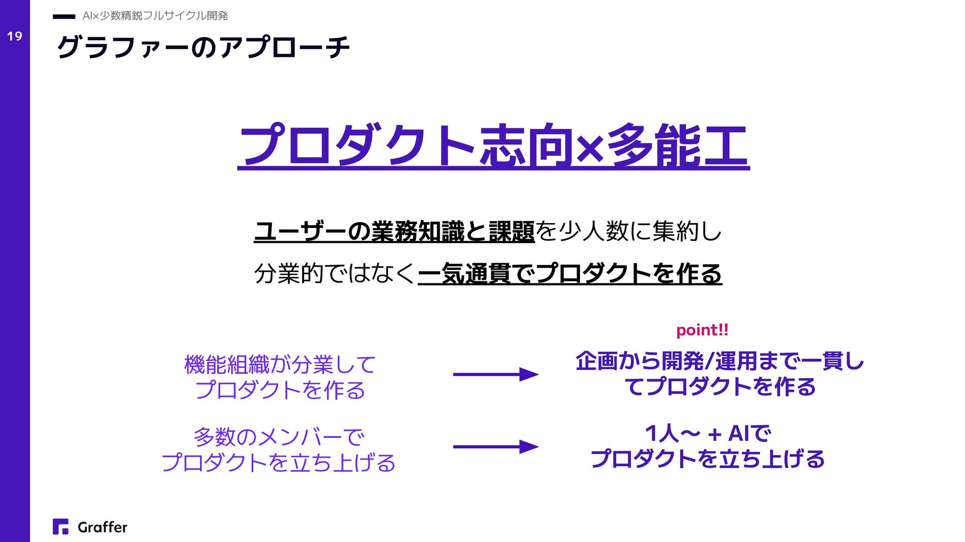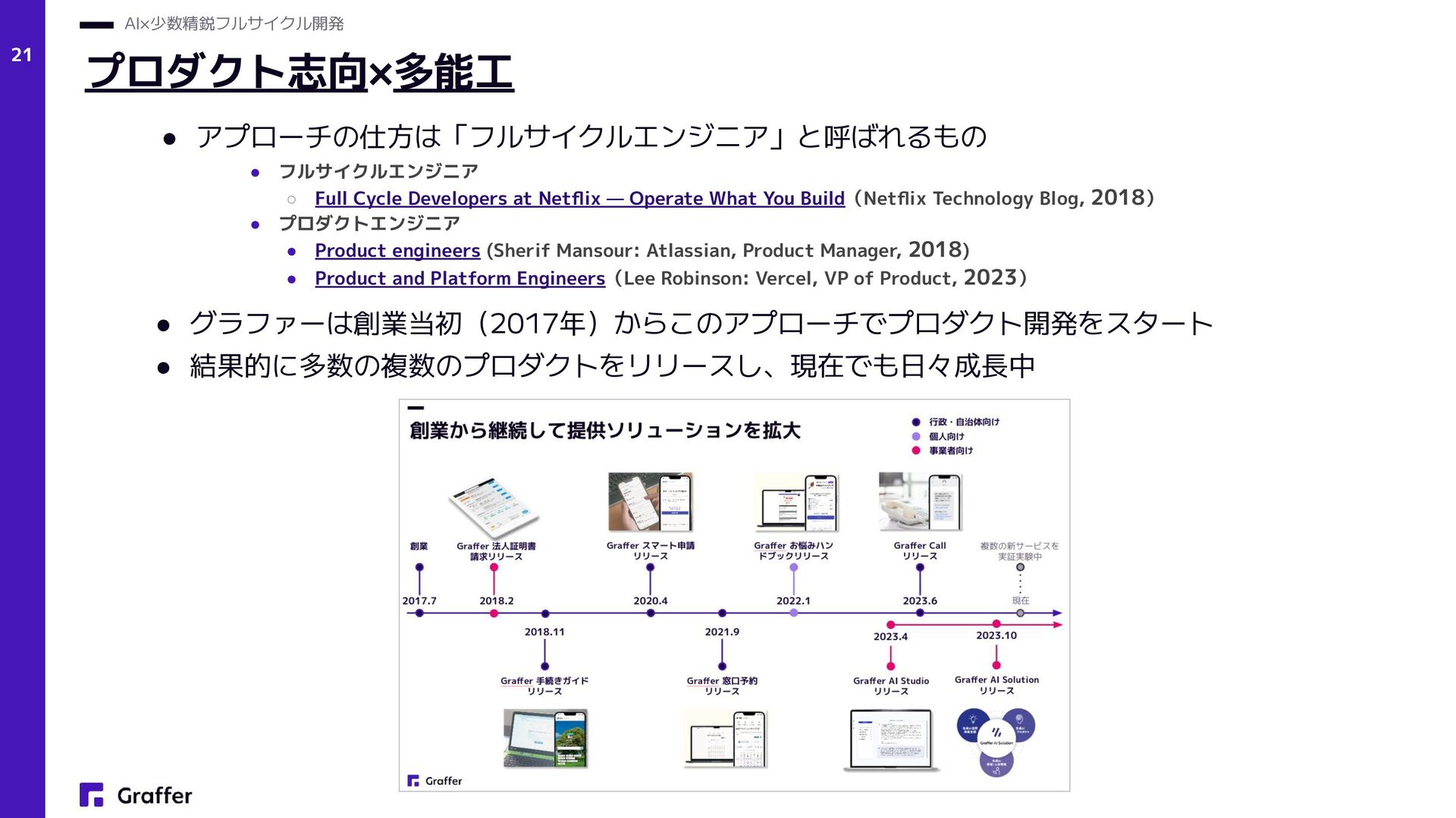 Netflix — Operate What You Build(Netflix Technology Blog, 2018) • プロダクトエンジニア • Product engineers (Sherif Mansour: Atlassian, Product Manager, 2018) • Product and Platform Engineers(Lee Robinson: Vercel, VP of Product, 2023) • グラファーは創業当初(2017年)からこのアプローチでプロダクト開発をスタート • 結果的に多数の複数のプロダクトをリリースし、現在でも日々成長中 プロダクト志向×多能工 AI×少数精鋭フルサイクル開発