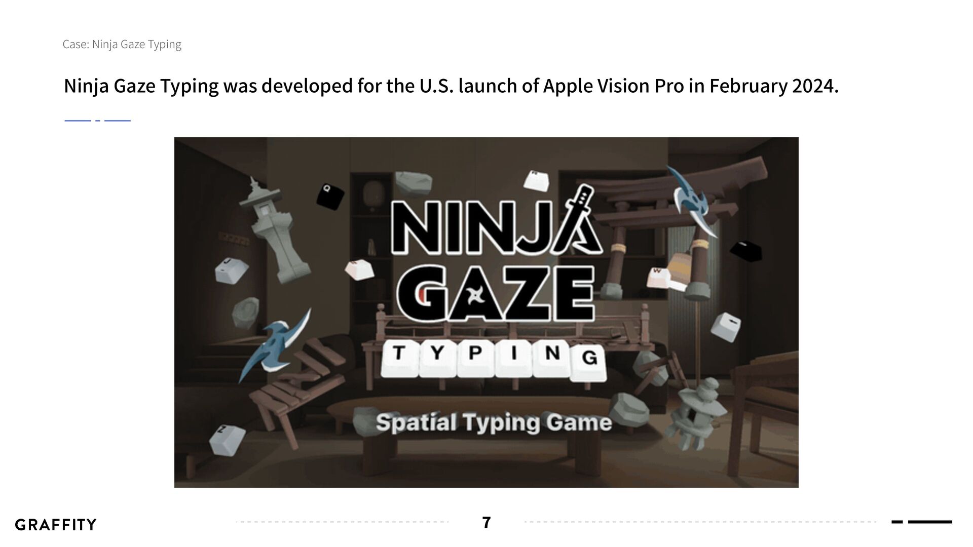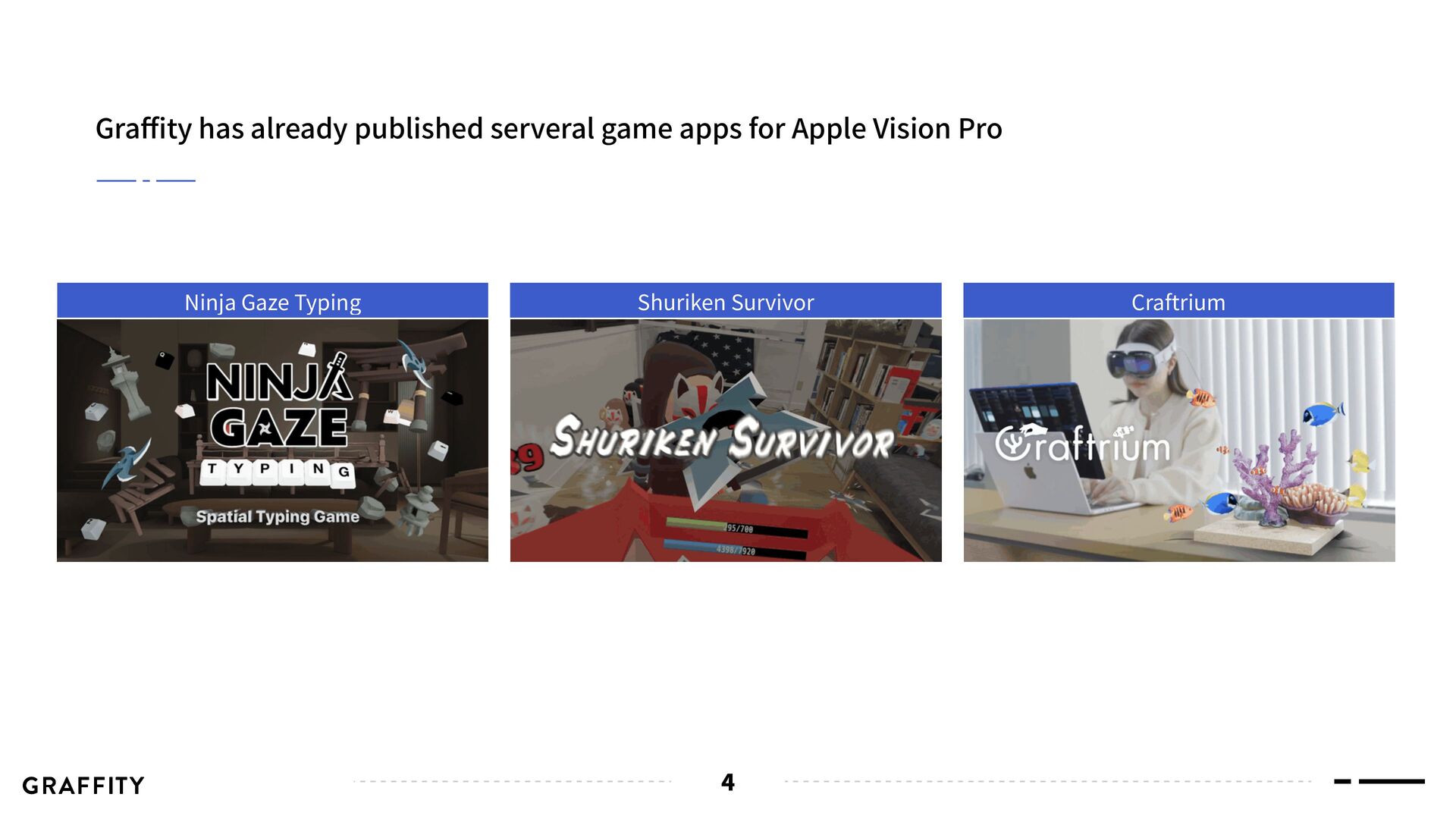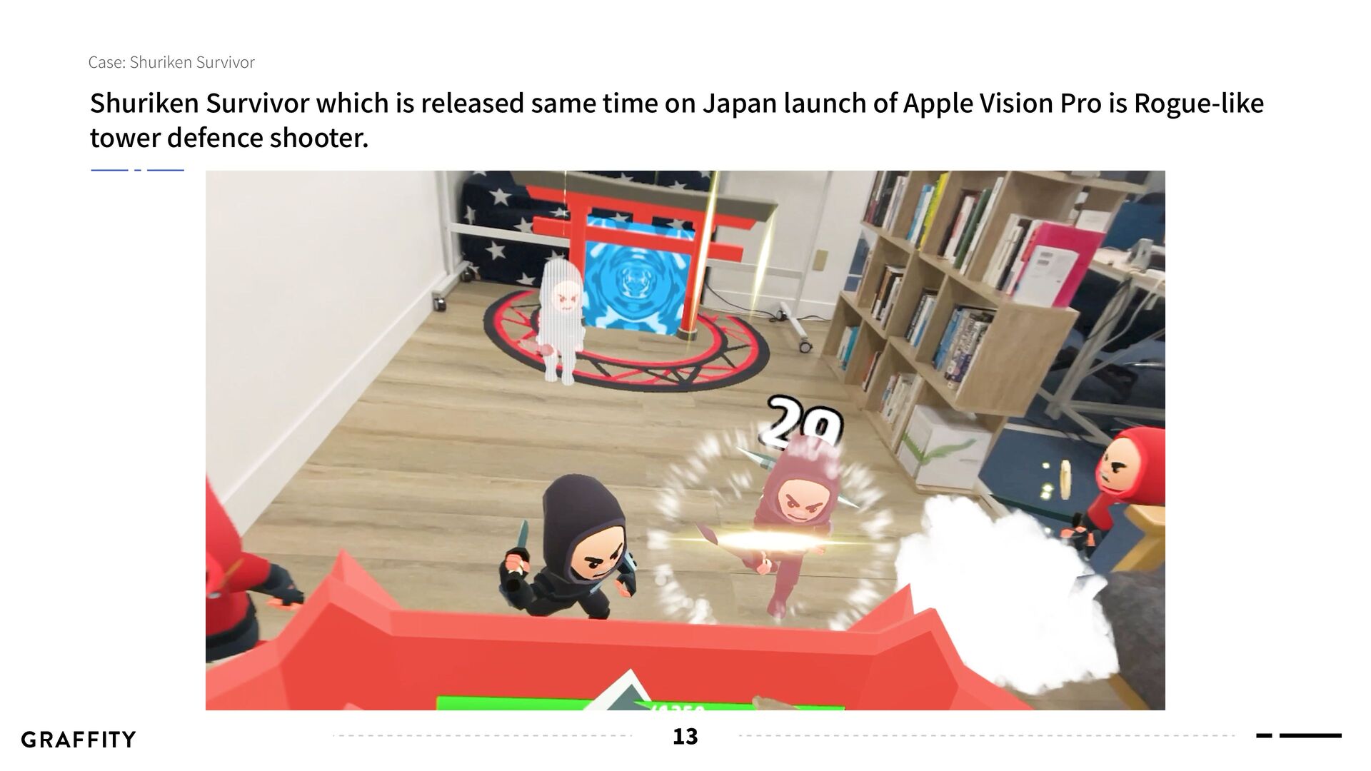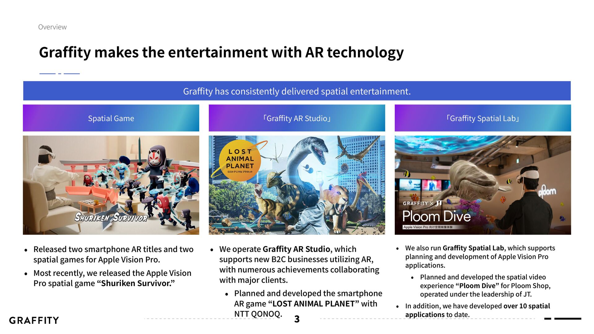 ffi ty has consistently delivered spatial entertainment. • Released two smartphone AR titles and two spatial games for Apple Vision Pro. • Most recently, we released the Apple Vision Pro spatial game “Shuriken Survivor.” • We operate Gra ffi ty AR Studio, which supports new B2C businesses utilizing AR, with numerous achievements collaborating with major clients. • Planned and developed the smartphone AR game “LOST ANIMAL PLANET” with NTT QONOQ. • We also run Gra ff i ty Spatial Lab, which supports planning and development of Apple Vision Pro applications. • Planned and developed the spatial video experience “Ploom Dive” for Ploom Shop, operated under the leadership of JT. • In addition, we have developed over 10 spatial applications to date. Spatial Game 「Gra ff i ty AR Studio」 「Gra ff i ty Spatial Lab」