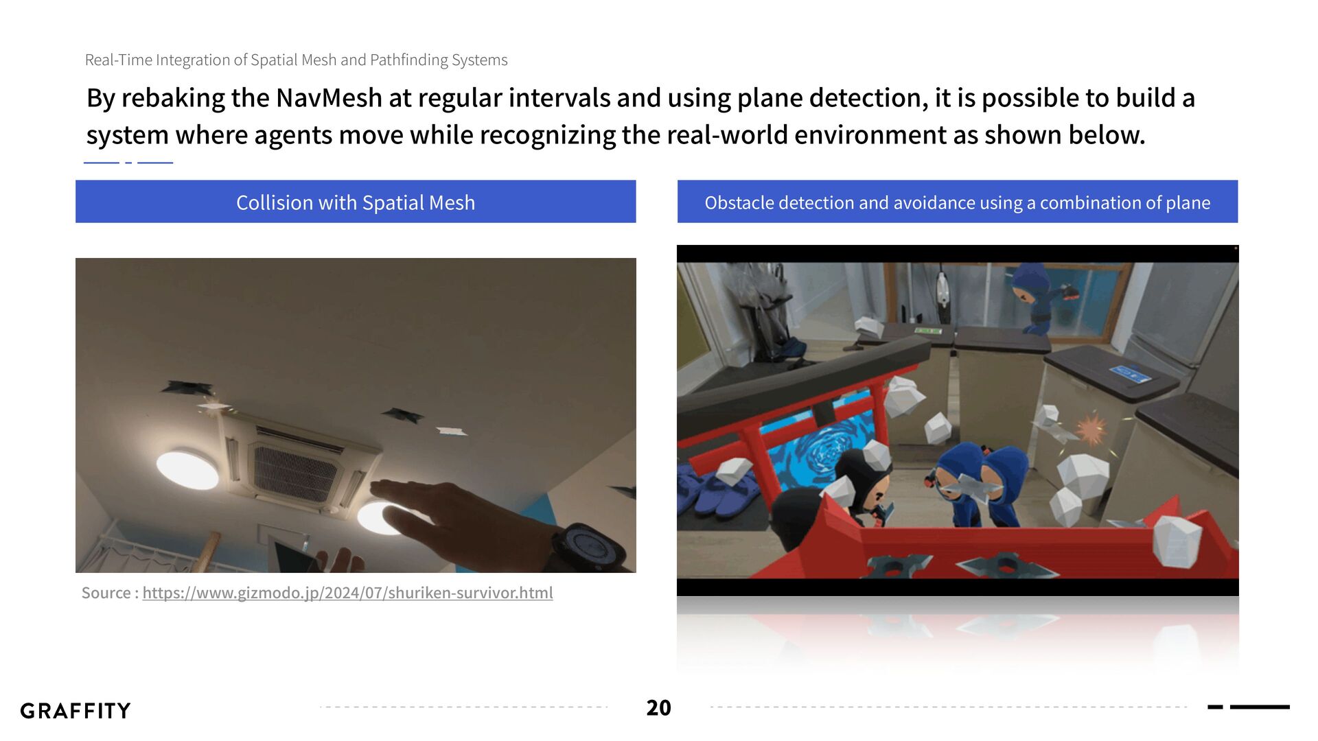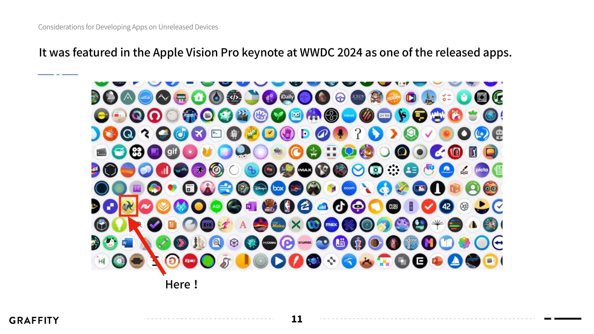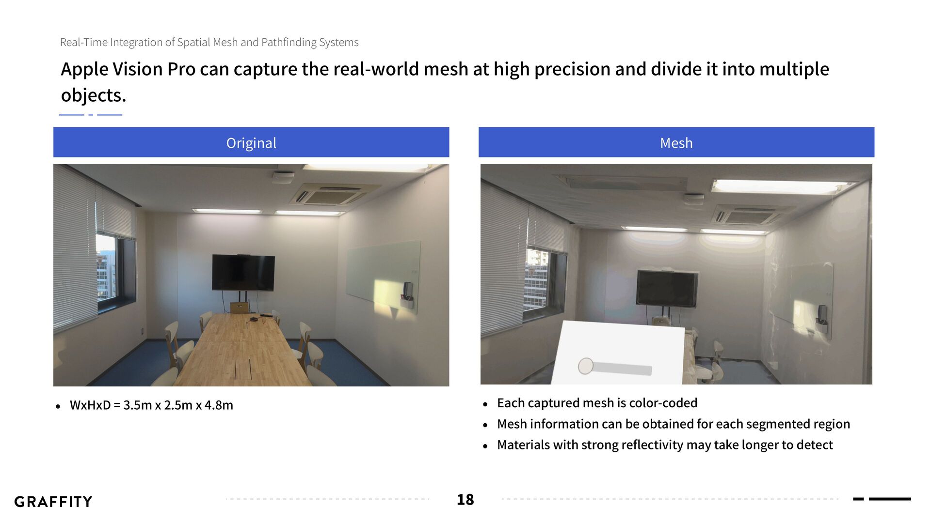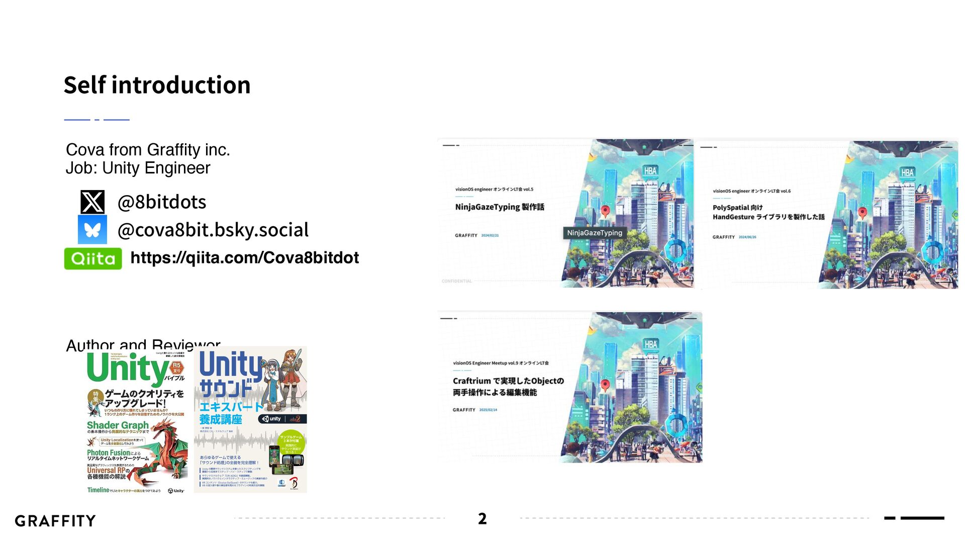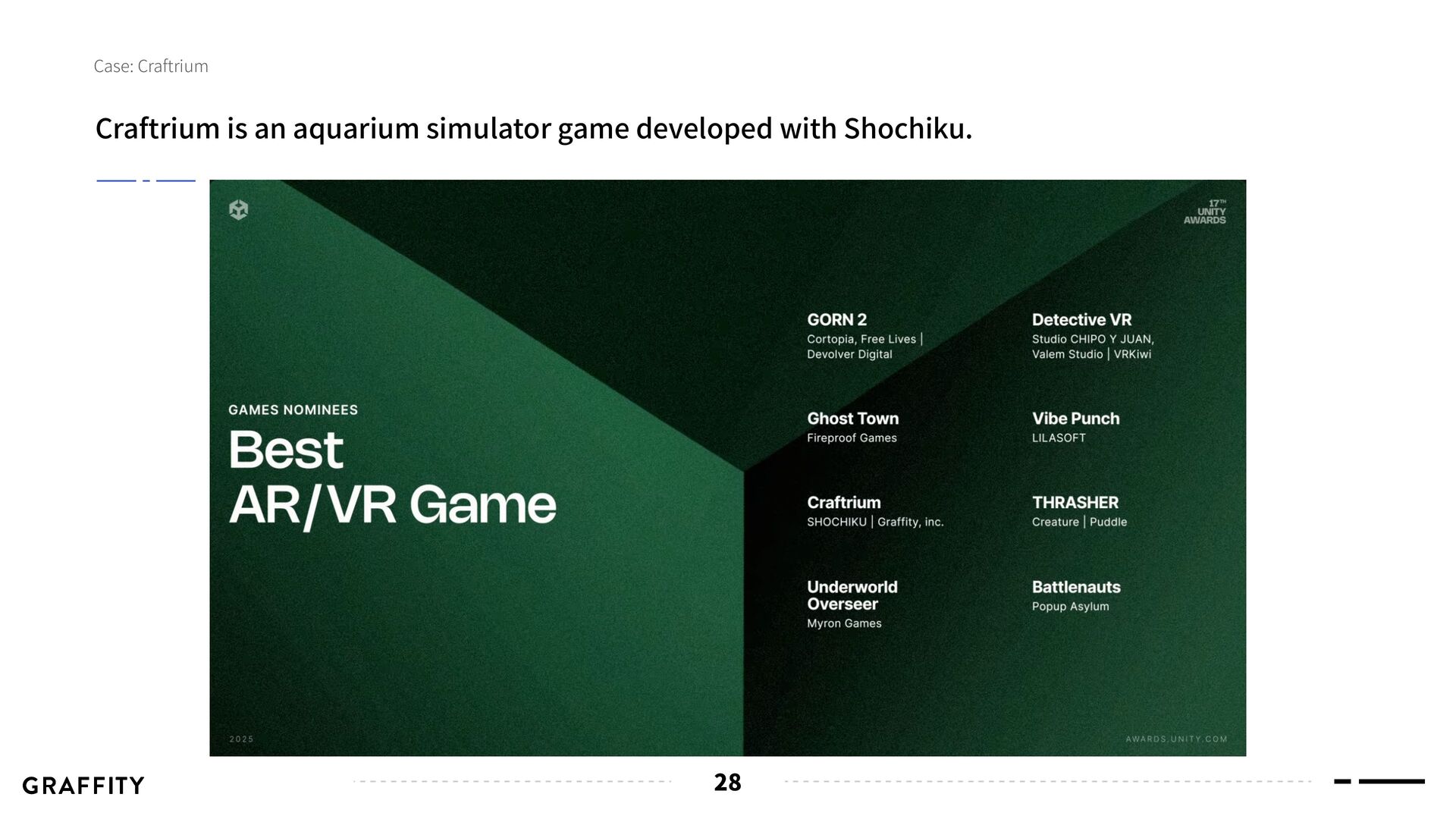 ffi ty has consistently delivered spatial entertainment. • Released two smartphone AR titles and two spatial games for Apple Vision Pro. • Most recently, we released the Apple Vision Pro spatial game “Shuriken Survivor.” • We operate Gra ffi ty AR Studio, which supports new B2C businesses utilizing AR, with numerous achievements collaborating with major clients. • Planned and developed the smartphone AR game “LOST ANIMAL PLANET” with NTT QONOQ. • We also run Gra ff i ty Spatial Lab, which supports planning and development of Apple Vision Pro applications. • Planned and developed the spatial video experience “Ploom Dive” for Ploom Shop, operated under the leadership of JT. • In addition, we have developed over 10 spatial applications to date. Spatial Game 「Gra ff i ty AR Studio」 「Gra ff i ty Spatial Lab」