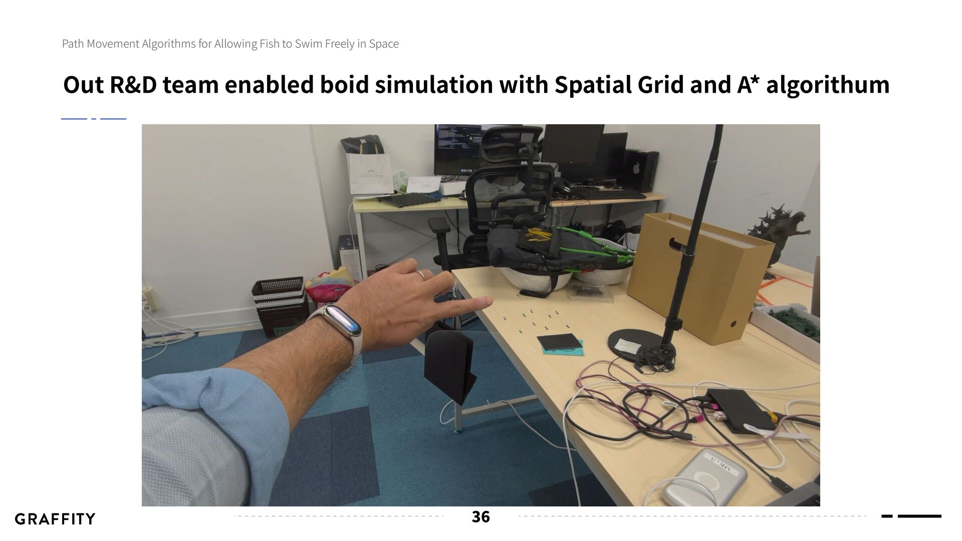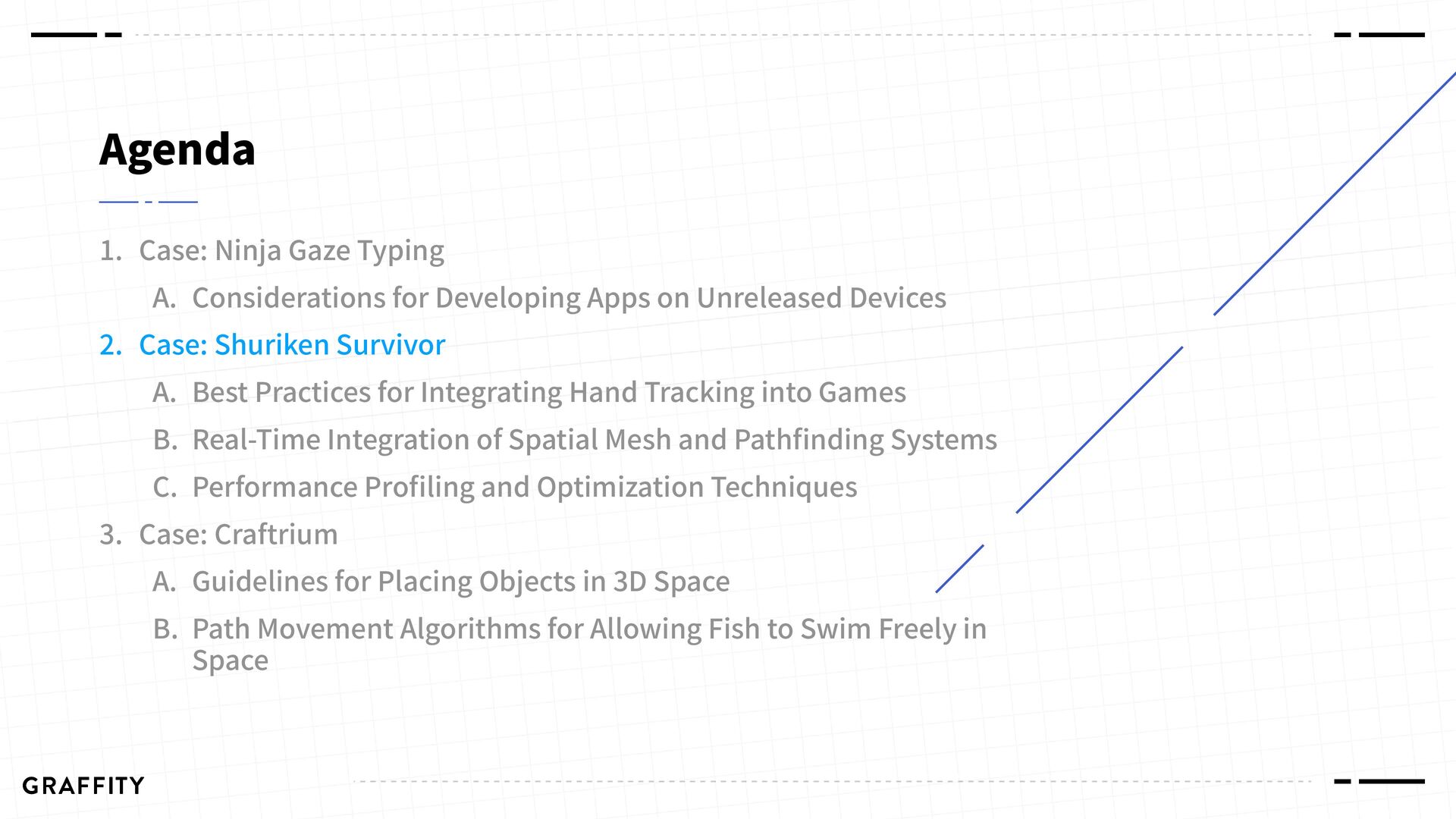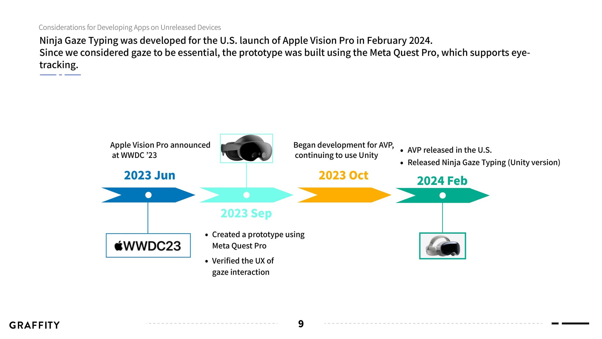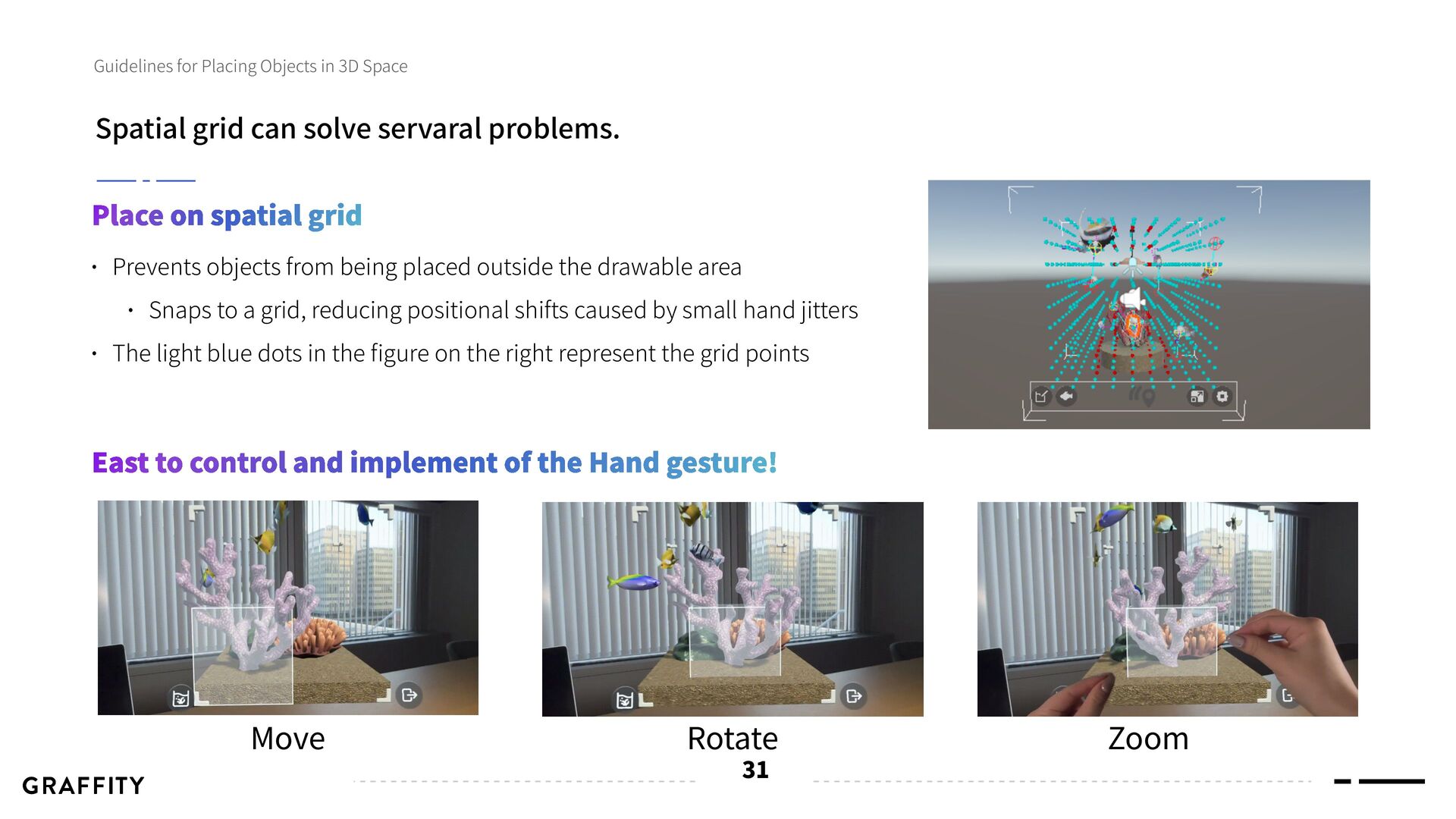 ffi ty has consistently delivered spatial entertainment. • Released two smartphone AR titles and two spatial games for Apple Vision Pro. • Most recently, we released the Apple Vision Pro spatial game “Shuriken Survivor.” • We operate Gra ffi ty AR Studio, which supports new B2C businesses utilizing AR, with numerous achievements collaborating with major clients. • Planned and developed the smartphone AR game “LOST ANIMAL PLANET” with NTT QONOQ. • We also run Gra ff i ty Spatial Lab, which supports planning and development of Apple Vision Pro applications. • Planned and developed the spatial video experience “Ploom Dive” for Ploom Shop, operated under the leadership of JT. • In addition, we have developed over 10 spatial applications to date. Spatial Game 「Gra ff i ty AR Studio」 「Gra ff i ty Spatial Lab」
