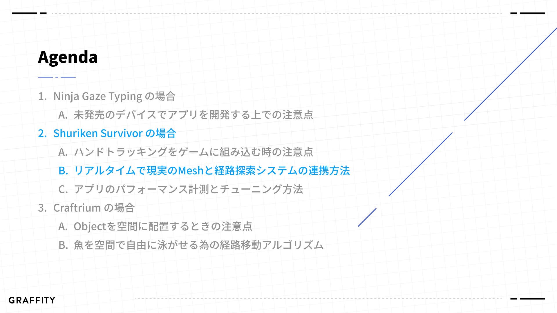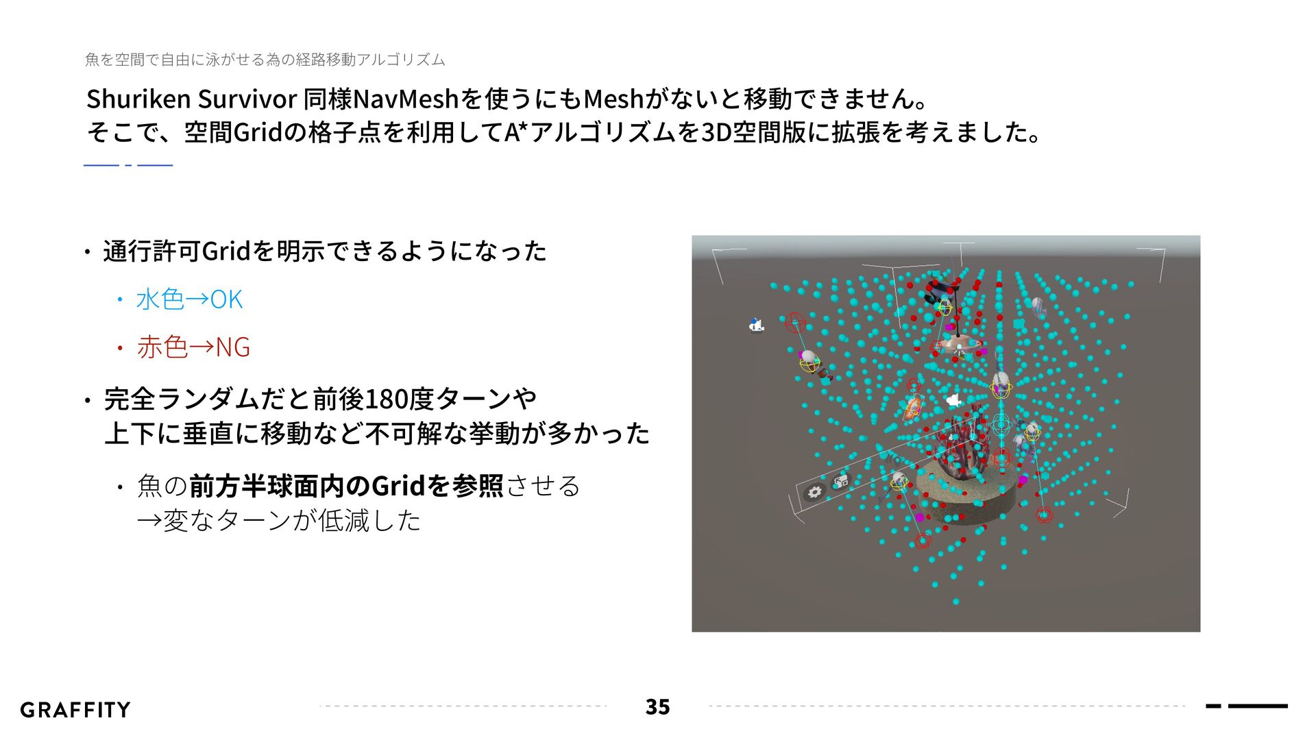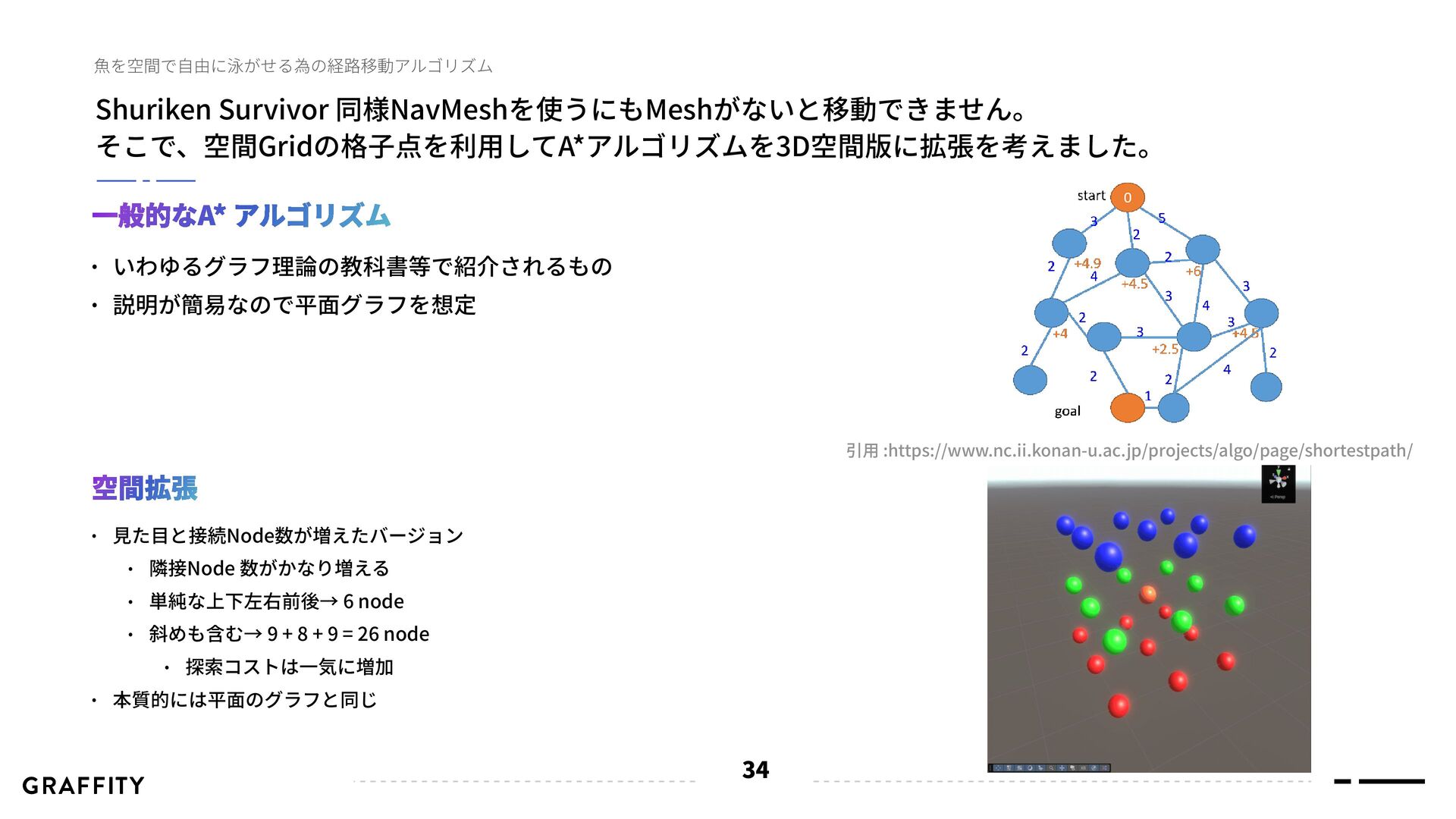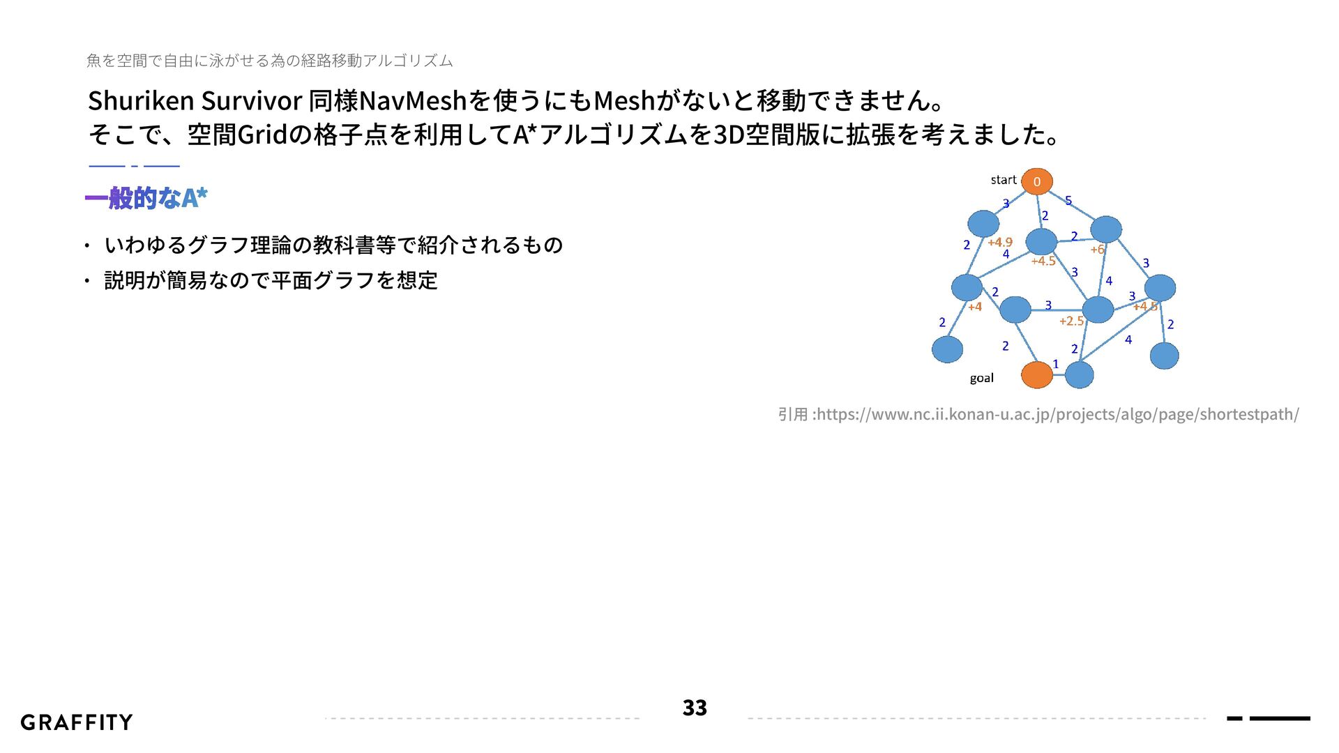 グラフを想定 • 見 た 目 と接続Node数が増えたバージョン • 隣接Node 数がかなり増える • 単純な上下左右前後→ 6 node • 斜めも含む→ 9 + 8 + 9 = 26 node • 探索コストは 一 気に増加 • 本質的には平 面 のグラフと同じ Shuriken Survivor 同様NavMeshを使うにもMeshがないと移動できません。 そこで、空間Gridの格 子 点を利 用 してA*アルゴリズムを3D空間版に拡張を考えました。 魚 を空間で 自 由に泳がせる為の経路移動アルゴリズム 引 用 :https://www.nc.ii.konan-u.ac.jp/projects/algo/page/shortestpath/