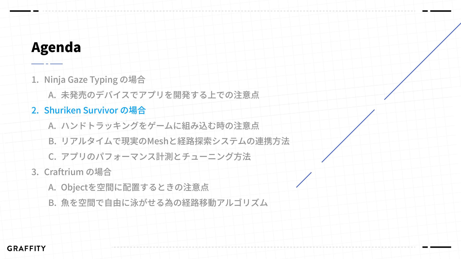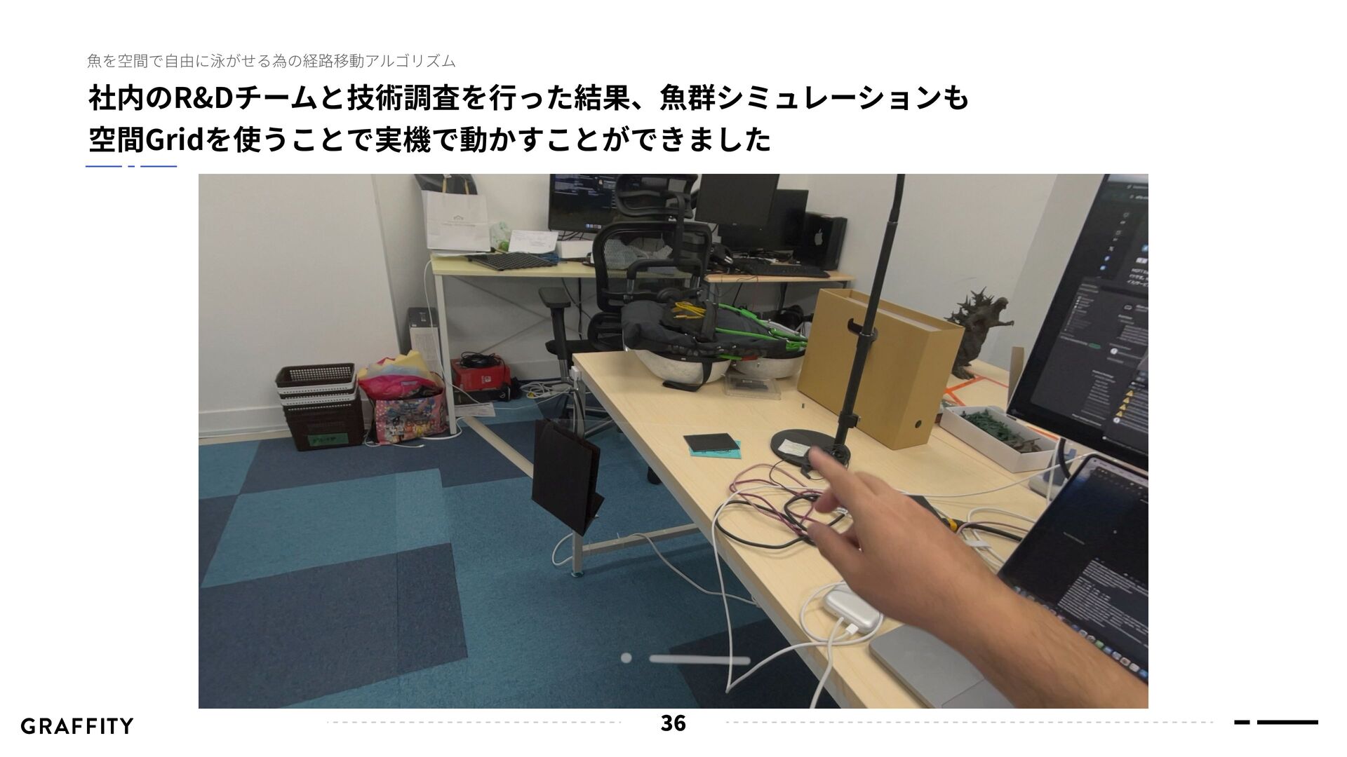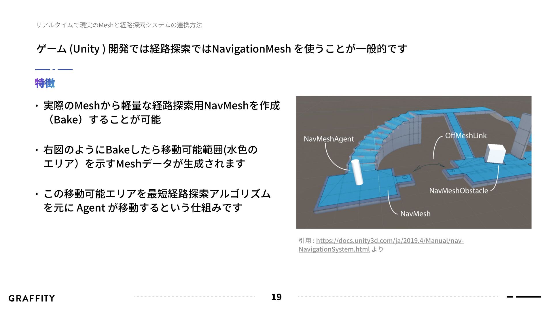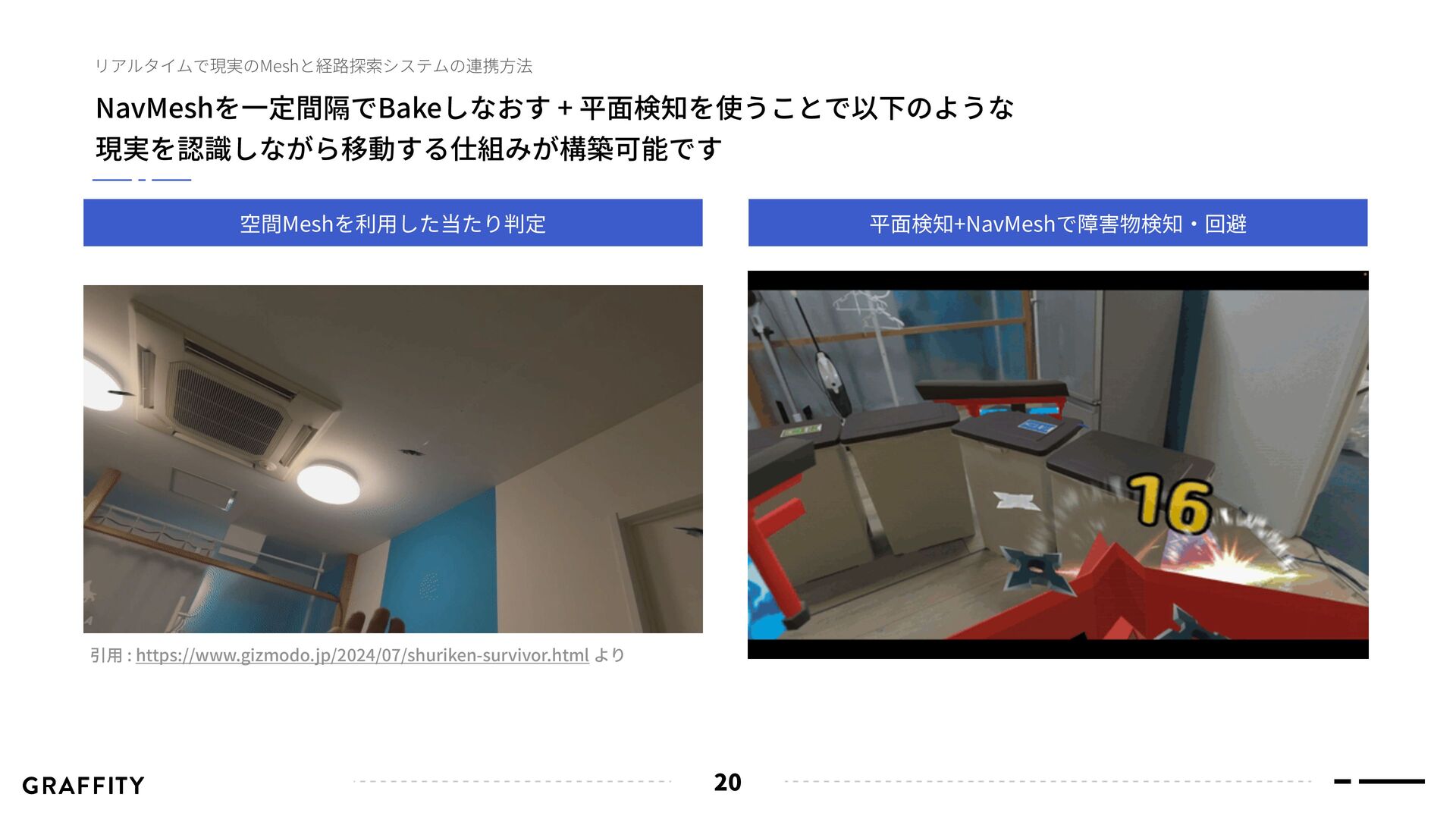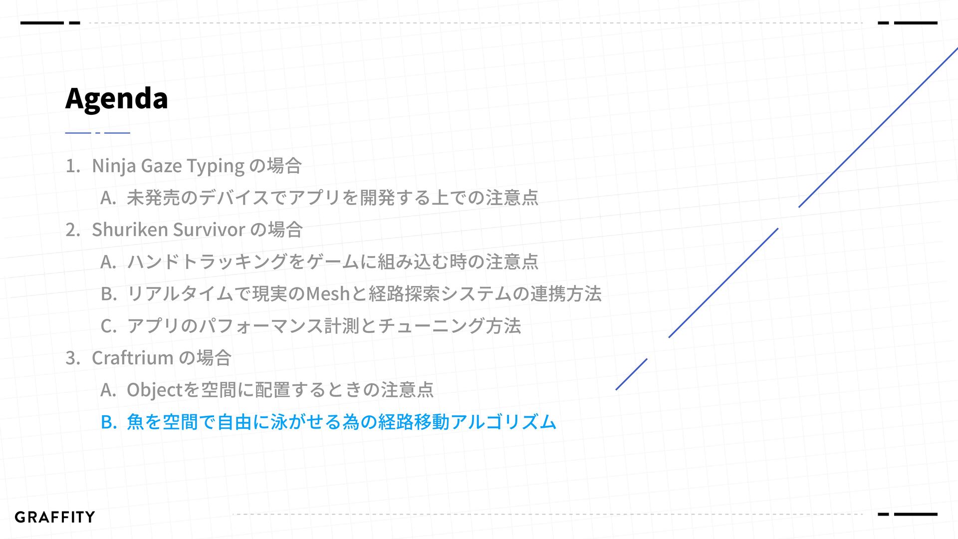 グラフを想定 • 見 た 目 と接続Node数が増えたバージョン • 隣接Node 数がかなり増える • 単純な上下左右前後→ 6 node • 斜めも含む→ 9 + 8 + 9 = 26 node • 探索コストは 一 気に増加 • 本質的には平 面 のグラフと同じ Shuriken Survivor 同様NavMeshを使うにもMeshがないと移動できません。 そこで、空間Gridの格 子 点を利 用 してA*アルゴリズムを3D空間版に拡張を考えました。 魚 を空間で 自 由に泳がせる為の経路移動アルゴリズム 引 用 :https://www.nc.ii.konan-u.ac.jp/projects/algo/page/shortestpath/