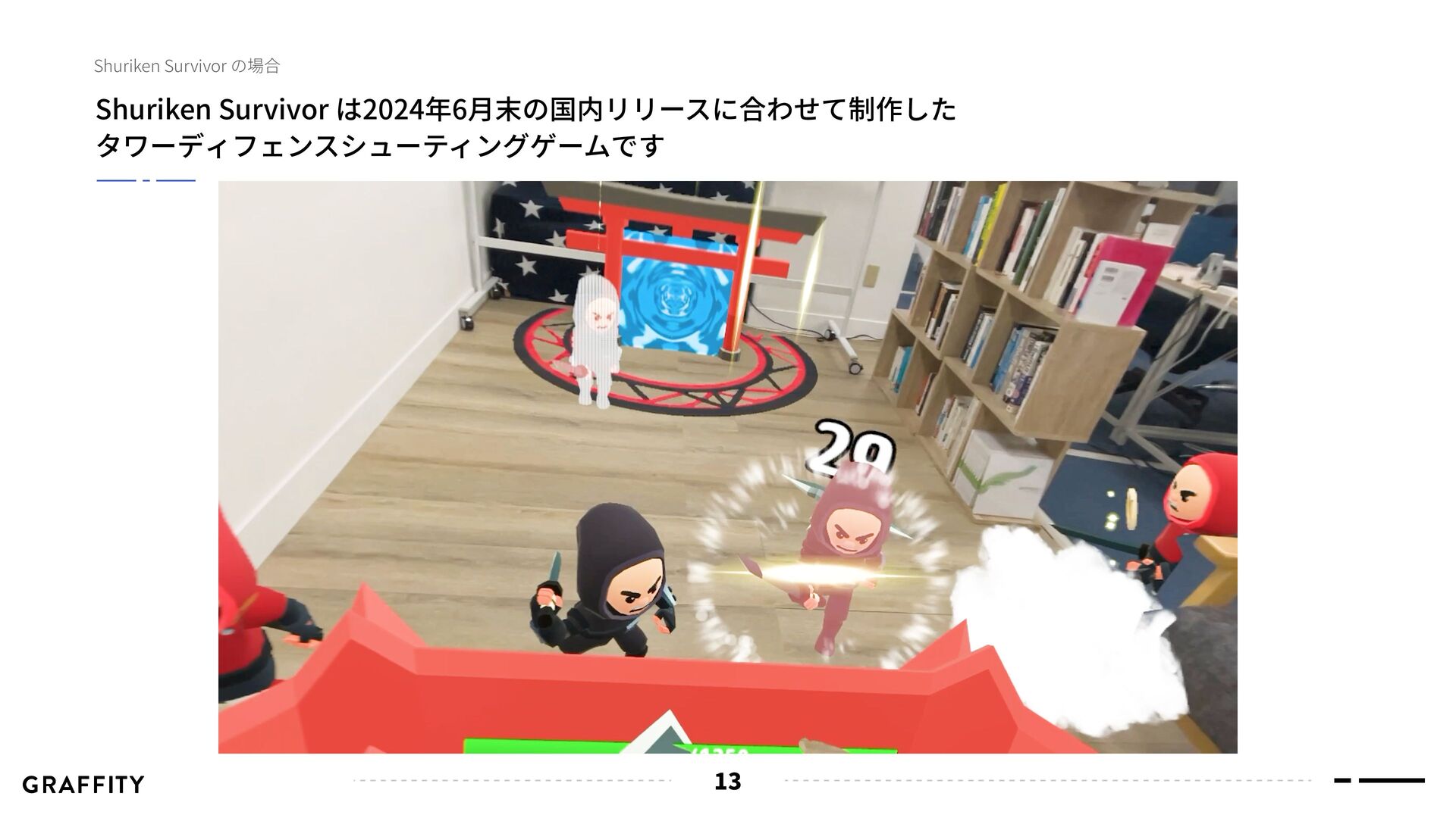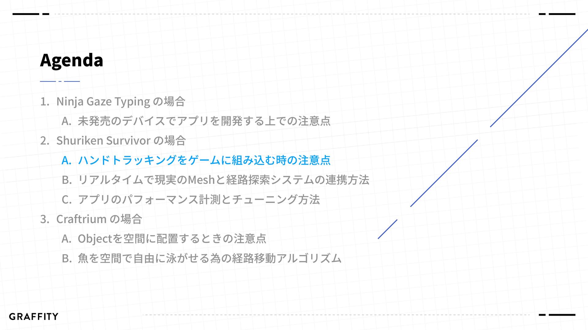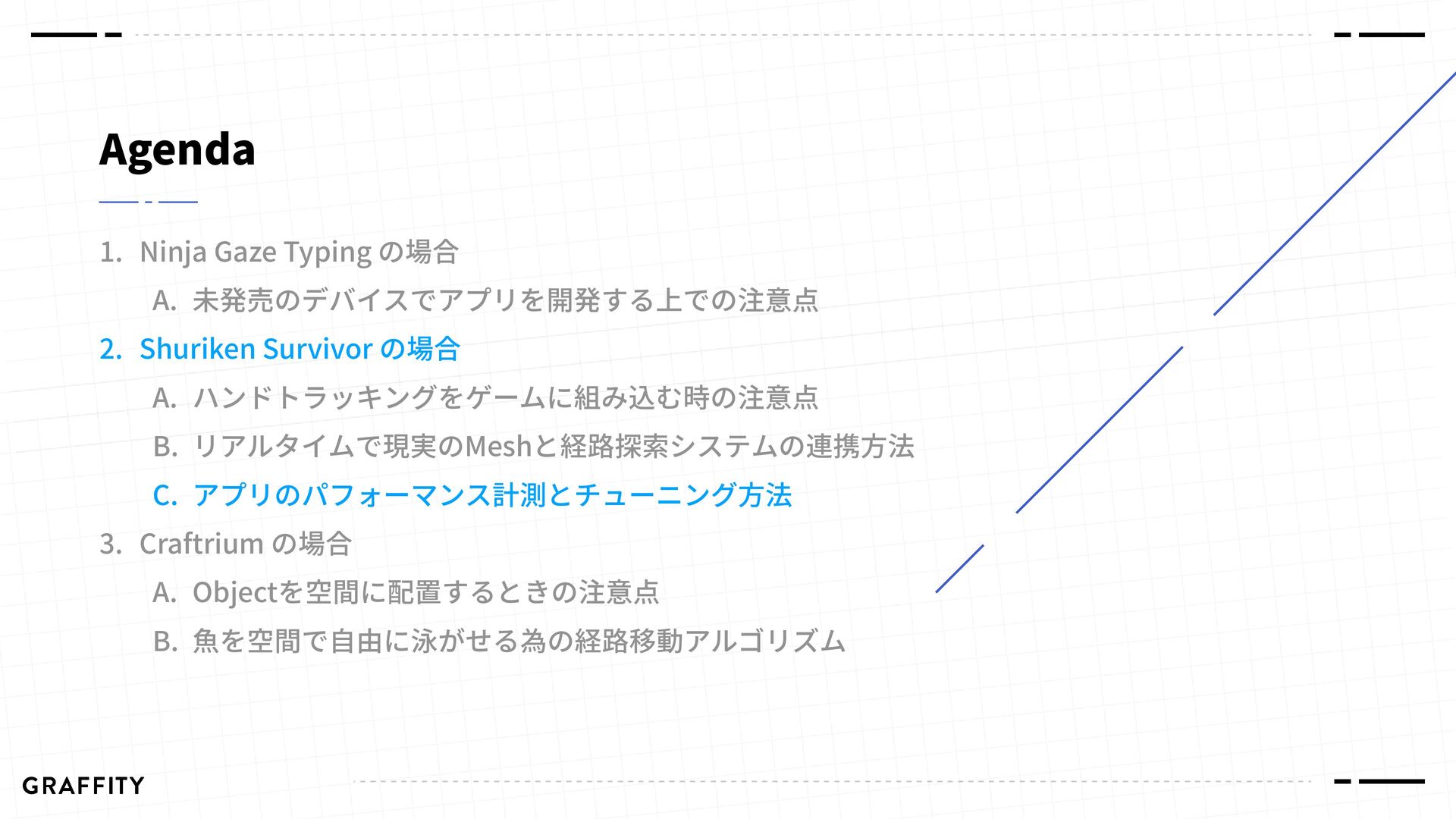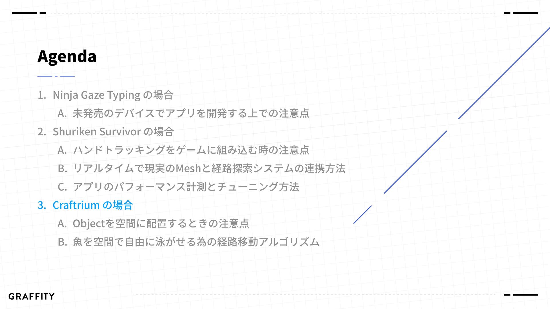 グラフを想定 • 見 た 目 と接続Node数が増えたバージョン • 隣接Node 数がかなり増える • 単純な上下左右前後→ 6 node • 斜めも含む→ 9 + 8 + 9 = 26 node • 探索コストは 一 気に増加 • 本質的には平 面 のグラフと同じ Shuriken Survivor 同様NavMeshを使うにもMeshがないと移動できません。 そこで、空間Gridの格 子 点を利 用 してA*アルゴリズムを3D空間版に拡張を考えました。 魚 を空間で 自 由に泳がせる為の経路移動アルゴリズム 引 用 :https://www.nc.ii.konan-u.ac.jp/projects/algo/page/shortestpath/