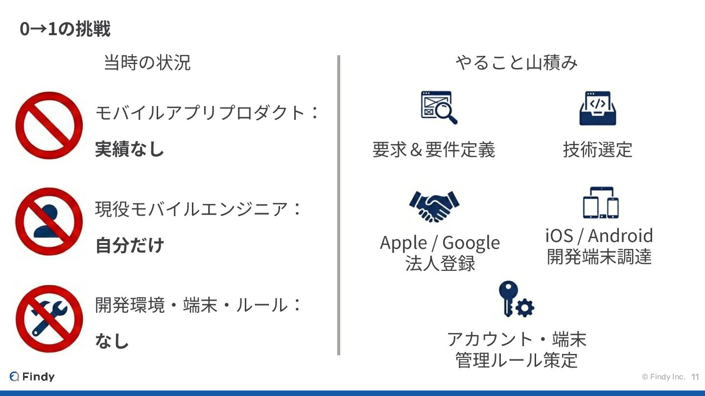 © Findy Inc. 12 0→1の挑戦 モバイルアプリプロダクト: 実績なし 現役モバイルエンジニア: ⾃分だけ 開発環境‧端末‧ルール: