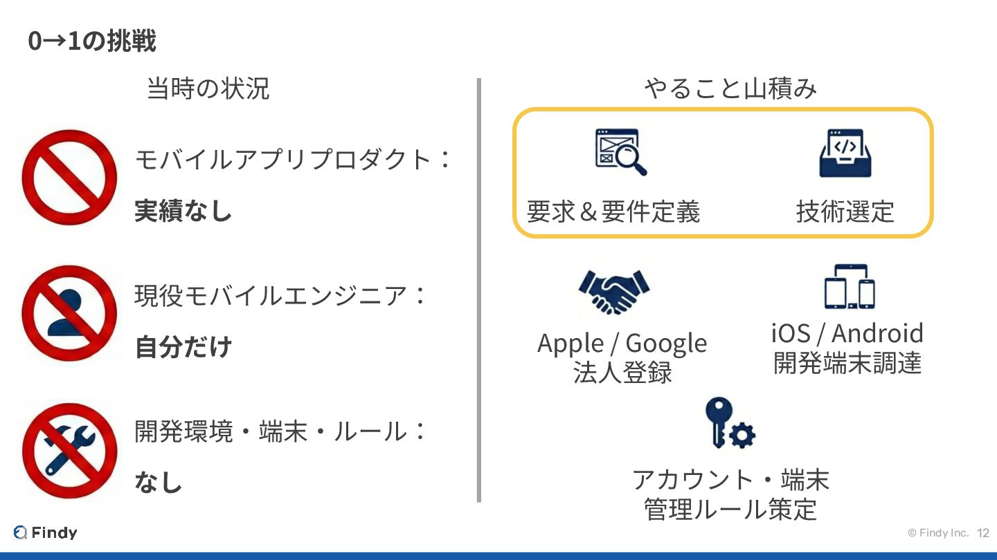 © Findy Inc. 11 0→1の挑戦 モバイルアプリプロダクト: 実績なし 現役モバイルエンジニア: ⾃分だけ 開発環境‧端末‧ルール: