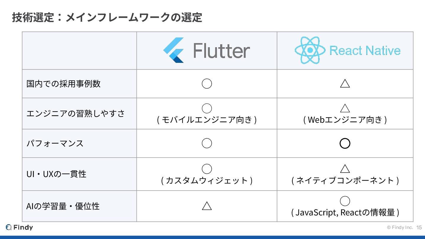 ( モバイルエンジニア向き ) △ ( Webエンジニア向き ) パフォーマンス ◯ ◯ UI‧UXの⼀貫性 ◯ ( カスタムウィジェット ) △ ( ネイティブコンポーネント ) AIの学習量‧優位性 △ ◯ ( JavaScript, Reactの情報量 )