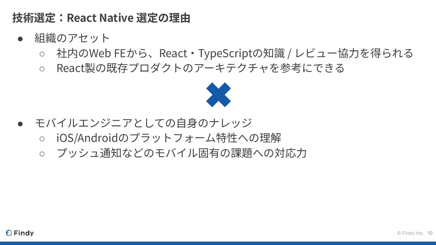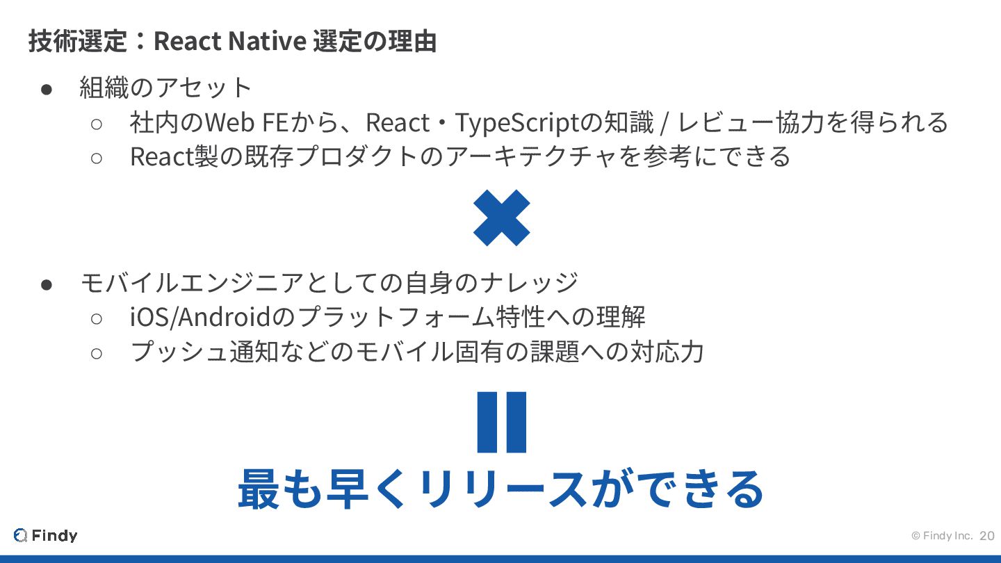 © Findy Inc. 19 技術選定:React Native 選定の理由 • 組織のアセット ◦