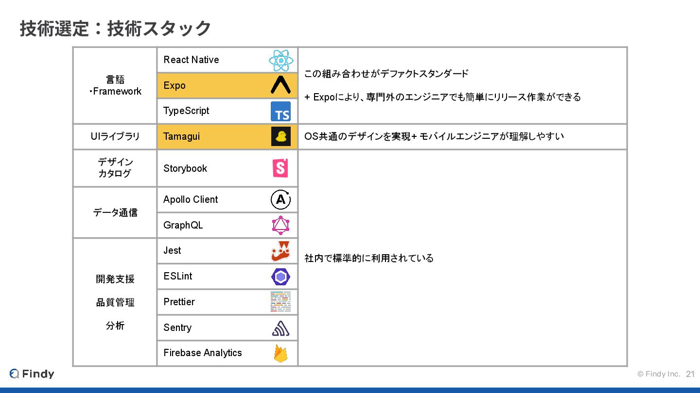 © Findy Inc. 20 技術選定:React Native 選定の理由 • 組織のアセット ◦