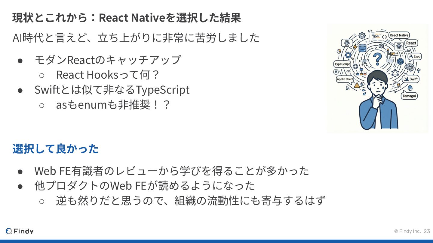 © Findy Inc. 23 現状とこれから:React Nativeを選択した結果 AI時代と⾔えど、⽴ち上がりに⾮常に苦労しました • モダンReactのキャッチアップ ◦