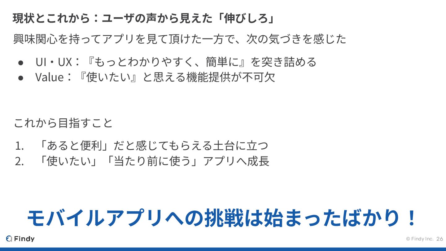 © Findy Inc. 25 現状とこれから:ユーザの声から⾒えた「伸びしろ」 興味関⼼を持ってアプリを⾒て頂けた⼀⽅で、次の気づきを感じた • UI‧UX:『もっとわかりやすく、簡単に』を突き詰める • Value:『使いたい』と思える機能提供が不可⽋