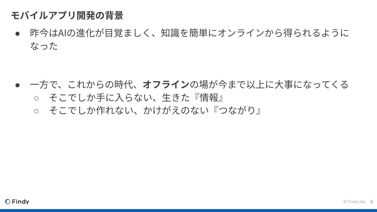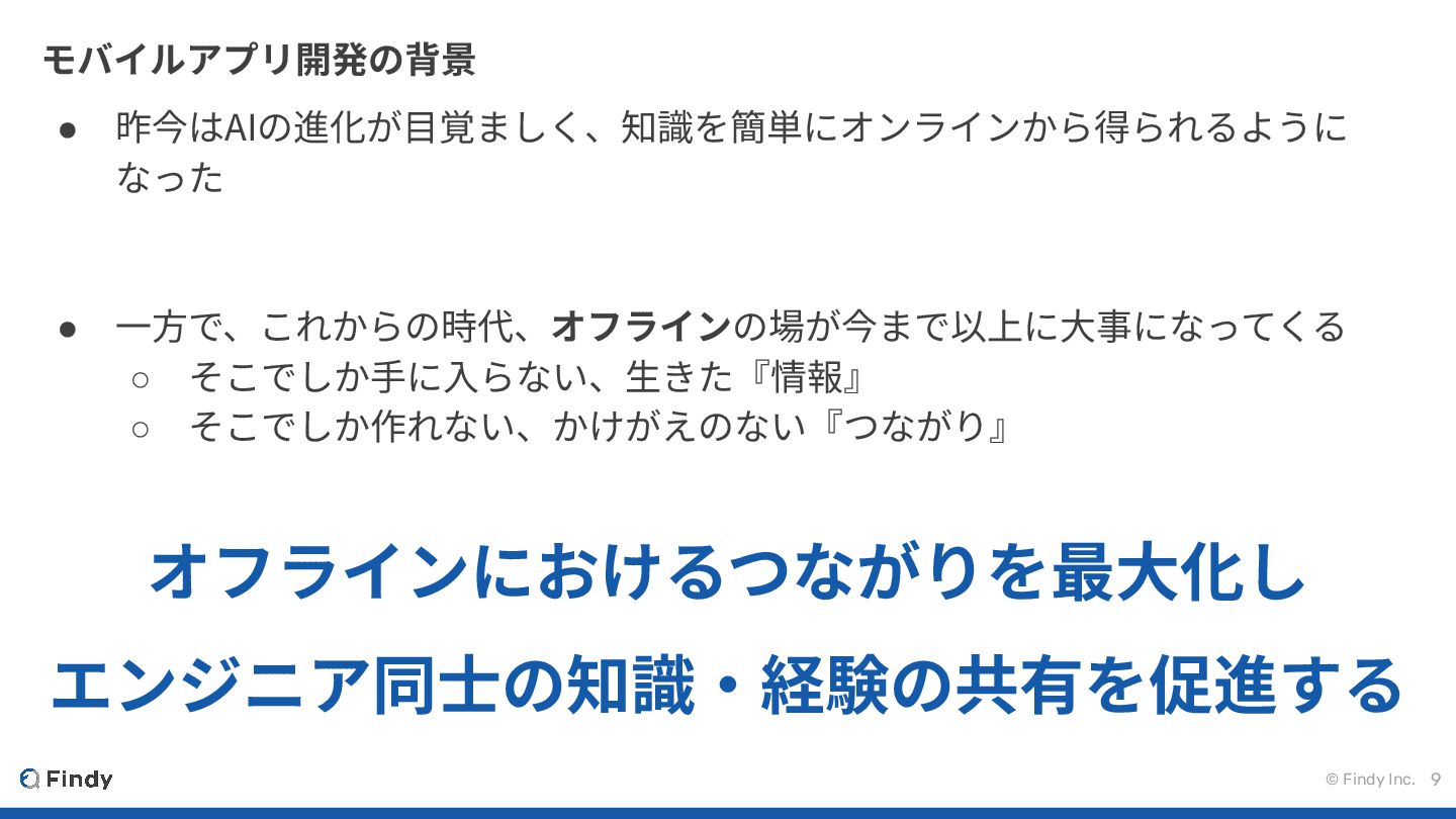© Findy Inc. 8 モバイルアプリ開発の背景 • 昨今はAIの進化が⽬覚ましく、知識を簡単にオンラインから得られるように なった • ⼀⽅で、これからの時代、オフラインの場が今まで以上に⼤事になってくる