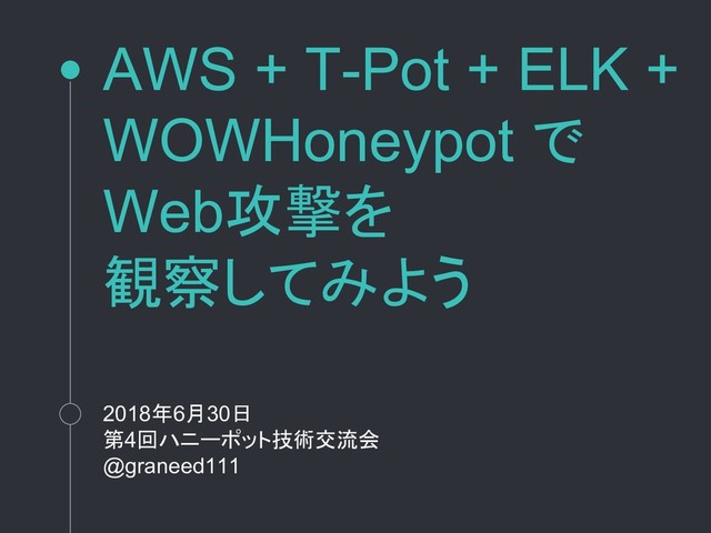null, "_source": { "ip_rep": "known attacker", "t-pot_hostname": "massshoemaker", "http_uri": "/", "geoip": { "as_org": "Aljeel Aljadeed for Technology", "timezone": "Africa/Tripoli", "ip": "YYY.YYY.YYY.YYY", "latitude": 25, "country_name": "Libya", "country_code2": "LY", "continent_code": "AF", "country_code3": "LY", "location": { "lon": 17, "lat": 25 }, "asn": 37284, "longitude": 17 }, "t-pot_ip_int": "172.31.26.55", "message": "2018-06-13 16:21:55,148 (glastopf.glastopf) YYY.YYY.YYY.YYY requested GET / on cf9f13d55e26:80", "type": "Glastopf", "src_ip": "YYY.YYY.YYY.YYY", "t-pot_ip_ext": "XXX.XXX.XXX.XXX", "path": "/data/glastopf/log/glastopf.log", "@timestamp": "2018-06-13T16:21:55.148Z", "http_method": "GET", "@version": "1", "host": "83bc2b6ed990", "dest_port": 80 }, "fields": { "@timestamp": [ 1528906915148 ] }, "highlight": { "type": [ "@kibana-highlighted-field@Glastopf@/kibana-highlighted-field @" ] }, "sort": [ 1528906915148 ] } GlastopfでHTTP攻撃を観察する GlastopfからElasticSearchへの連携情報 情報が足りない! (HTTPヘッダーがない、POSTデータがない。) 34
