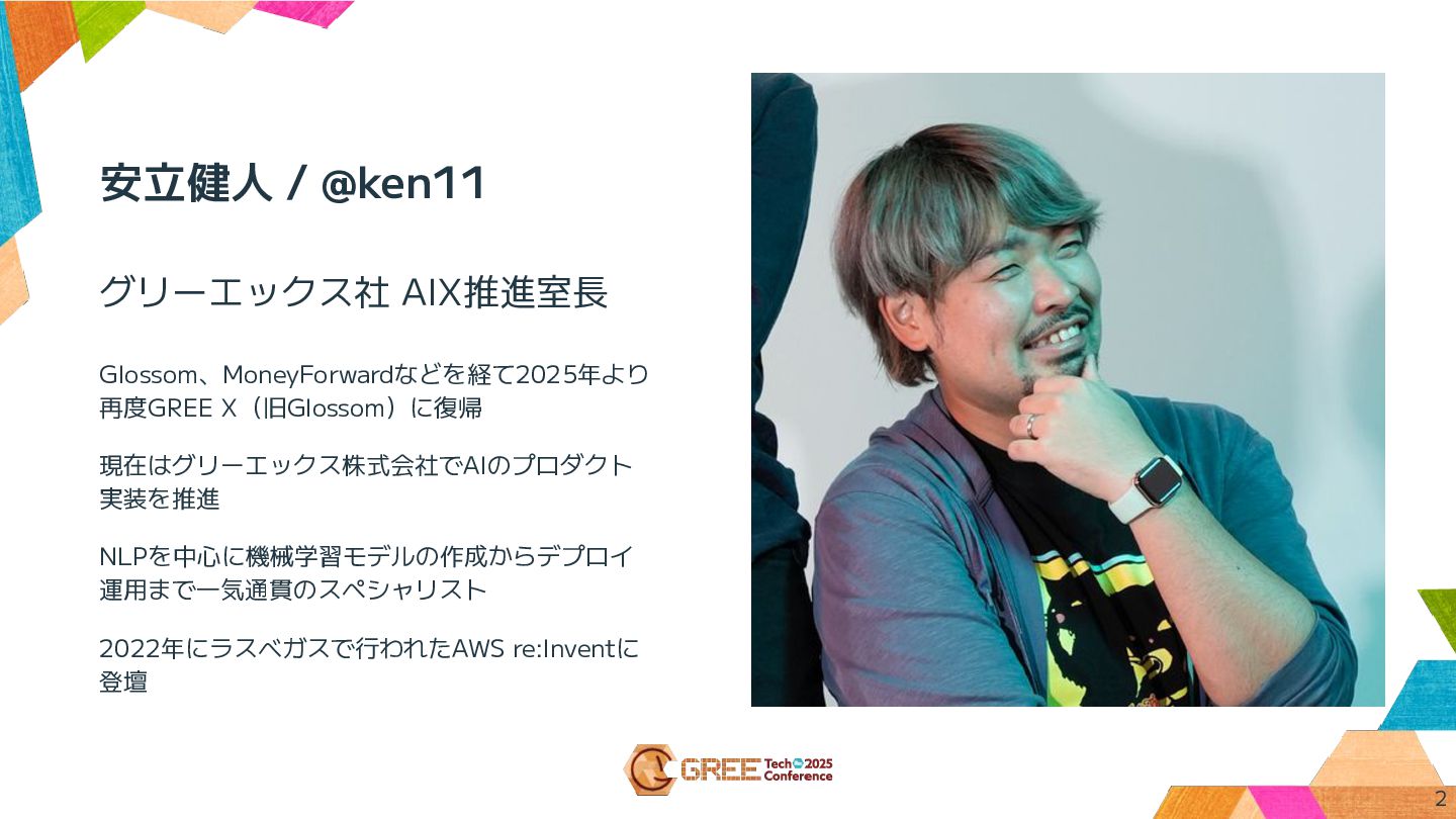 安立健人 / @ken11 Glossom、MoneyForwardなどを経て2025年より 再度GREE X(旧Glossom)に復帰 現在はグリーエックス株式会社でAIのプロダクト 実装を推進 NLPを中心に機械学習モデルの作成からデプロイ 運用まで一気通貫のスペシャリスト