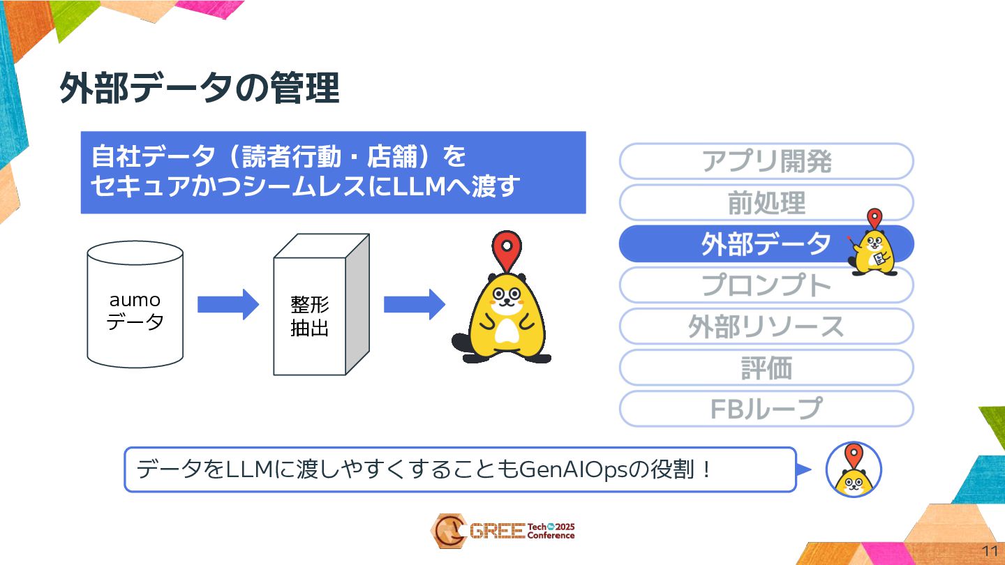 外部データの管理 11 データをLLMに渡しやすくすることもGenAIOpsの役割! 自社データ(読者行動・店舗)を セキュアかつシームレスにLLMへ渡す aumo データ 整形 抽出