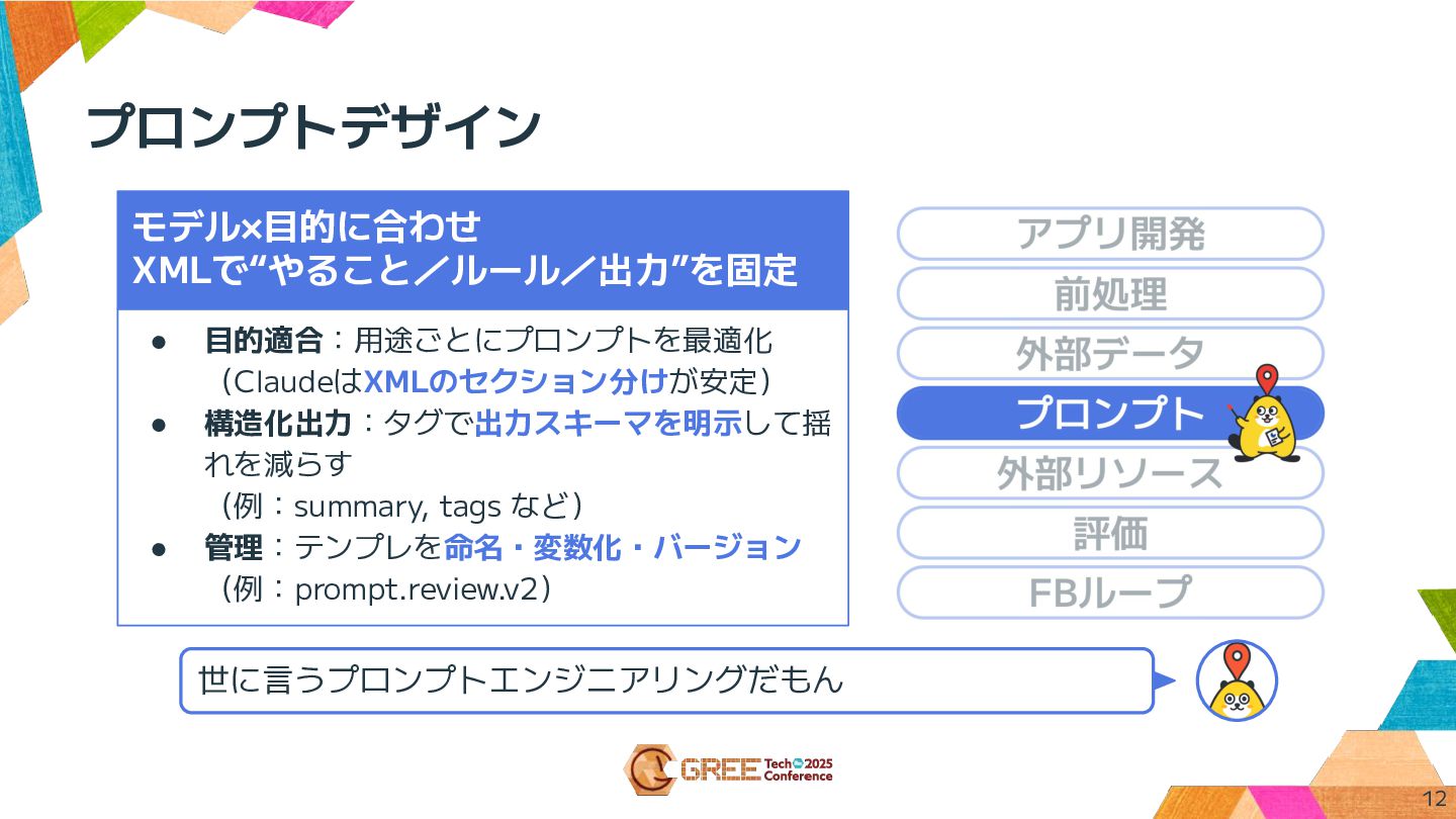 プロンプトデザイン 12 世に言うプロンプトエンジニアリングだもん • 目的適合:用途ごとにプロンプトを最適化 (ClaudeはXMLのセクション分けが安定) • 構造化出力:タグで出力スキーマを明示して揺 れを減らす (例:summary,