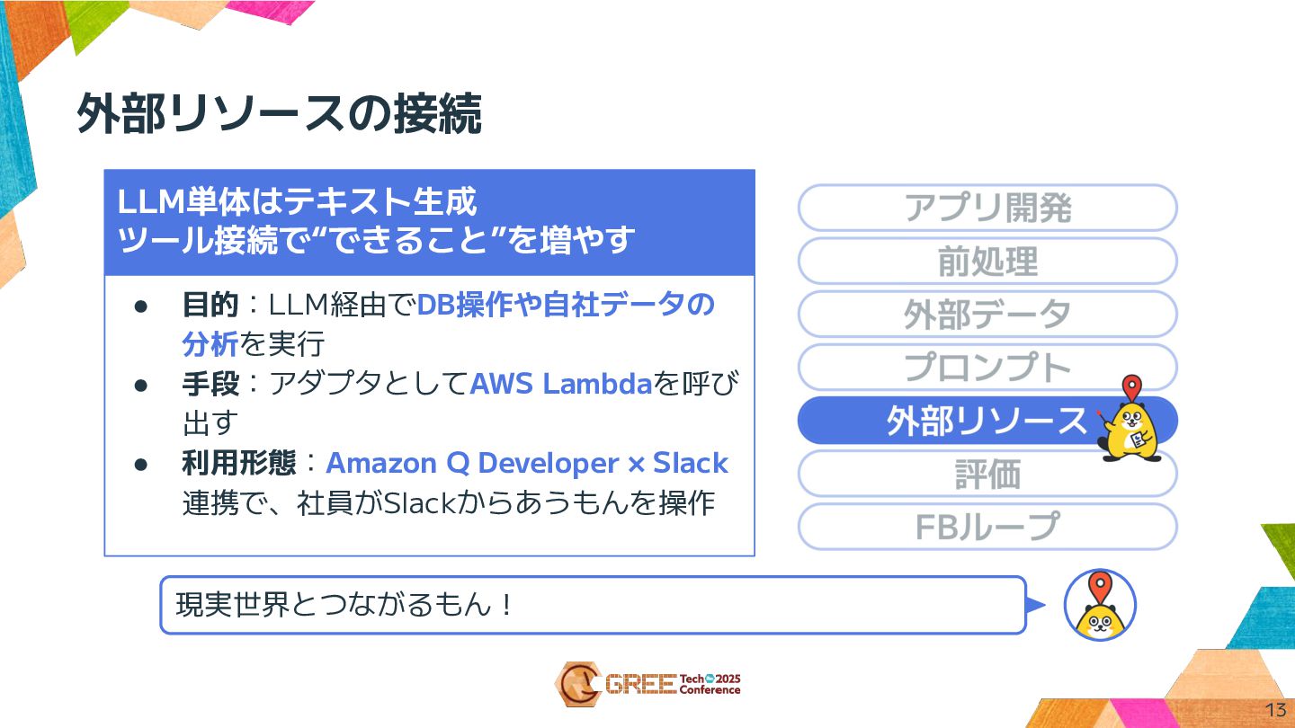 外部リソースの接続 13 現実世界とつながるもん! • 目的:LLM経由でDB操作や自社データの 分析を実行 • 手段:アダプタとしてAWS Lambdaを呼び 出す