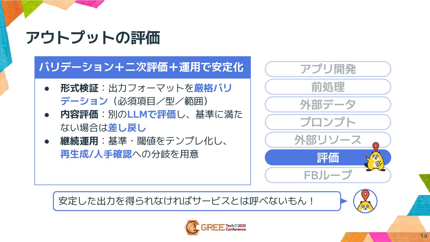 アウトプットの評価 14 安定した出力を得られなければサービスとは呼べないもん! • 形式検証:出力フォーマットを厳格バリ デーション(必須項目/型/範囲) • 内容評価:別のLLMで評価し、基準に満た ない場合は差し戻し •