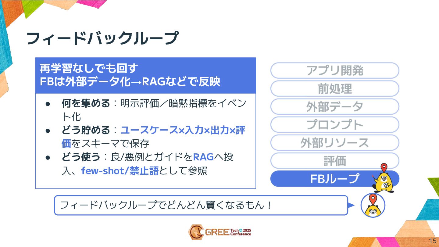 フィードバックループ 15 フィードバックループでどんどん賢くなるもん! • 何を集める:明示評価/暗黙指標をイベン ト化 • どう貯める:ユースケース×入力×出力×評 価をスキーマで保存 •