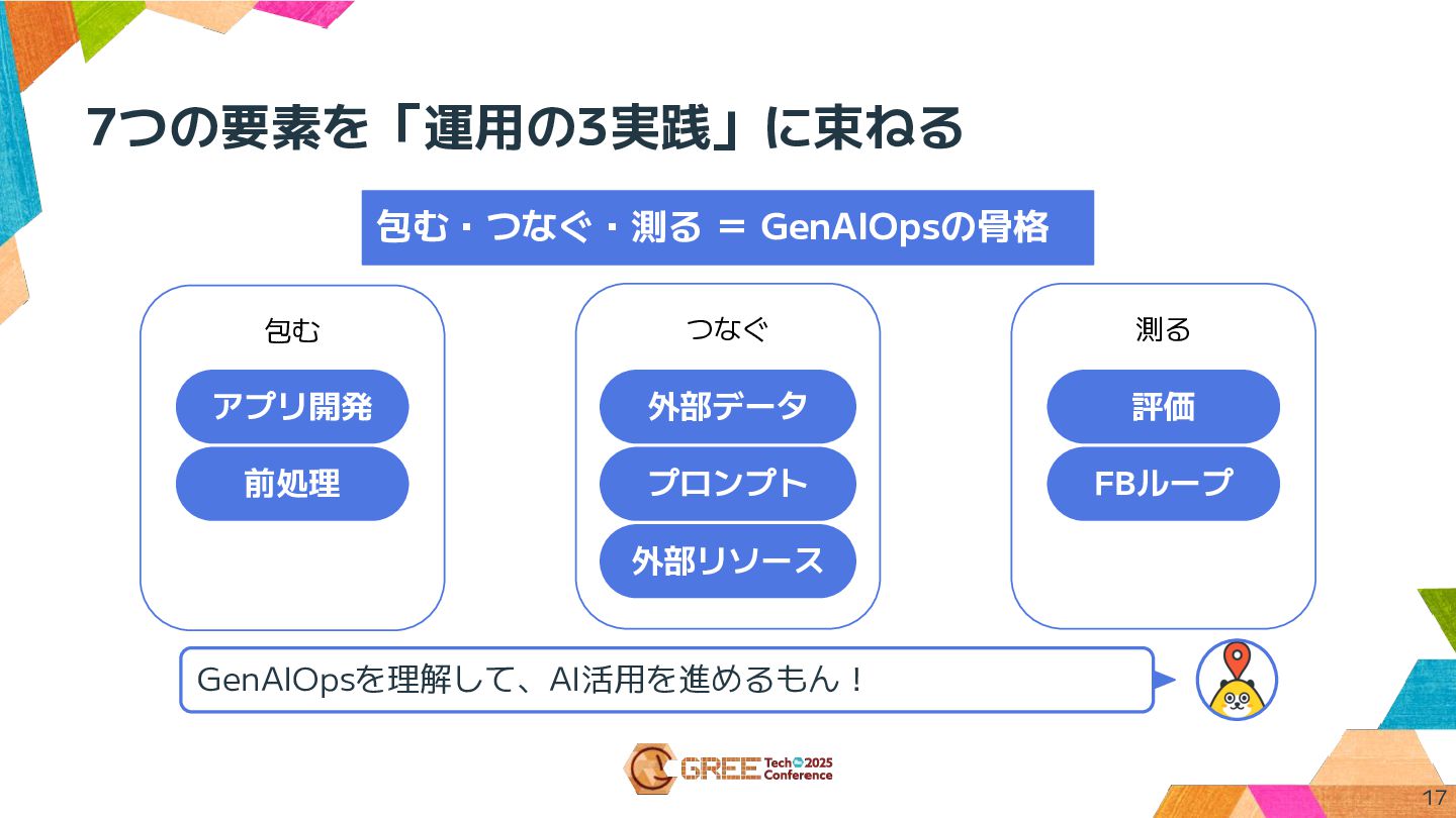 7つの要素を「運用の3実践」に束ねる 17 GenAIOpsを理解して、AI活用を進めるもん! 包む・つなぐ・測る = GenAIOpsの骨格 包む つなぐ 測る アプリ開発