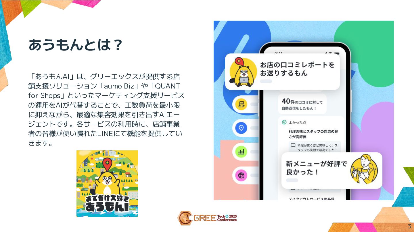 あうもんとは? 「あうもんAI」は、グリーエックスが提供する店 舗支援ソリューション「aumo Biz」や「QUANT for Shops」といったマーケティング支援サービス の運用をAIが代替することで、工数負荷を最小限 に抑えながら、最適な集客効果を引き出すAIエー ジェントです。各サービスの利用時に、店舗事業 者の皆様が使い慣れたLINEにて機能を提供してい