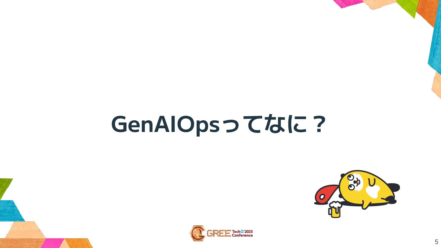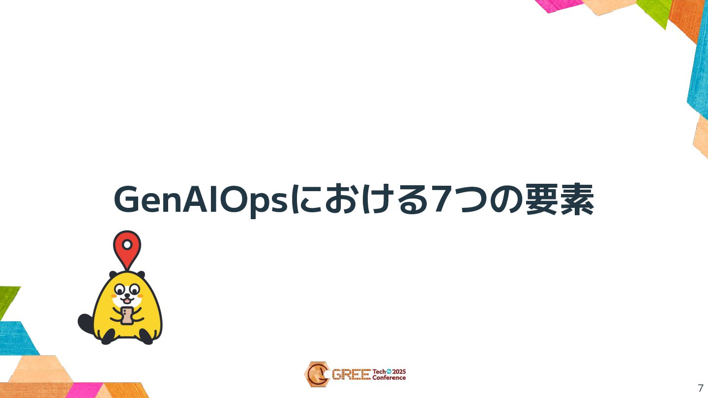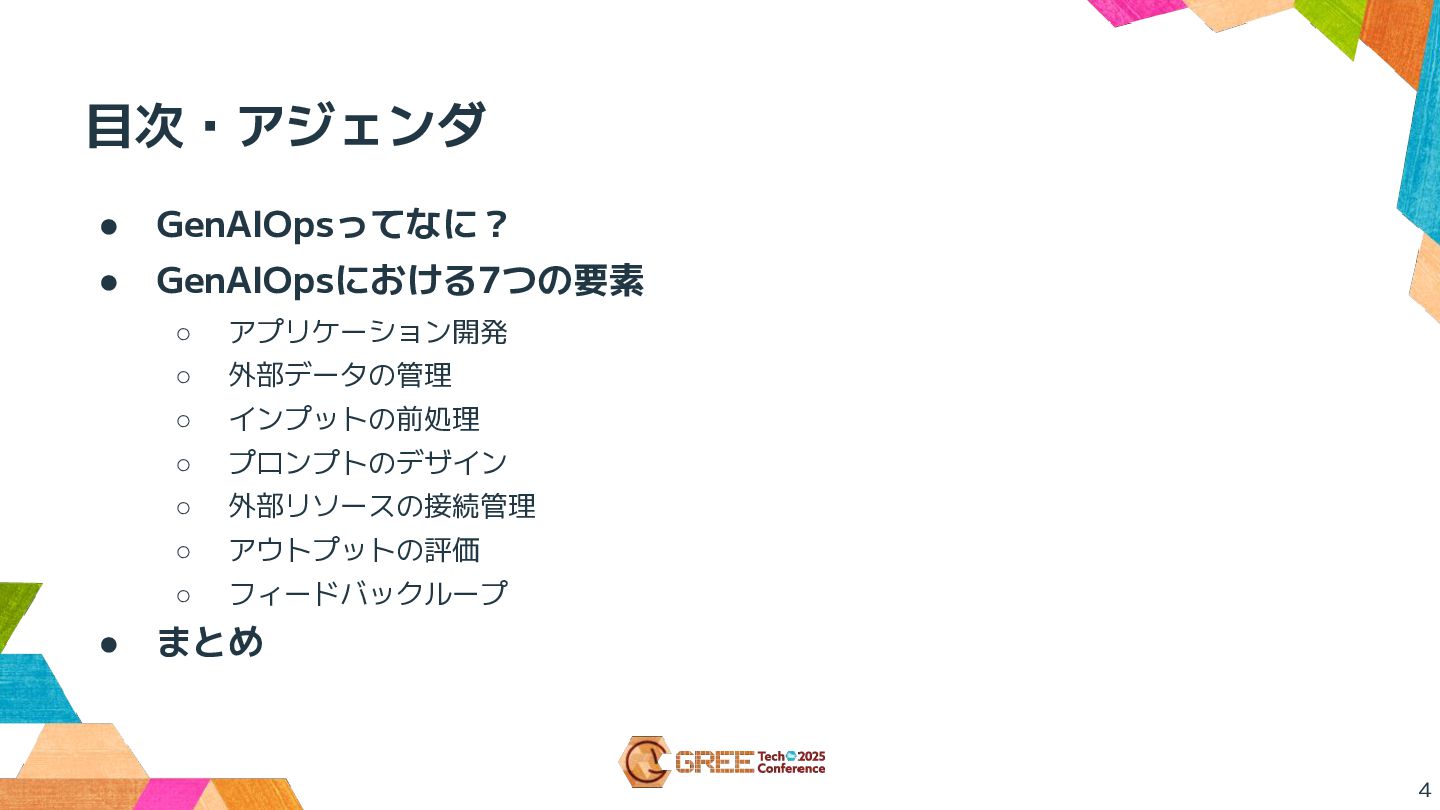 目次・アジェンダ • GenAIOpsってなに? • GenAIOpsにおける7つの要素 ◦ アプリケーション開発 ◦ 外部データの管理 ◦