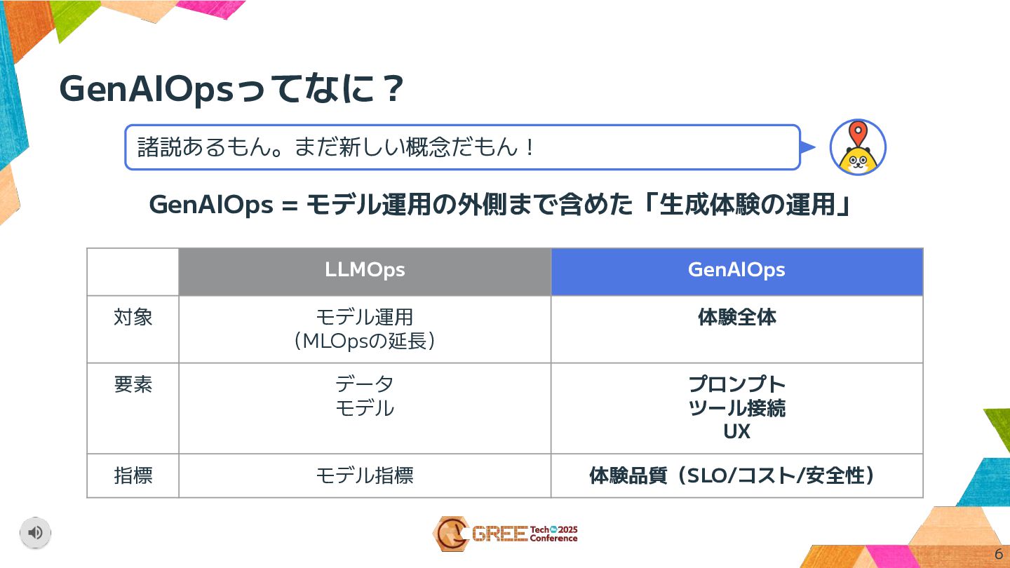 ツール接続 UX 指標 モデル指標 体験品質(SLO/コスト/安全性) GenAIOpsってなに? GenAIOps = モデル運用の外側まで含めた「生成体験の運用」 6 諸説あるもん。まだ新しい概念だもん!