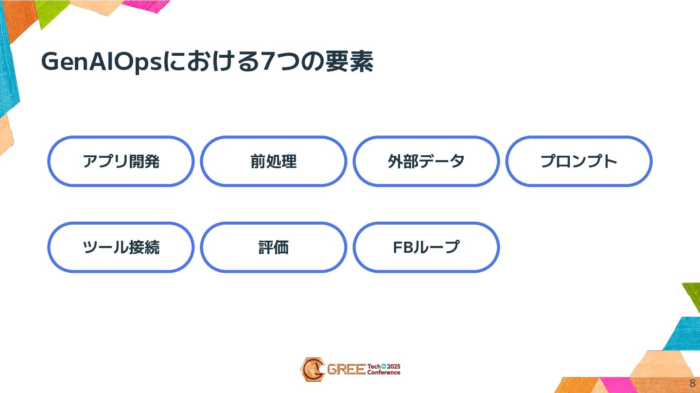 GenAIOpsにおける7つの要素 8 アプリ開発 前処理 外部データ プロンプト ツール接続 評価 FBループ